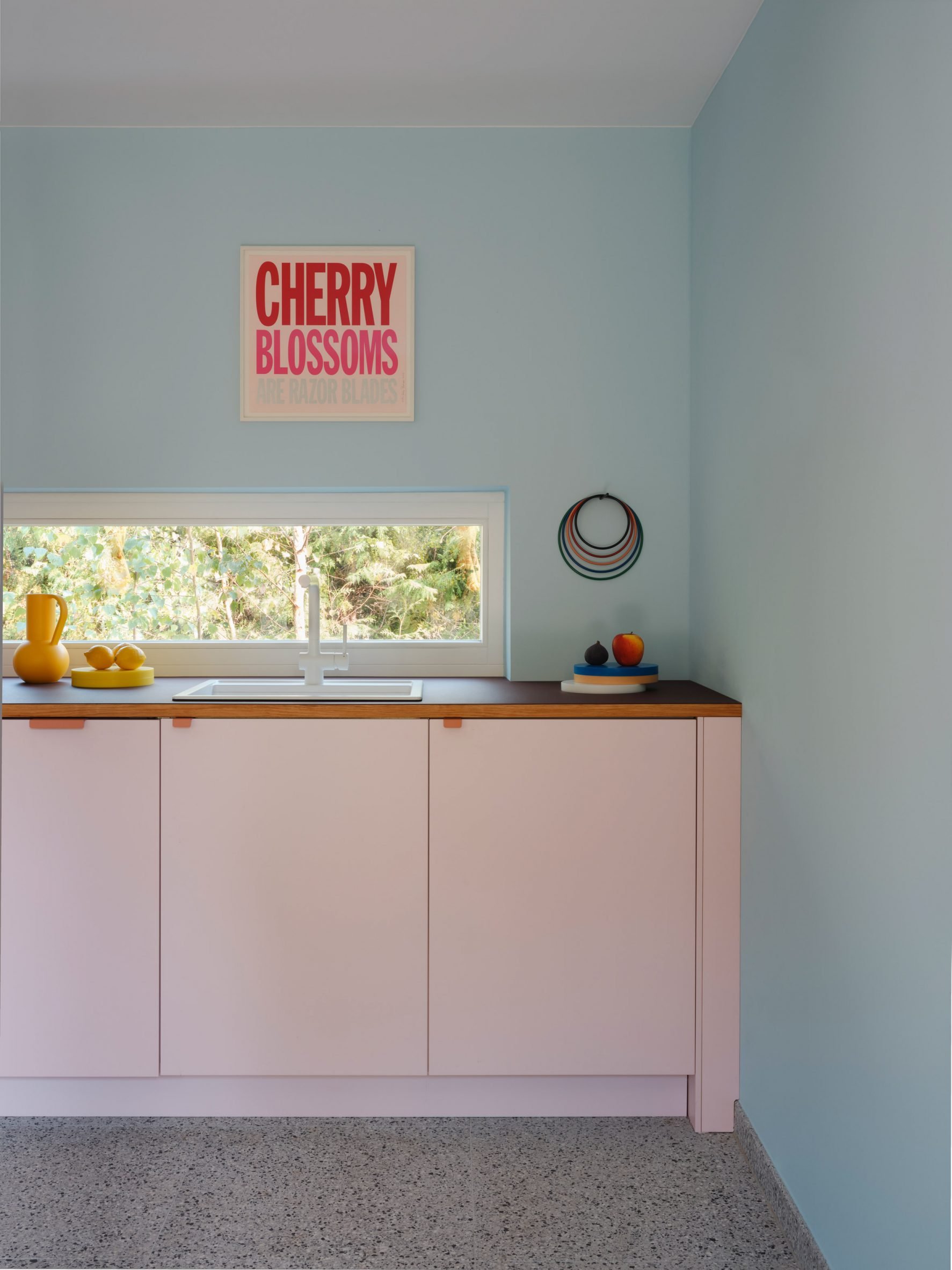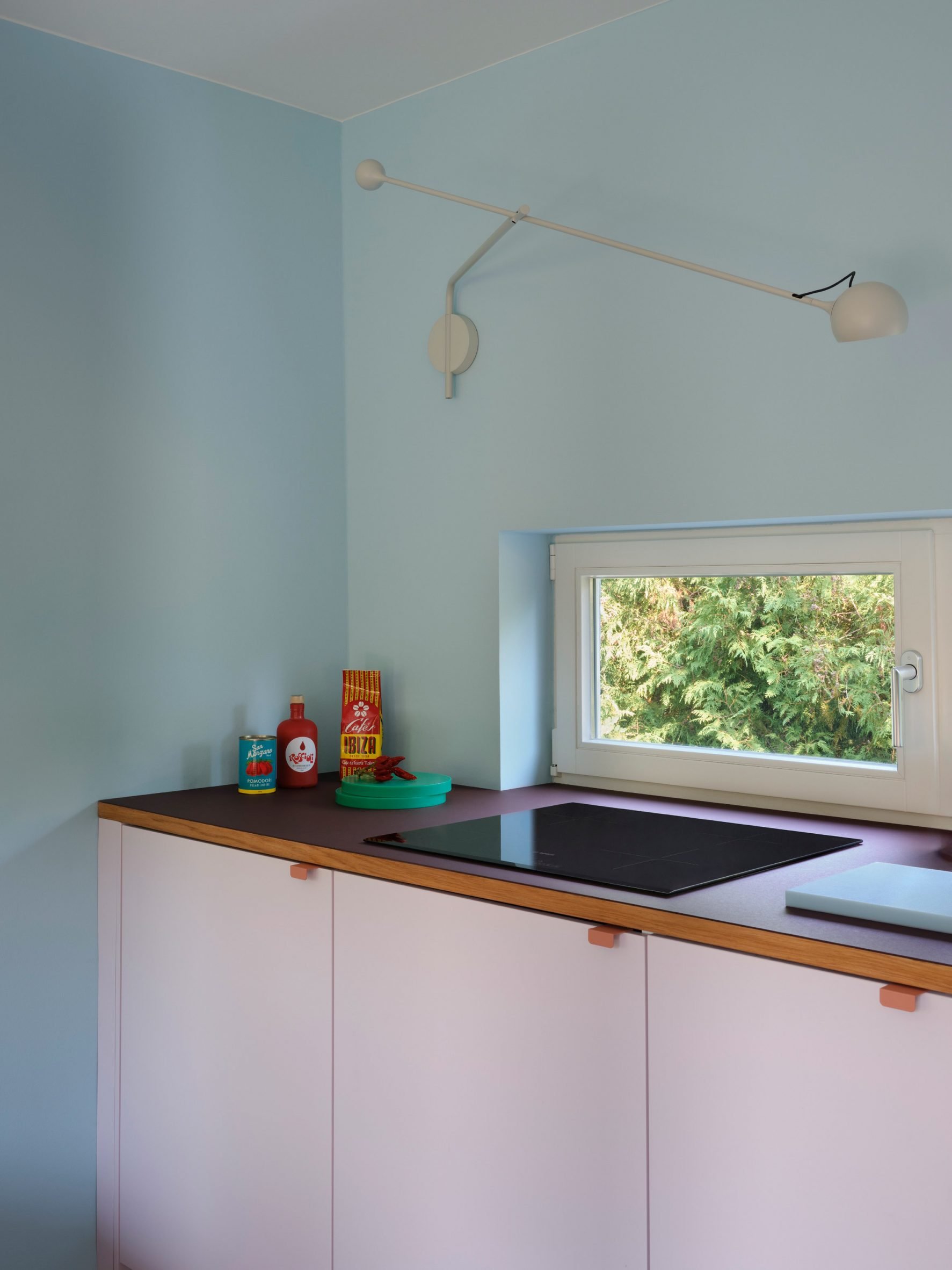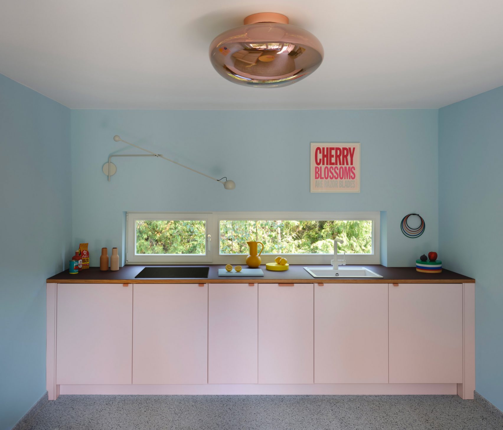 주방은 핑크 톤의 수납장과 블루 계열의 벽면이 조화를 이루며, 모던한 조명이 따뜻한 분위기를 형성한다. 낮게 배치된 가로창을 통해 충분한 자연광이 유입되며, 외부의 녹색 경관이 실내에서도 자연스럽게 스며든다.