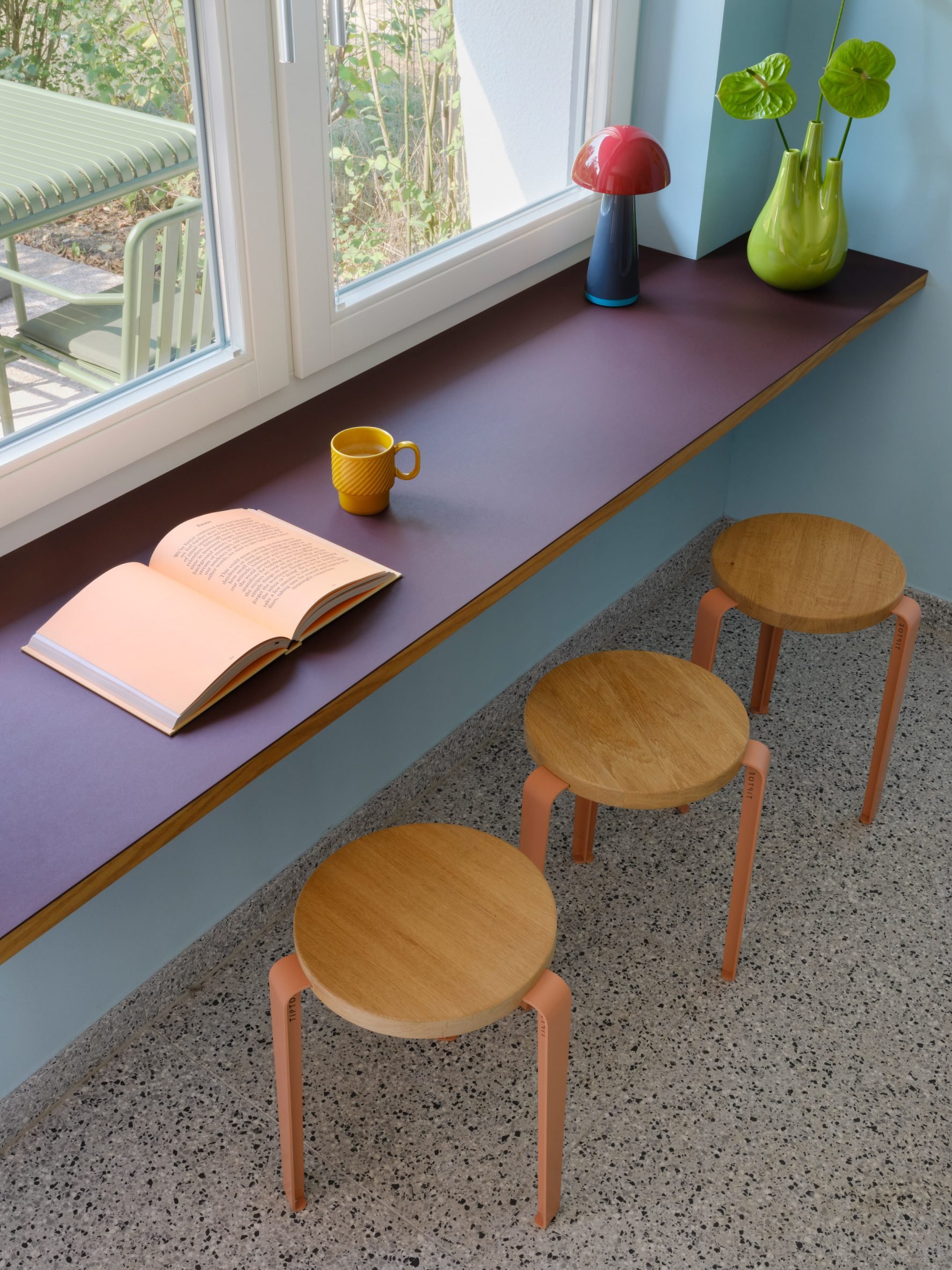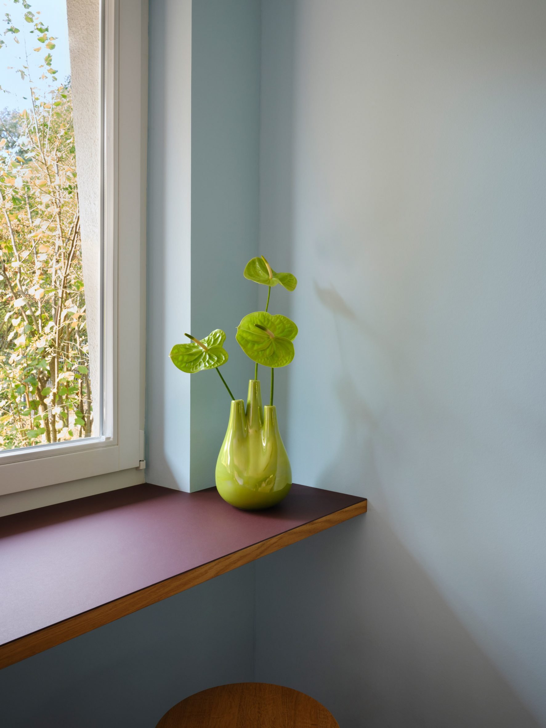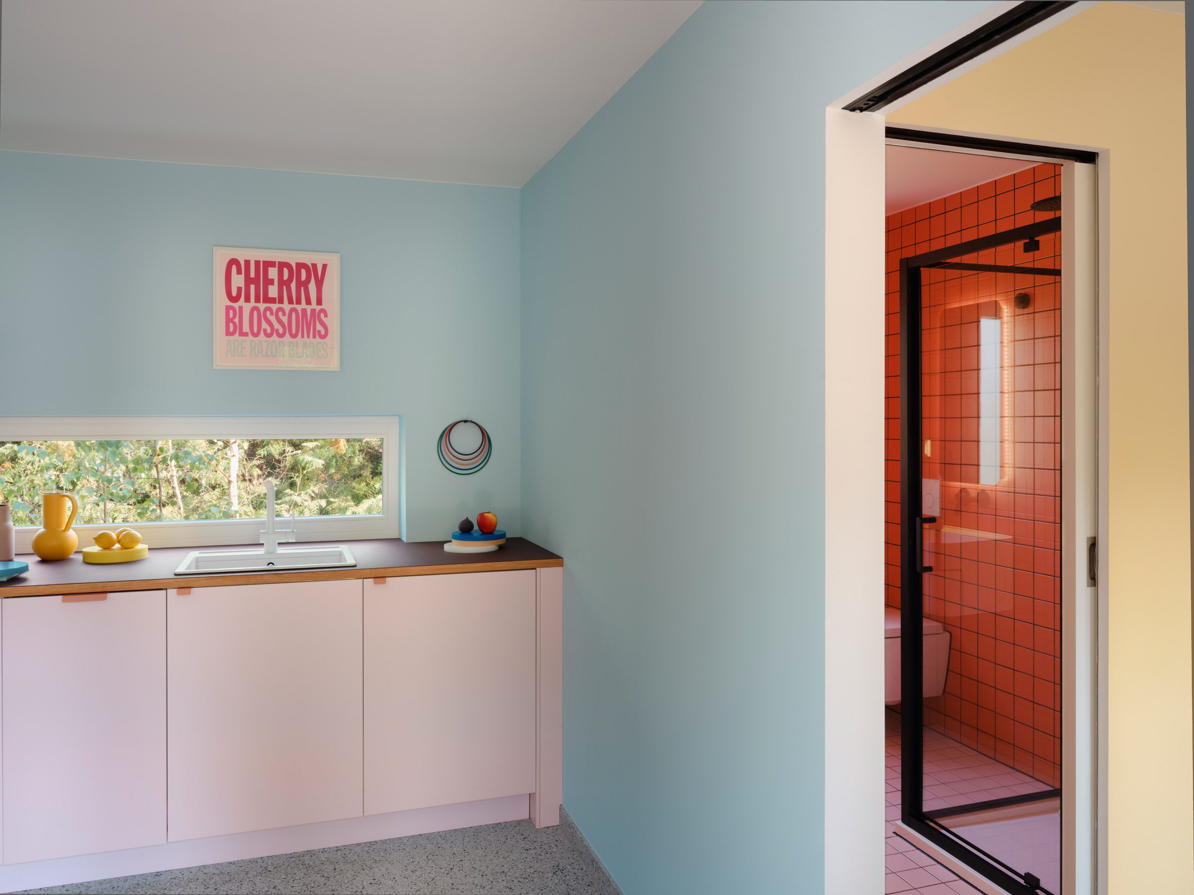 주방은 핑크 톤의 수납장과 블루 계열의 벽면이 조화를 이루며, 모던한 조명이 따뜻한 분위기를 형성한다. 낮게 배치된 가로창을 통해 충분한 자연광이 유입되며, 외부의 녹색 경관이 실내에서도 자연스럽게 스며든다.