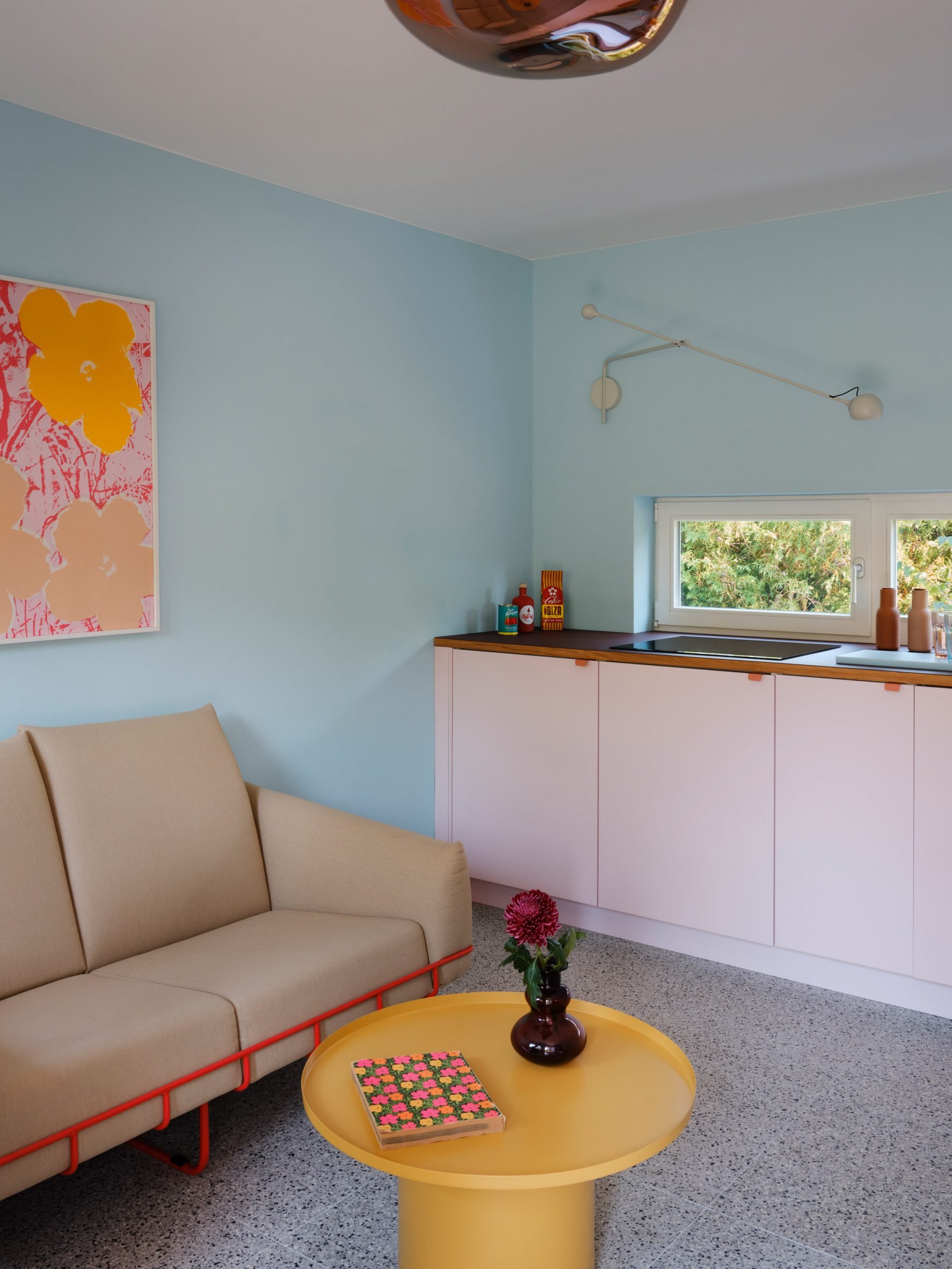 거실은 파스텔 블루 벽과 미니멀한 가구로 꾸며졌으며, 팝아트 스타일의 장식이 돋보인다. 창가에는 선반형 테이블을 배치하여 독서 및 커피 공간으로 활용할 수 있도록 했다. 공간의 활용도를 극대화하면서도, 실내 분위기에 개성을 더하는 요소로 작용한다.