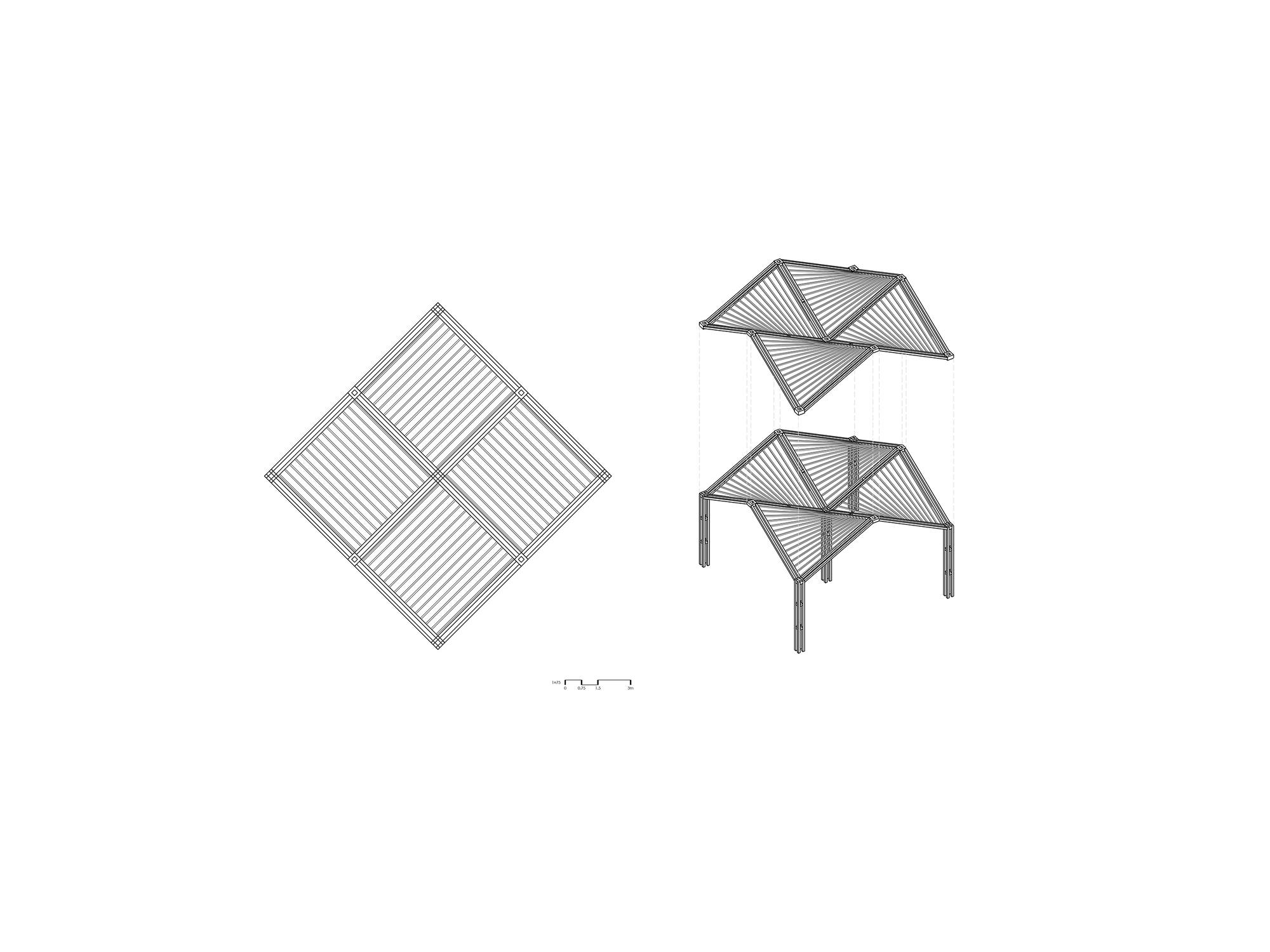 The building is laid out on an 8 by 8m structural grid arrayed into a 7,700m footprint housing 50 stalls. An ingenious vaulted roofing structure spans across the market only interrupted by two green courtyards at its heart. The inverted umbrellas shape a hyperbolic paraboloid roofing system; this not only reflects our dedication to form finding for architectural aesthetics and structural integrity but also integrates a biophilic design philosophy, seamlessly blending the structure with its natural surroundings.