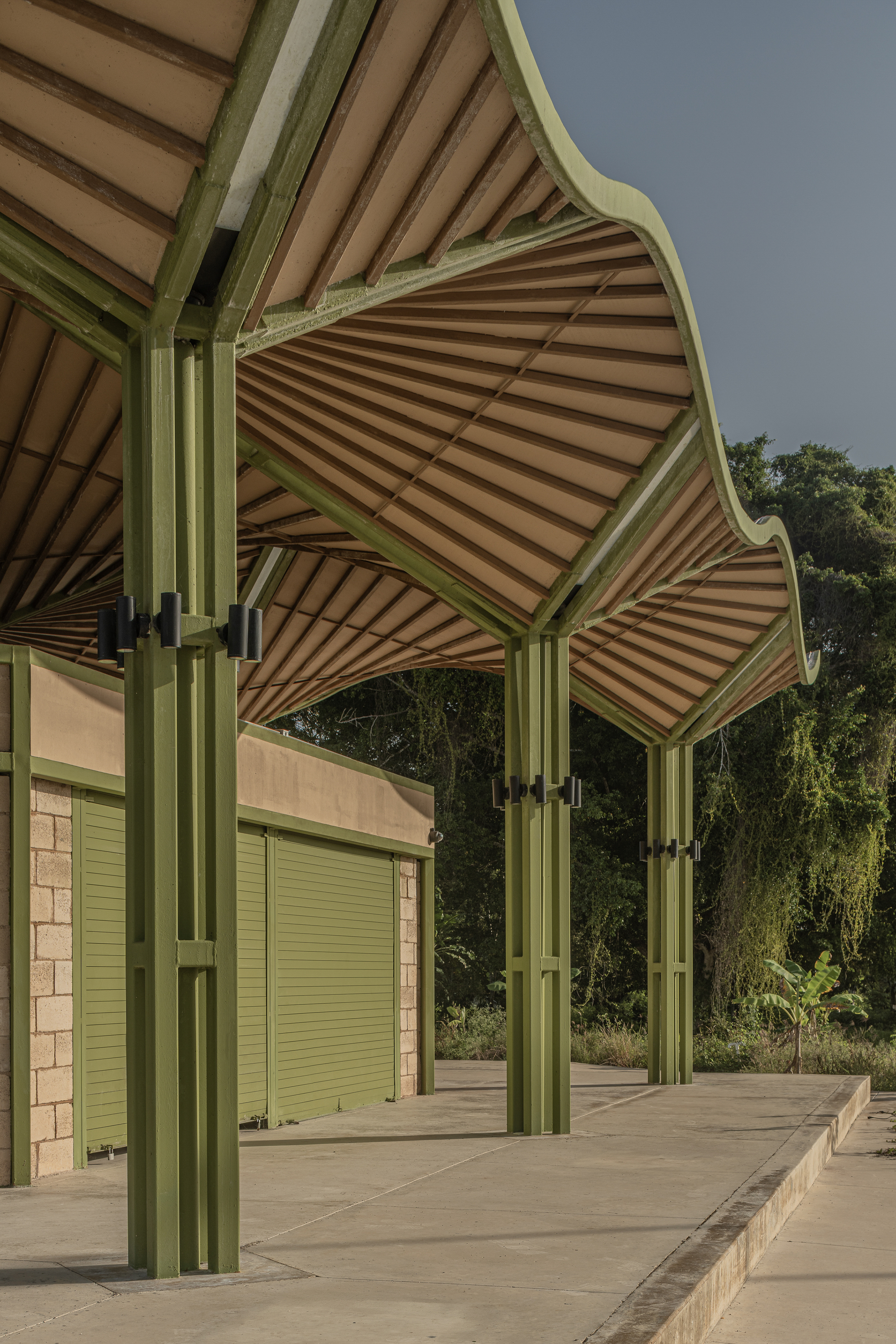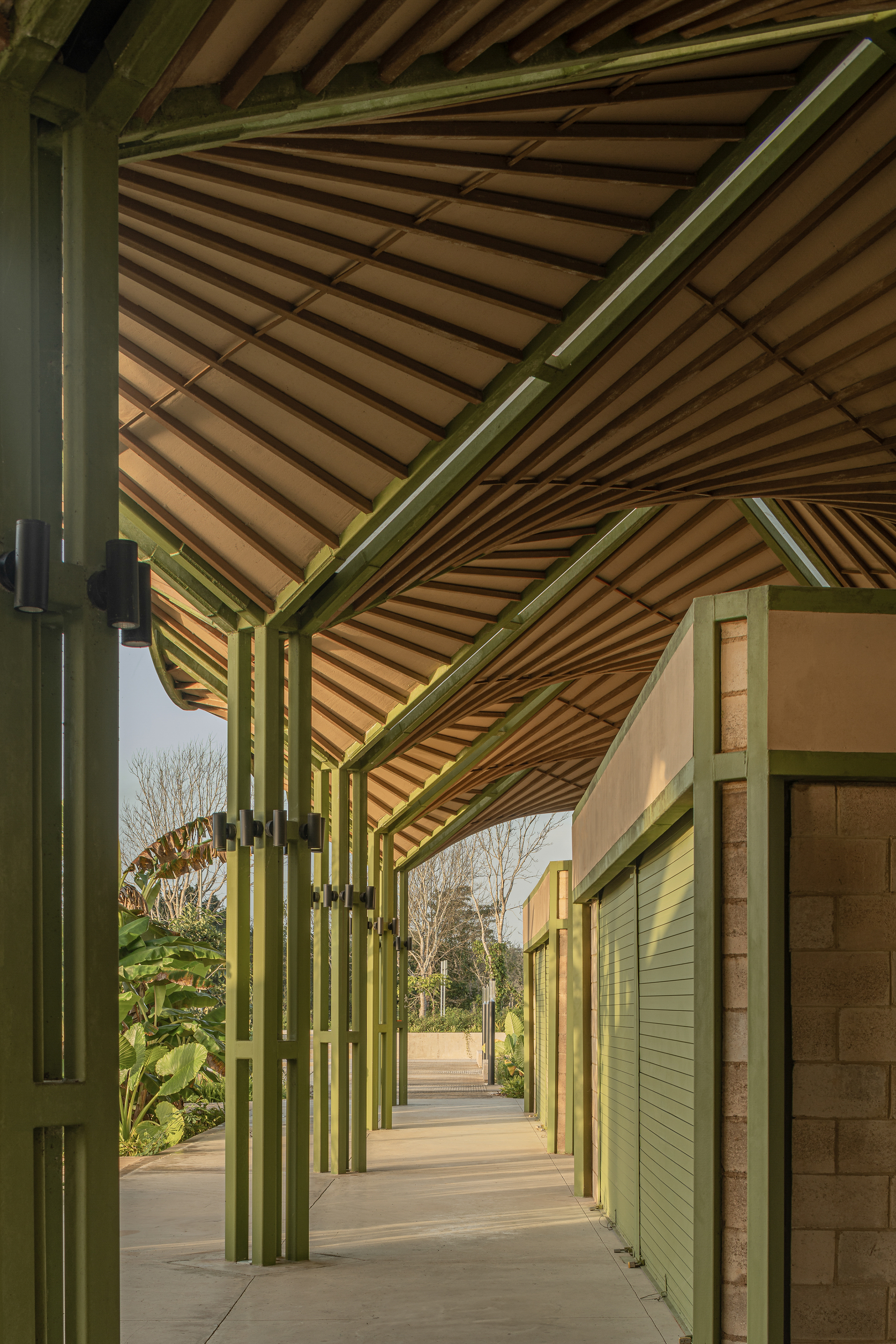 지붕은 하이퍼볼릭 패러볼로이드 형태를 띠며, 역방향 우산과 같은 곡선으로 공간을 덮는다. 이 독특한 형태는 단순한 심미적 선택이 아니다. 구조적 안정성을 확보하는 동시에, 건축과 자연을 유기적으로 연결하는 바이오필릭 디자인 원칙을 반영한 것이다. 하늘을 향해 열린 곡선들은 빛과 바람을 유려하게 받아들이고, 실내 어디에서든 자연을 느낄 수 있도록 한다.
