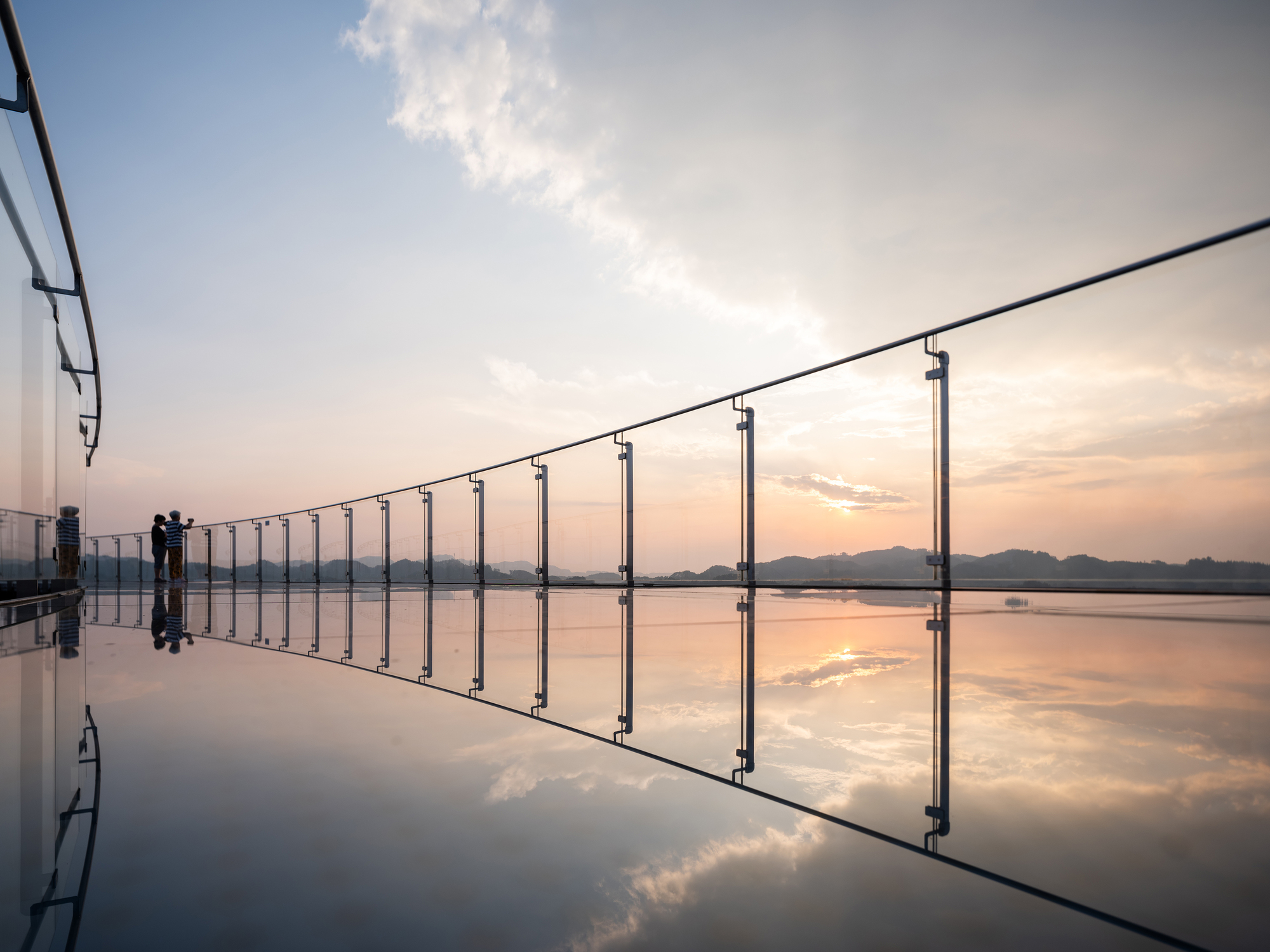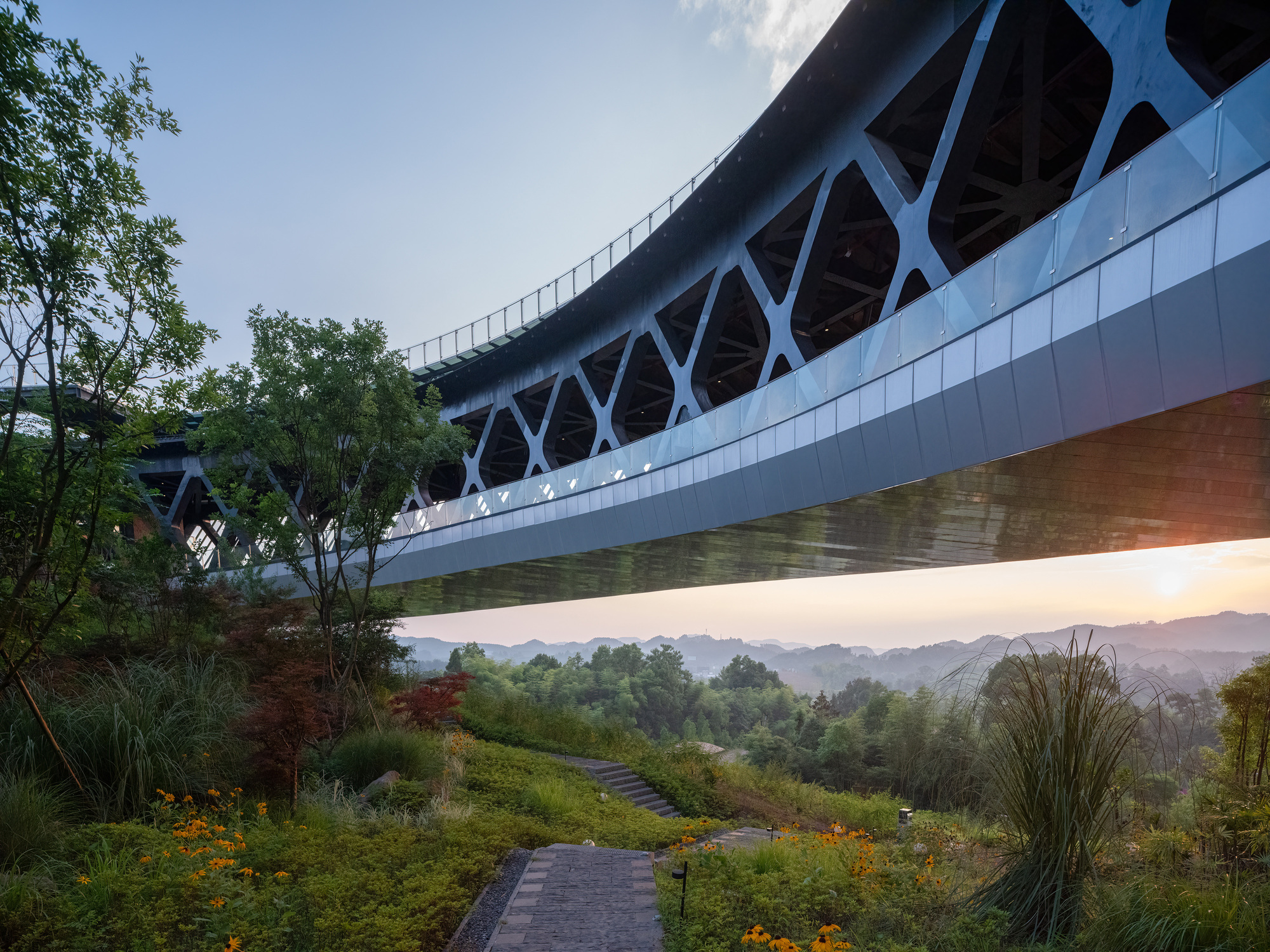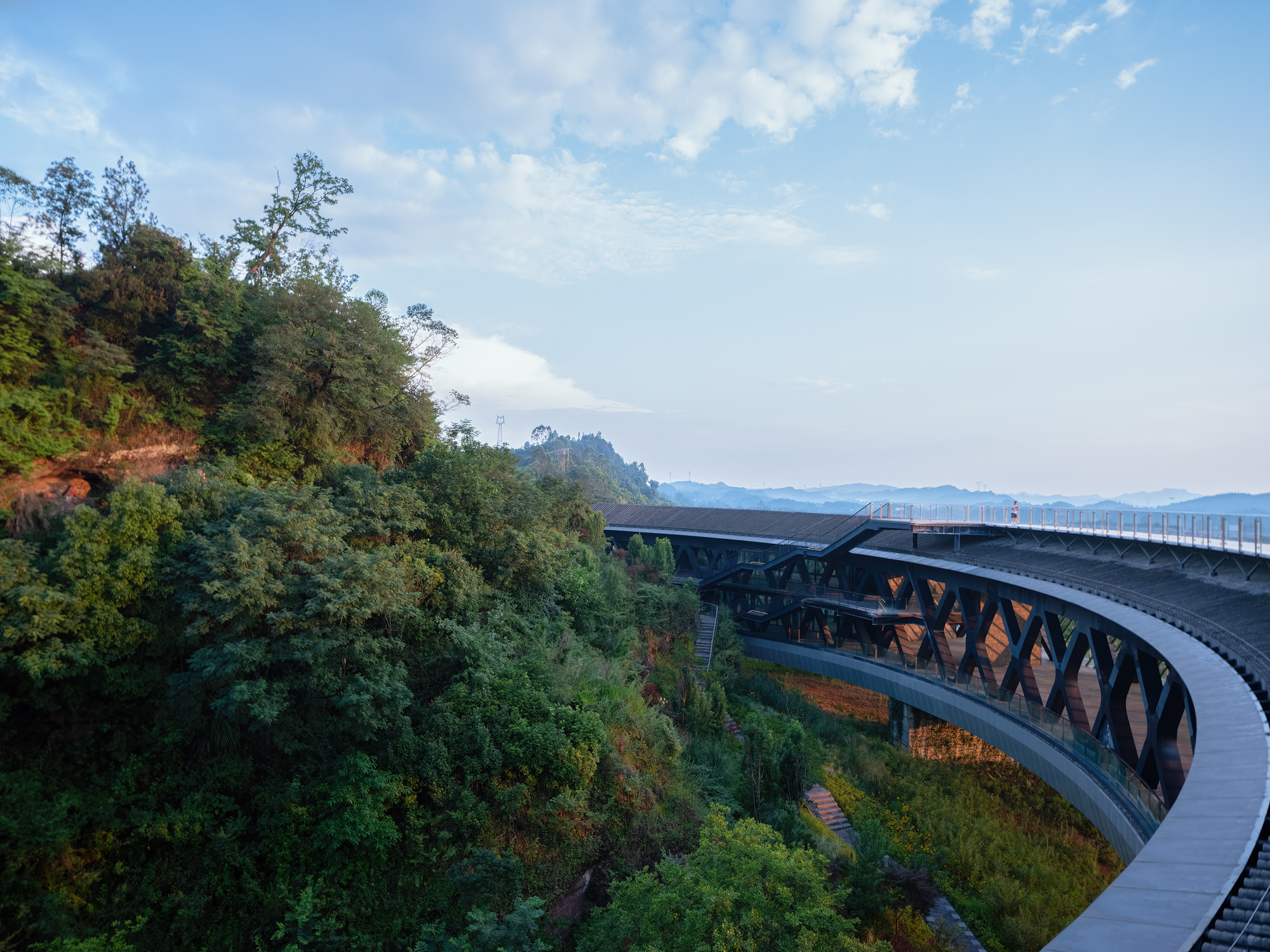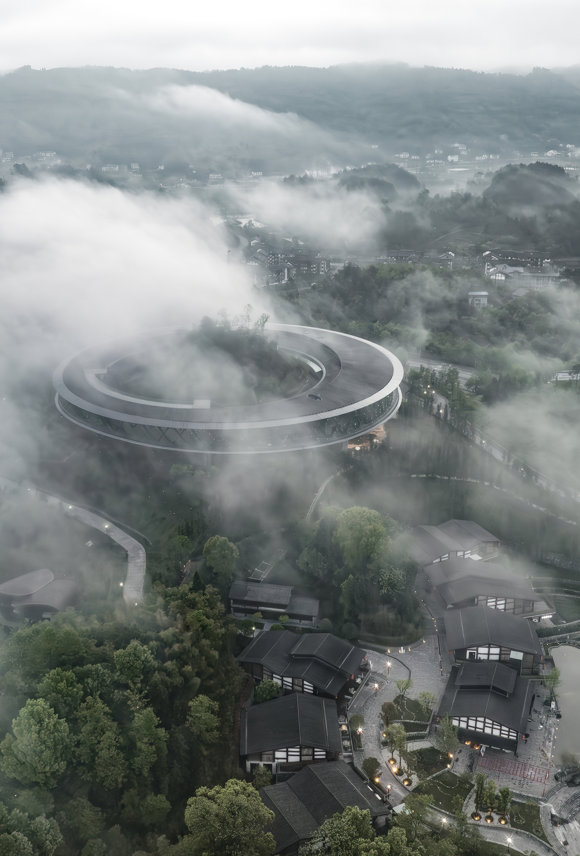 The upper circular section features an 85 meter floating bridge around the hill, creating a scenic natural landmark. The rooftop photovoltaic glass walkway offers views of the rural landscape outside and the serene inner hill, continuing a dialogue with the preserved mountain temple, serving as a spiritual symbol of nature.
