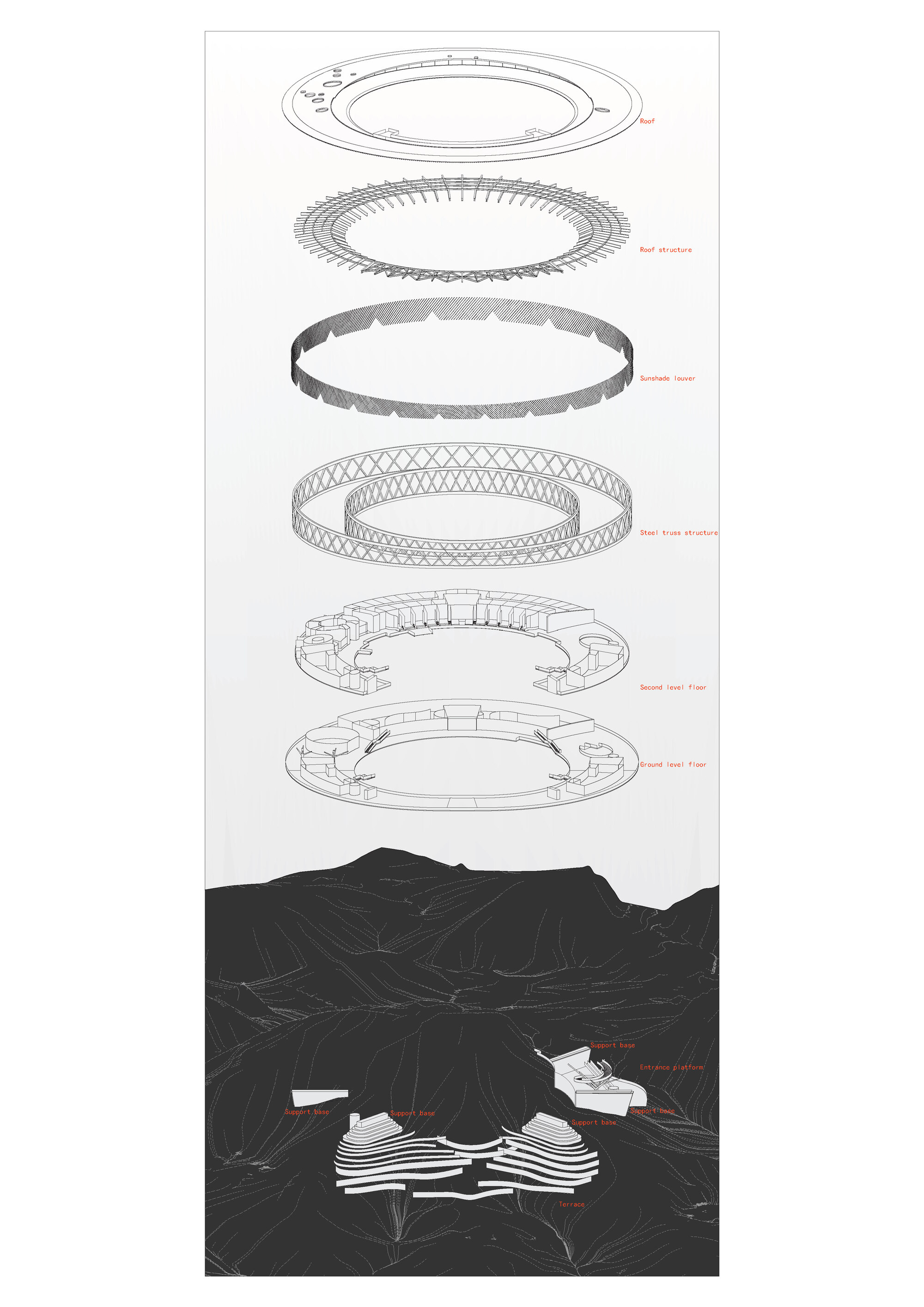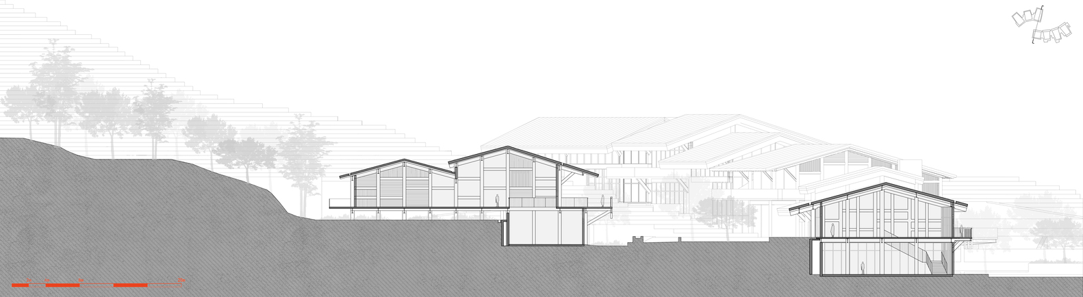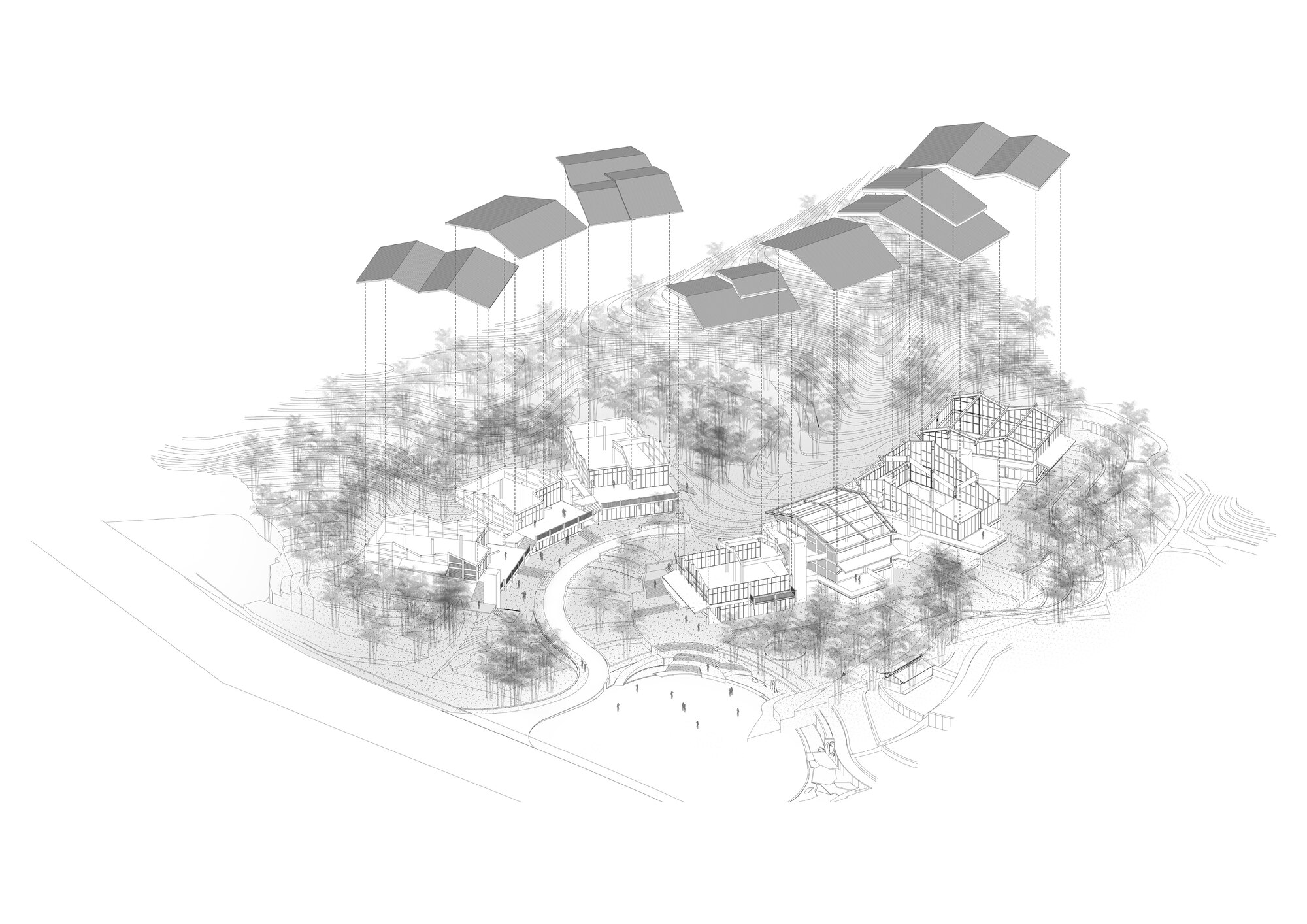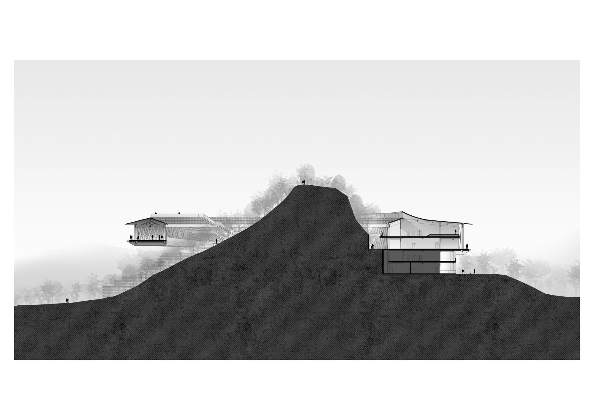 The complex terrain is transformed into a natural feature. Two groups of buildings respond to the environment in different ways. The market at the foot of the hill is divided into small units, following the slope and using elevated structures to adapt to the terrain. The ring shaped structure at the hilltop embraces the natural hill, emphasizing the centrality of nature. By preserving the original terrain and vegetation, the site becomes a countryside park where architecture and nature intertwine, forming part of the landscape.