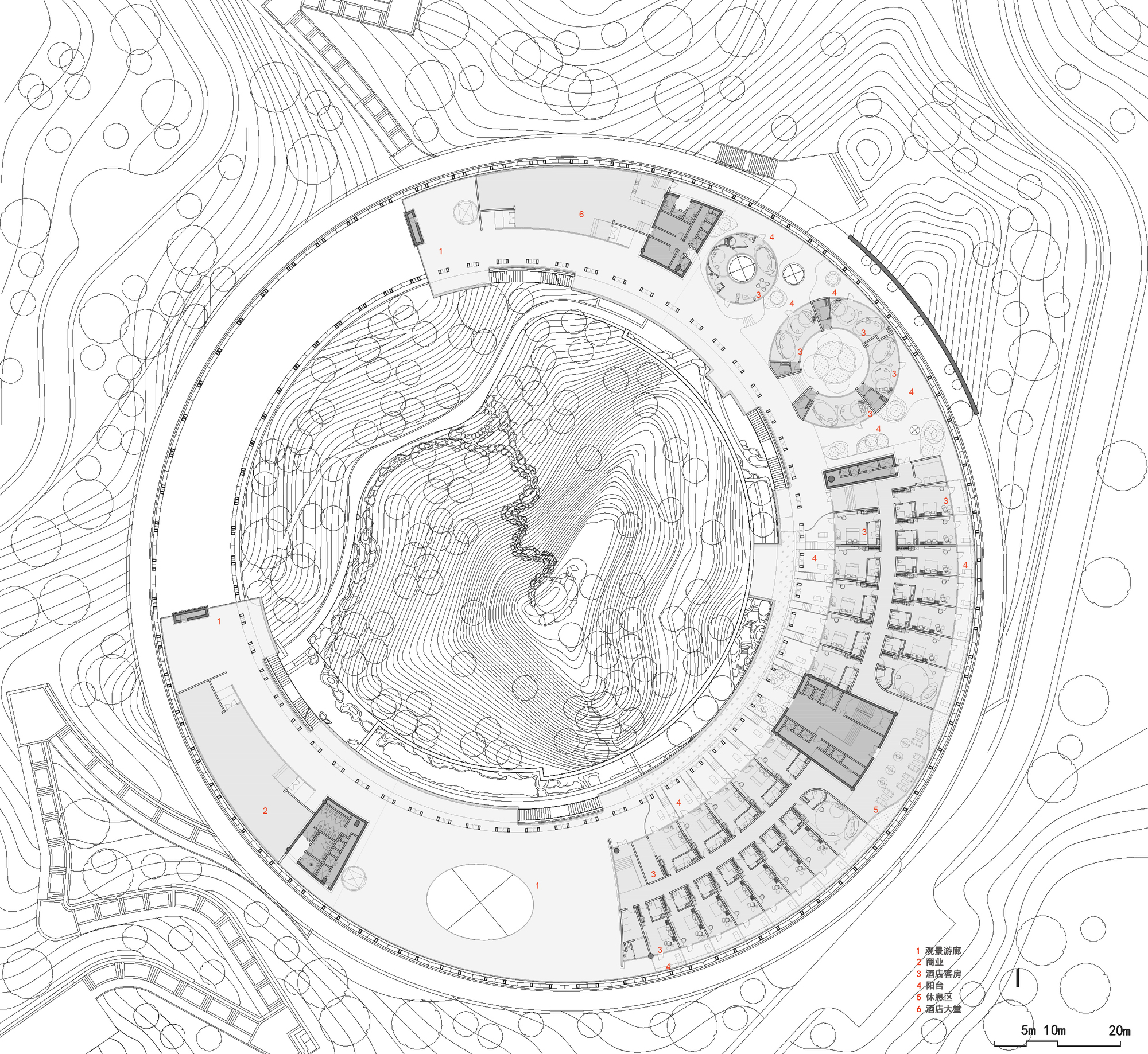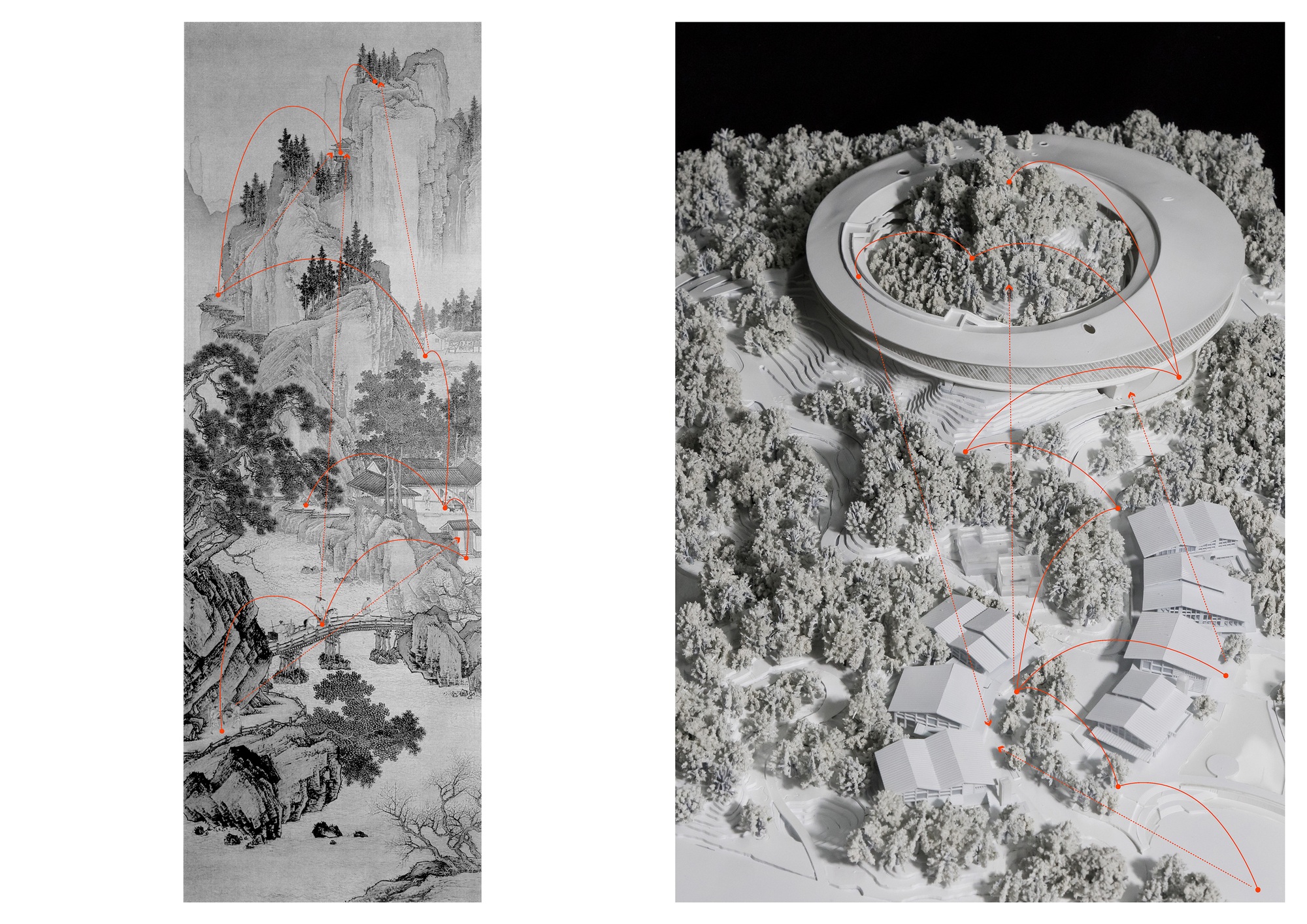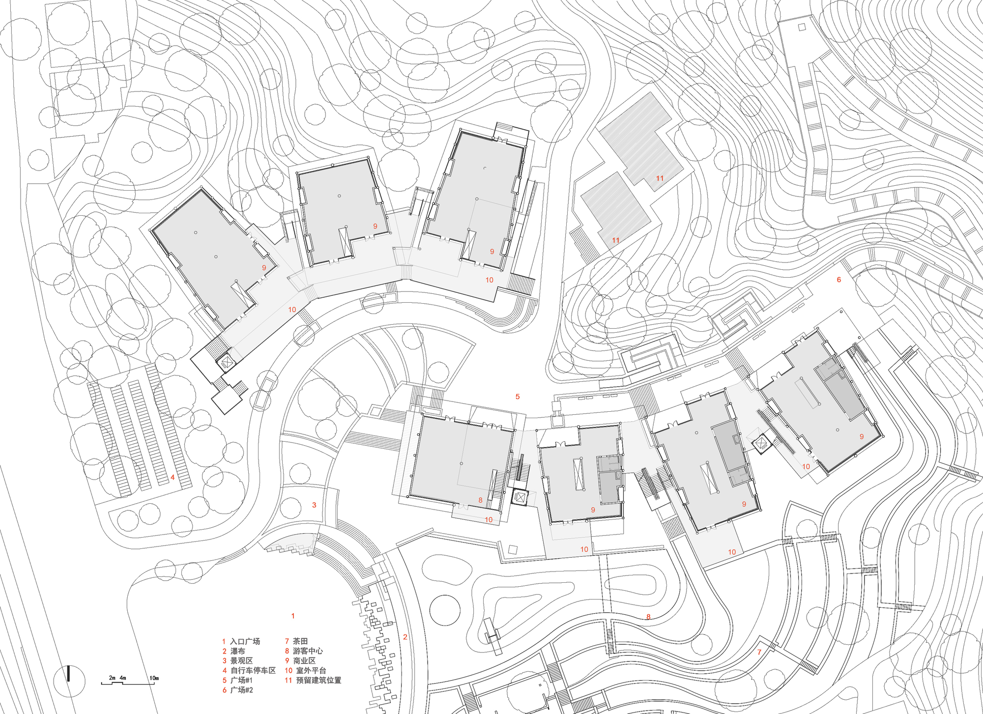 The complex terrain is transformed into a natural feature. Two groups of buildings respond to the environment in different ways. The market at the foot of the hill is divided into small units, following the slope and using elevated structures to adapt to the terrain. The ring shaped structure at the hilltop embraces the natural hill, emphasizing the centrality of nature. By preserving the original terrain and vegetation, the site becomes a countryside park where architecture and nature intertwine, forming part of the landscape.