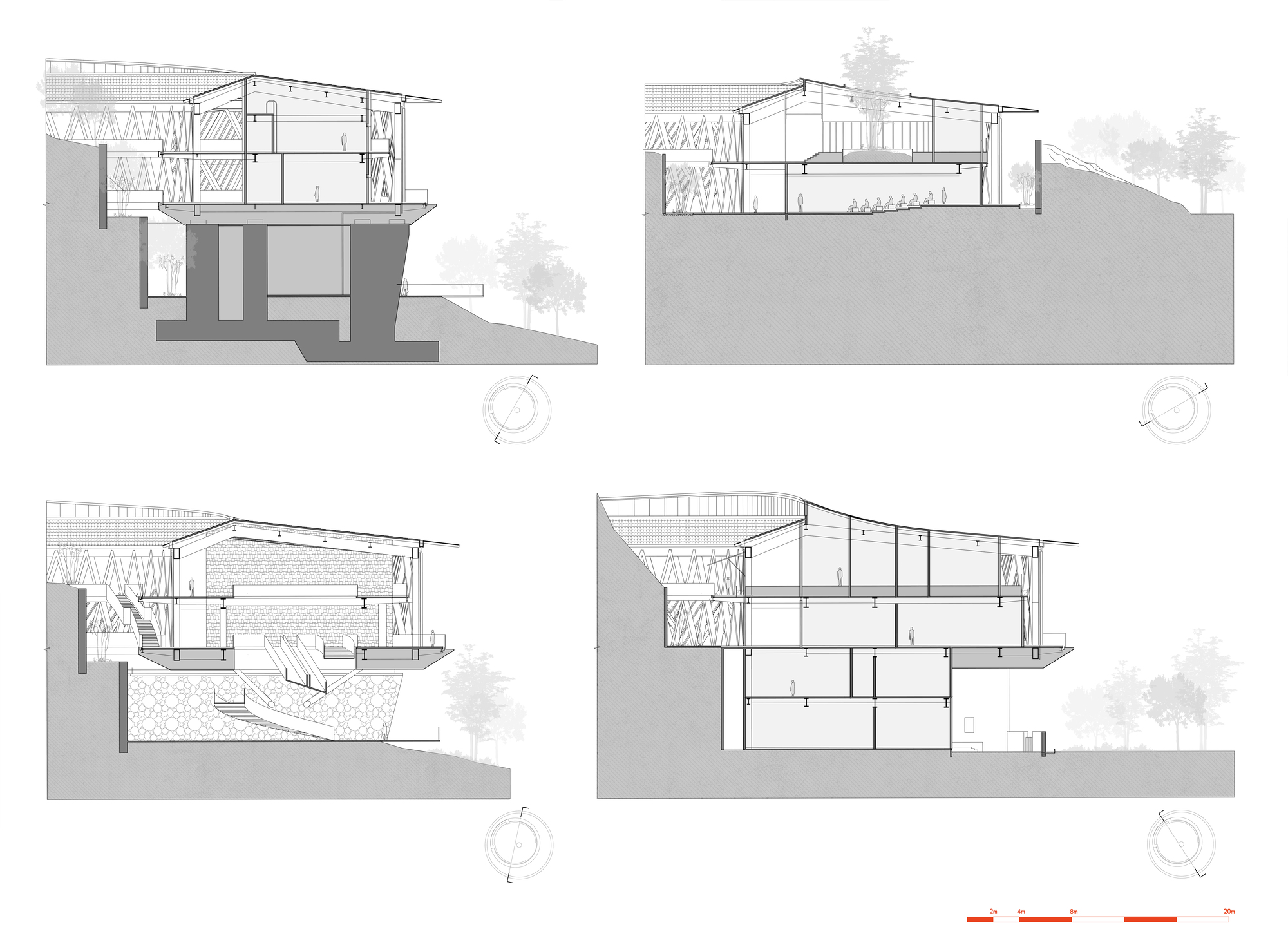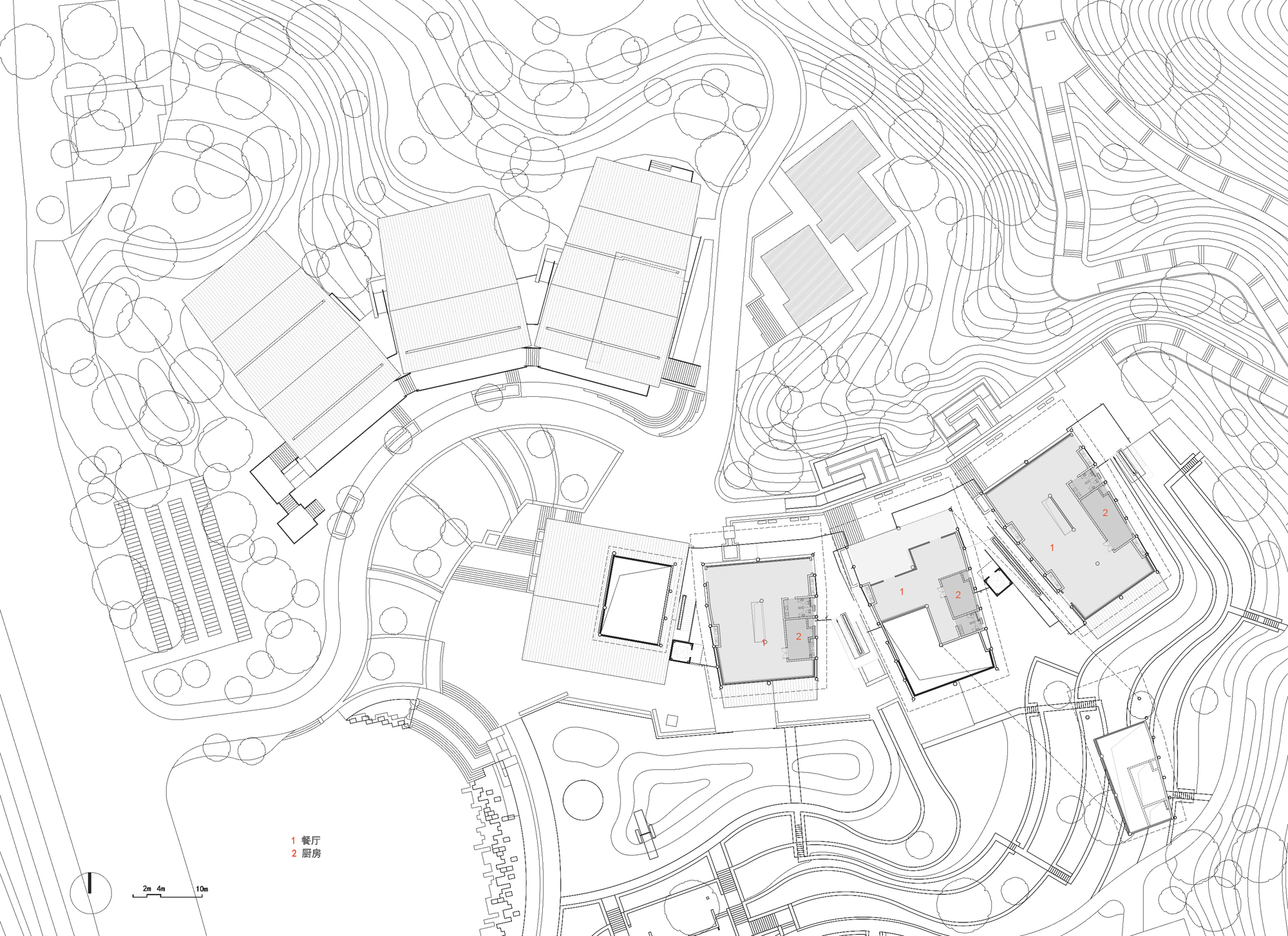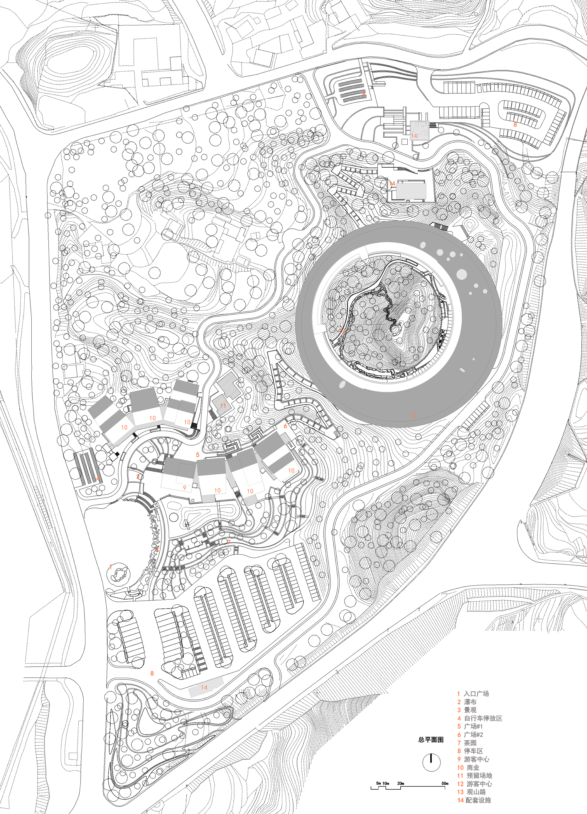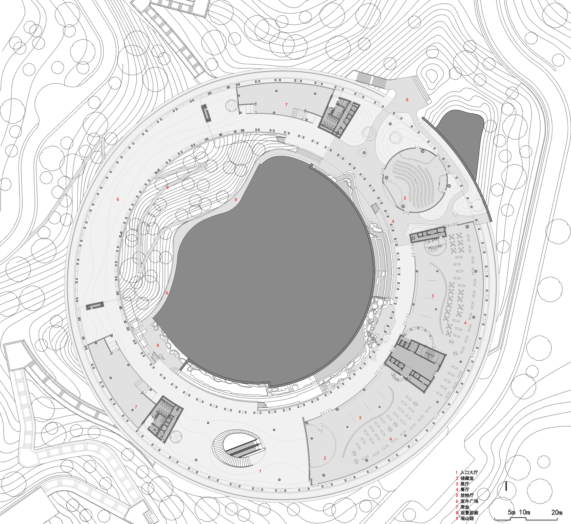 The complex terrain is transformed into a natural feature. Two groups of buildings respond to the environment in different ways. The market at the foot of the hill is divided into small units, following the slope and using elevated structures to adapt to the terrain. The ring shaped structure at the hilltop embraces the natural hill, emphasizing the centrality of nature. By preserving the original terrain and vegetation, the site becomes a countryside park where architecture and nature intertwine, forming part of the landscape.