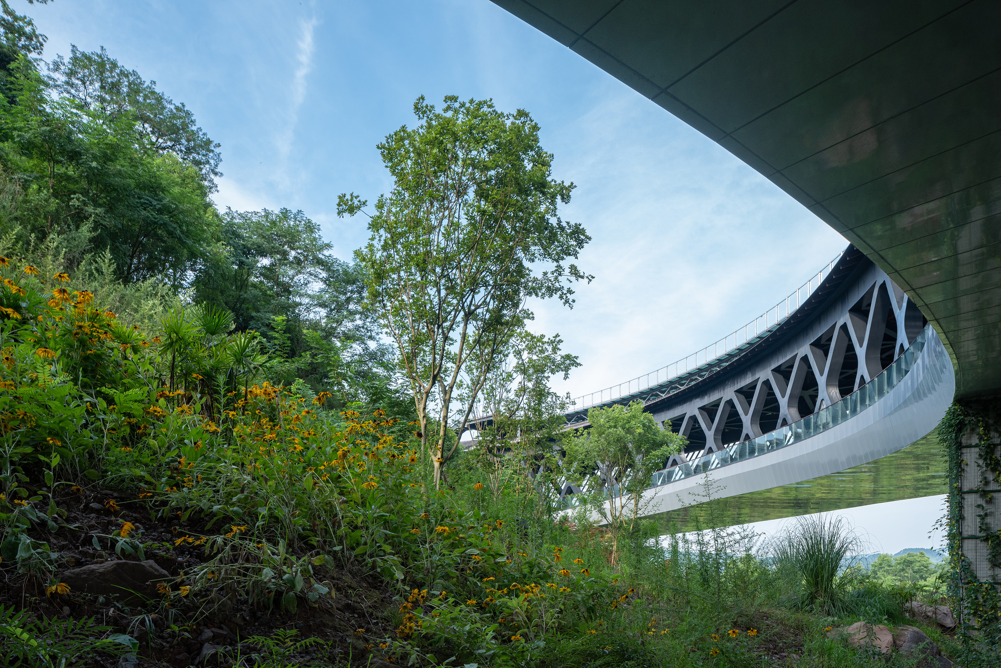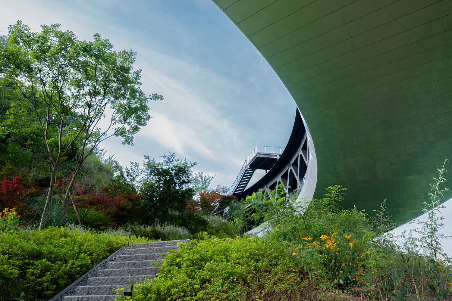 정상부에는 원형 구조가 자리 잡고 있으며, 이는 주변 환경과 조화를 이루는 동시에 중심적 역할을 한다. 특히, 이 구조를 감싸는 85미터 길이의 플로팅 브리지는 방문객에게 독특한 공간 경험을 제공한다. 다층적 동선 설계를 통해 실내외 공간이 자연스럽게 연결되도록 하였다.