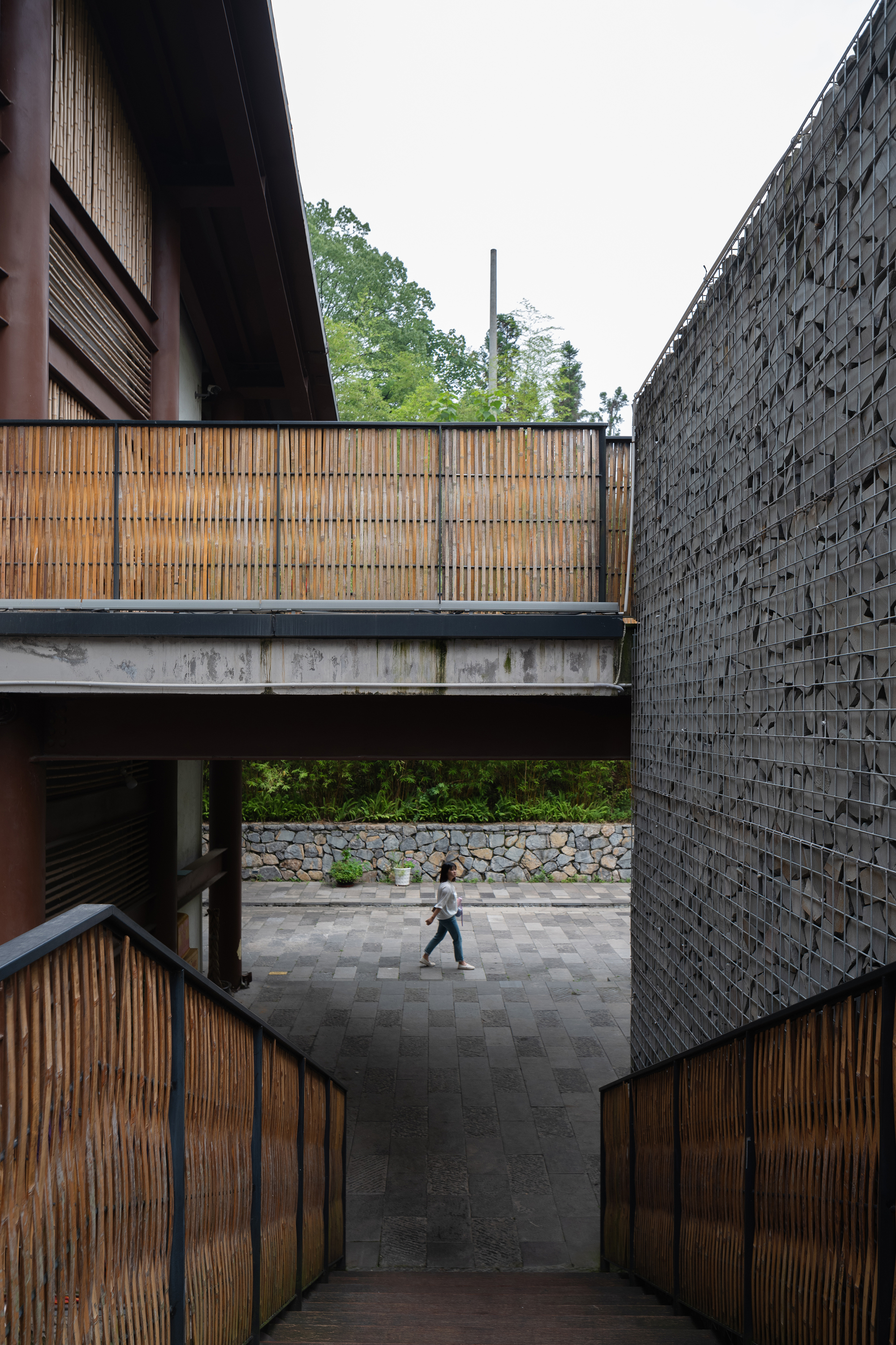 건축물은 지역에서 조달한 거친 돌담, 푸른 사암, 대나무 울타리를 주요 재료로 사용하여 지역 정체성을 반영했다. 외관의 녹색 격자 패턴은 주변 자연과 유기적으로 연결되며, 시간과 날씨에 따라 변화하는 빛의 움직임을 강조한다. 실내에서는 노출 콘크리트와 목재가 조화를 이루며, 부드러운 자연광이 공간을 감싸 감각적인 온도를 형성한다.