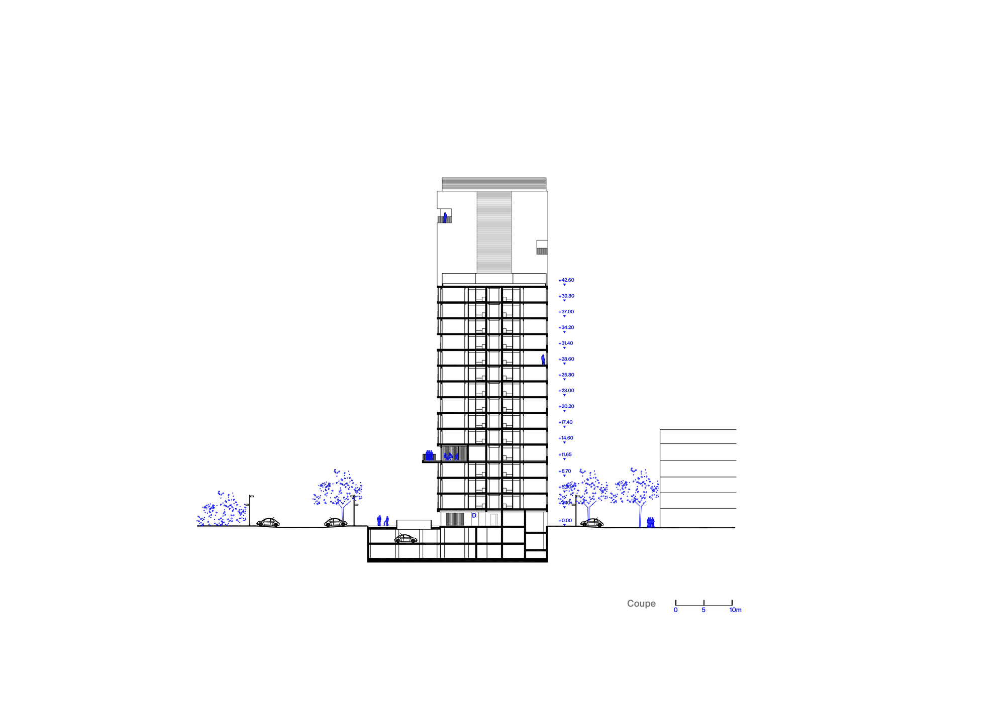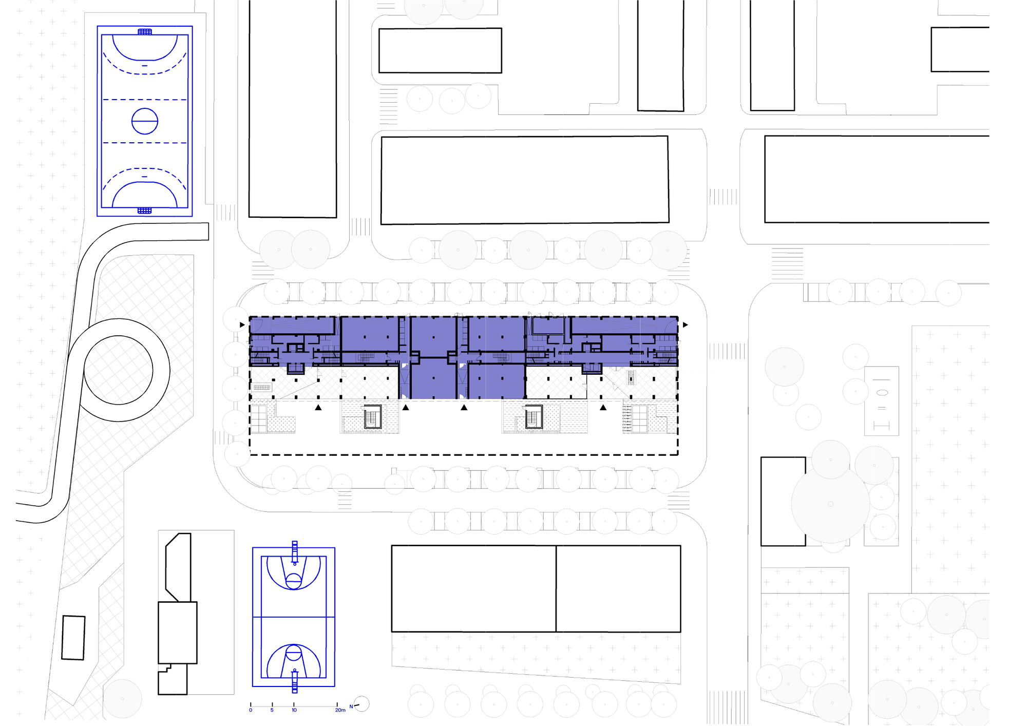4개의 수직 동선(엘리베이터 및 계단)은 4층 공용 테라스를 통해 하나로 연결되며, 이 테라스는 주민들이 함께 이용할 수 있는 공유 공간으로 조성되었습니다. 또한, 1층에는 공동체 활동을 위한 다목적 공간과 지역 상업 시설이 배치되어 있어, 단순한 거주 공간을 넘어 커뮤니티 활성화를 지원하는 역할을 합니다.