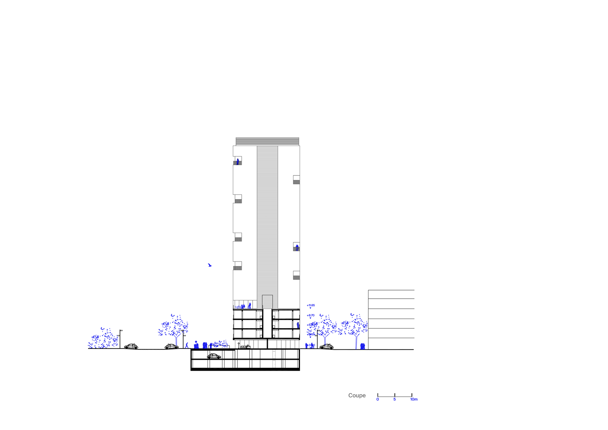 The building is accessed through a covered exterior transition space, connecting the public plaza with the four hallways. The areas for bikes and mailboxes are associated with these spaces. The four circulations are connected through the common fourth floor terrace provided with a shared space; An associative space on the ground floor and shops complete the program. The modulated structure simplifies technical issues, turning the building into an evolutionary project for future transformations. The self-production of sustainable aerothermal and photovoltaic solar energy, the use of low-carbon materials on the facades and the cross ventilation of the building, allow us to create a degree of resilient comfort for future inhabitants.