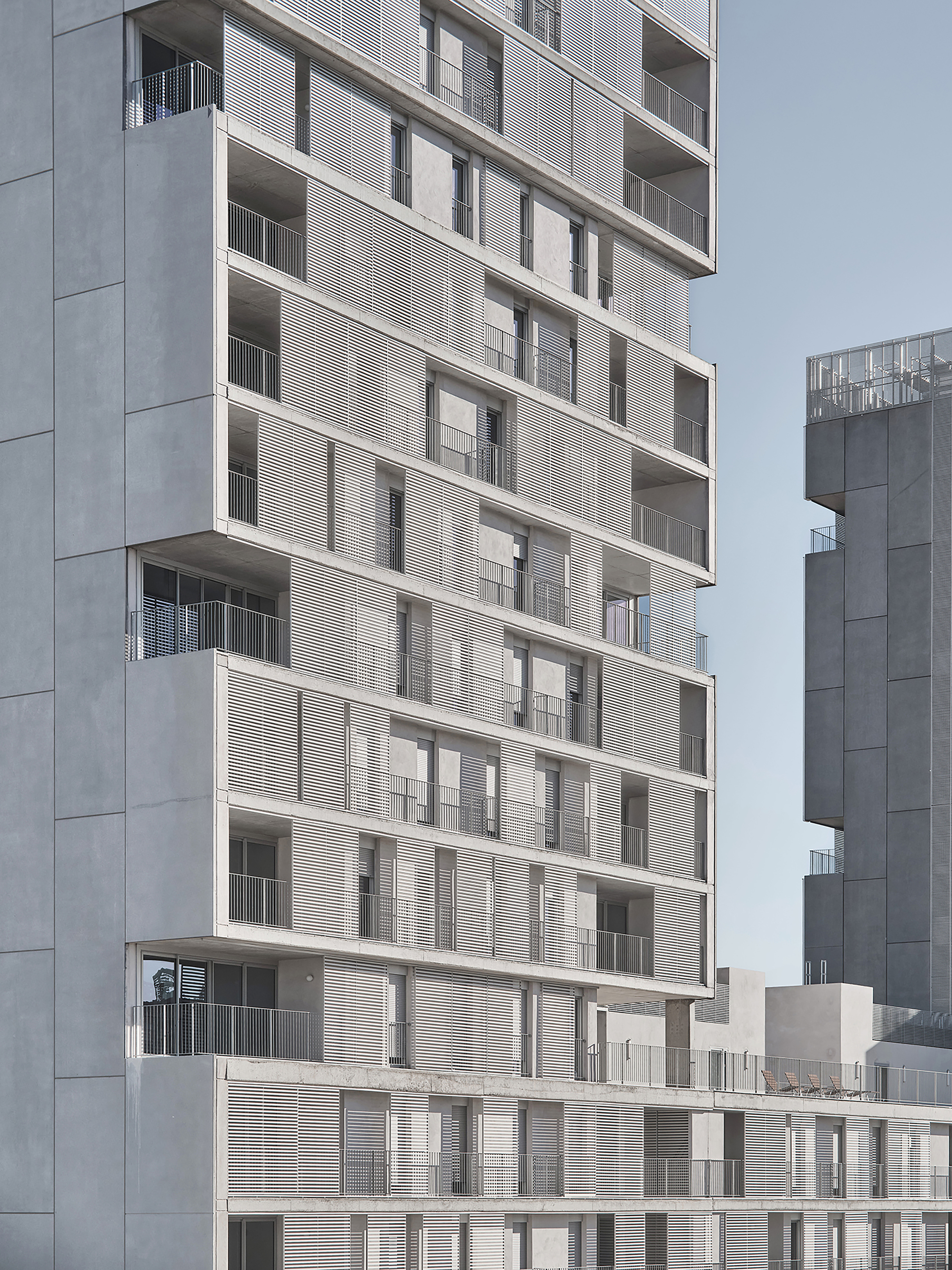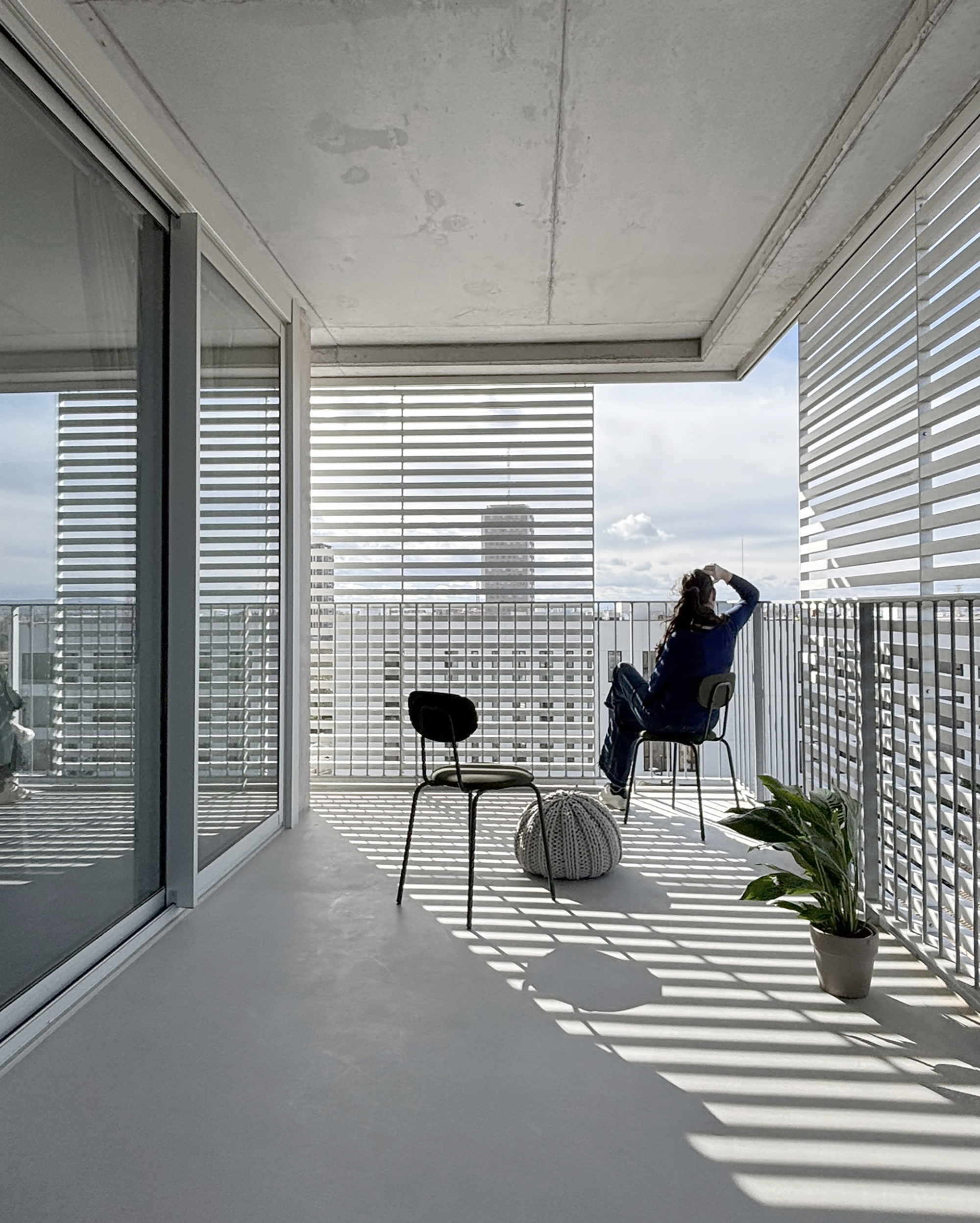 The relationship of the dual oriented homes with their surroundings is the starting point of the project. A central backbone element concentrates the server spaces and the technical structure of the building, freeing the most flexible and evolutionary main spaces. The panoramic dwellings are open to the landscape, sea and mountains. The generous outdoor spaces extend the home towards the outside. Protected by a system of sliding slats that promote climatic comfort, they are designed as just another room.
