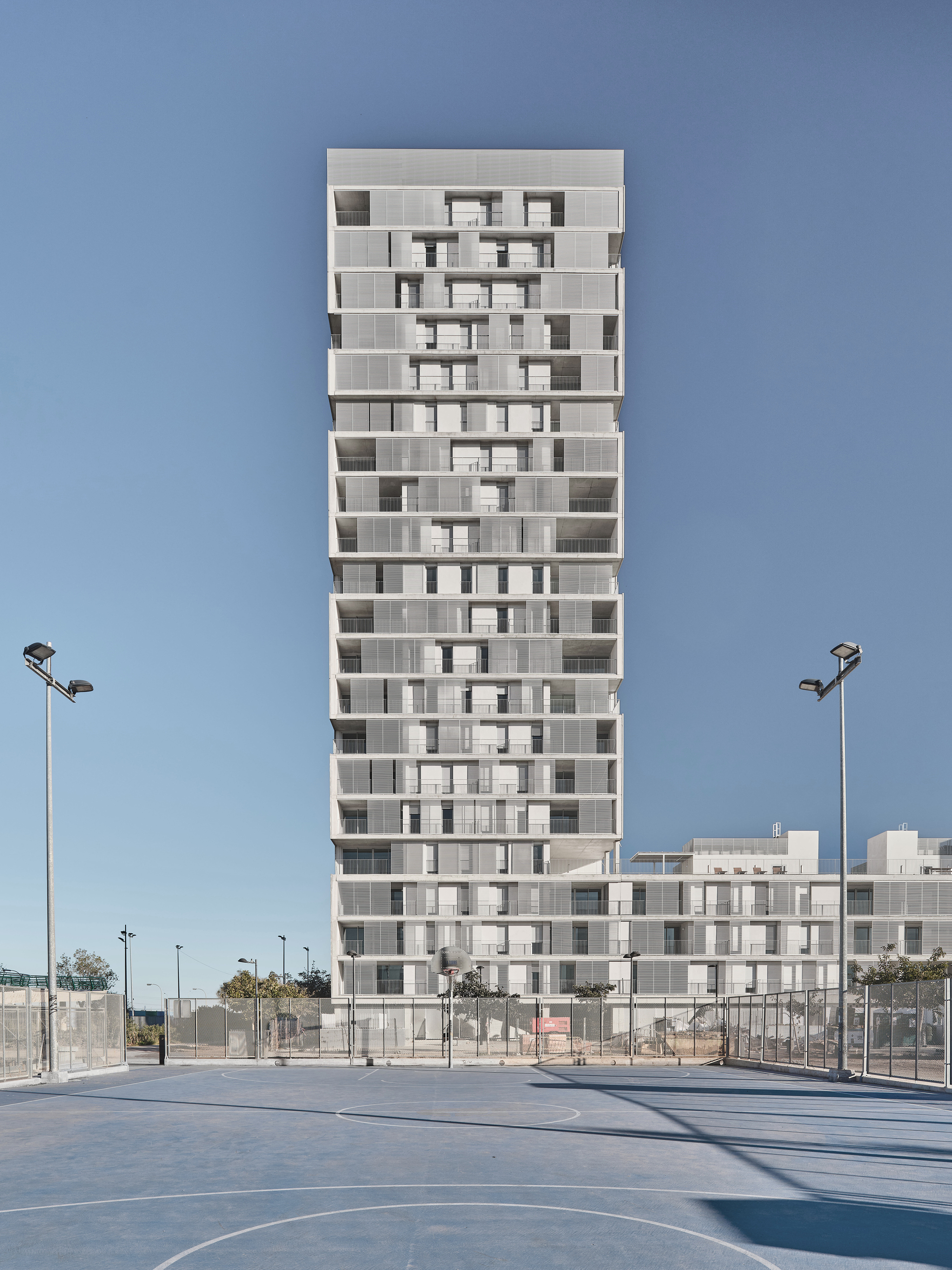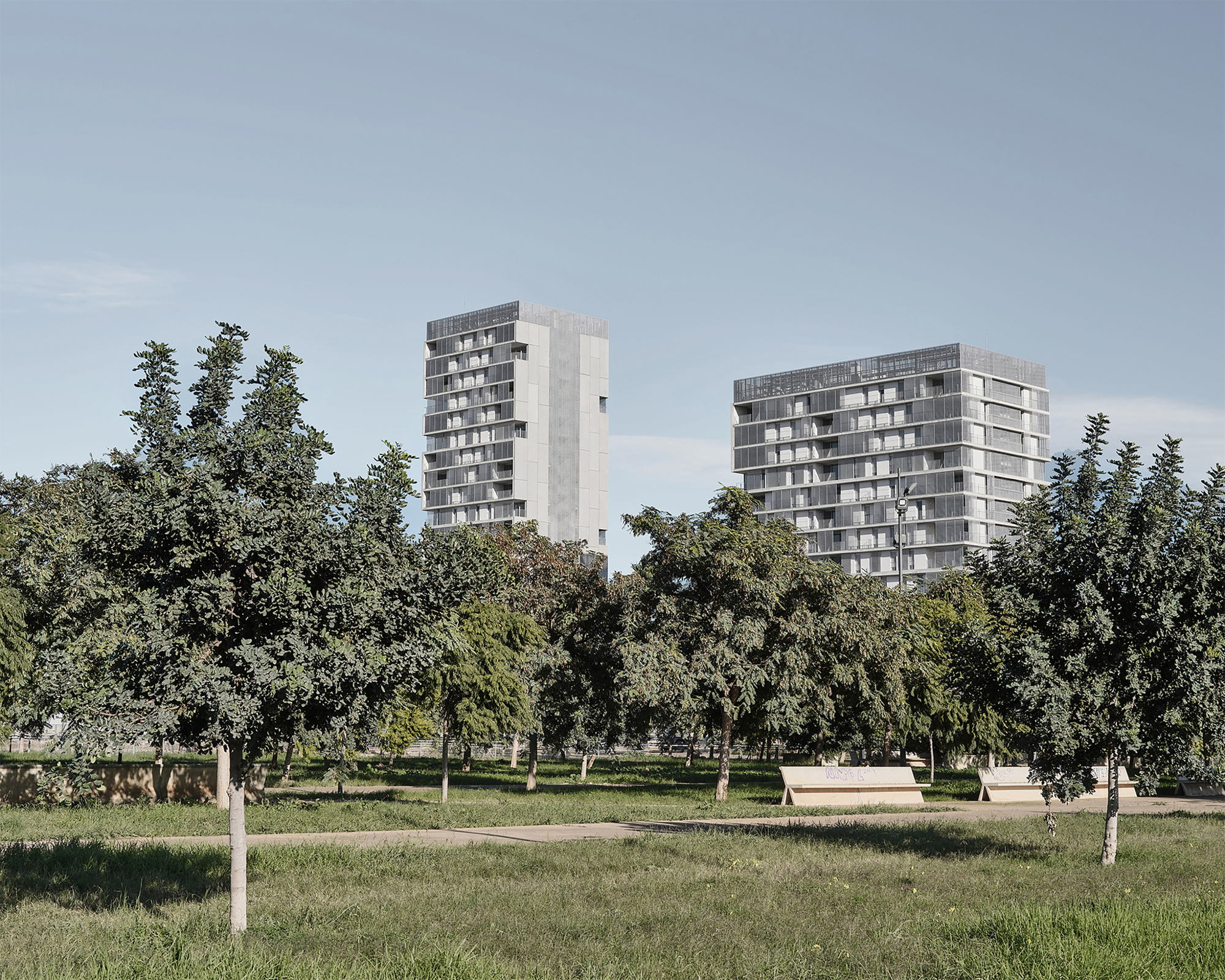 Located south of the city of Valencia, in the district of La Torre, Horta Sud. The place is markedly delimited to the north by the artificial landscape of the new channel and Valencia city. And to the south through the Huerta. The neighborhood, originally known as "Sociopolis," revitalizes the southern residential areas with a set of ten tower buildings and a large urban park, turning the place into an exceptional environment. The plot borders the existing neighborhood and is connected to the city by the "Pasarela de la Solidaridad". The building is integrated into its immediate surroundings through a horizontal "plinth" volume of a domestic scale that dialogues with the existing buildings. And with the great landscape on a metropolitan scale, with the two vertical emergencies.