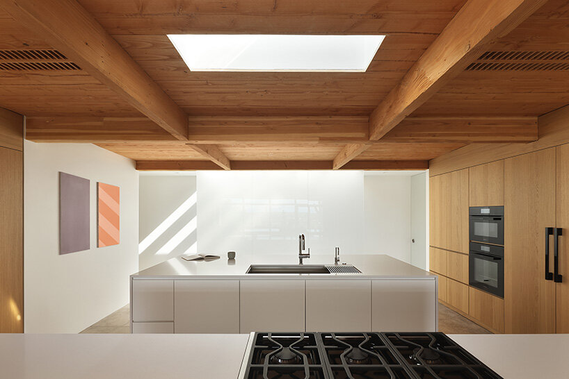 HK Associates also redefined the bedroom wing of Casa Luce, transforming a formerly dark, enclosed corridor into a passage guided by light. A frosted glass screen at the threshold to the kitchen introduces a soft, diffused glow, while the partially exposed roof structure casts bold shadows that change with the movement of the sun. These elements contribute to a dynamic interaction between light and space throughout the home.