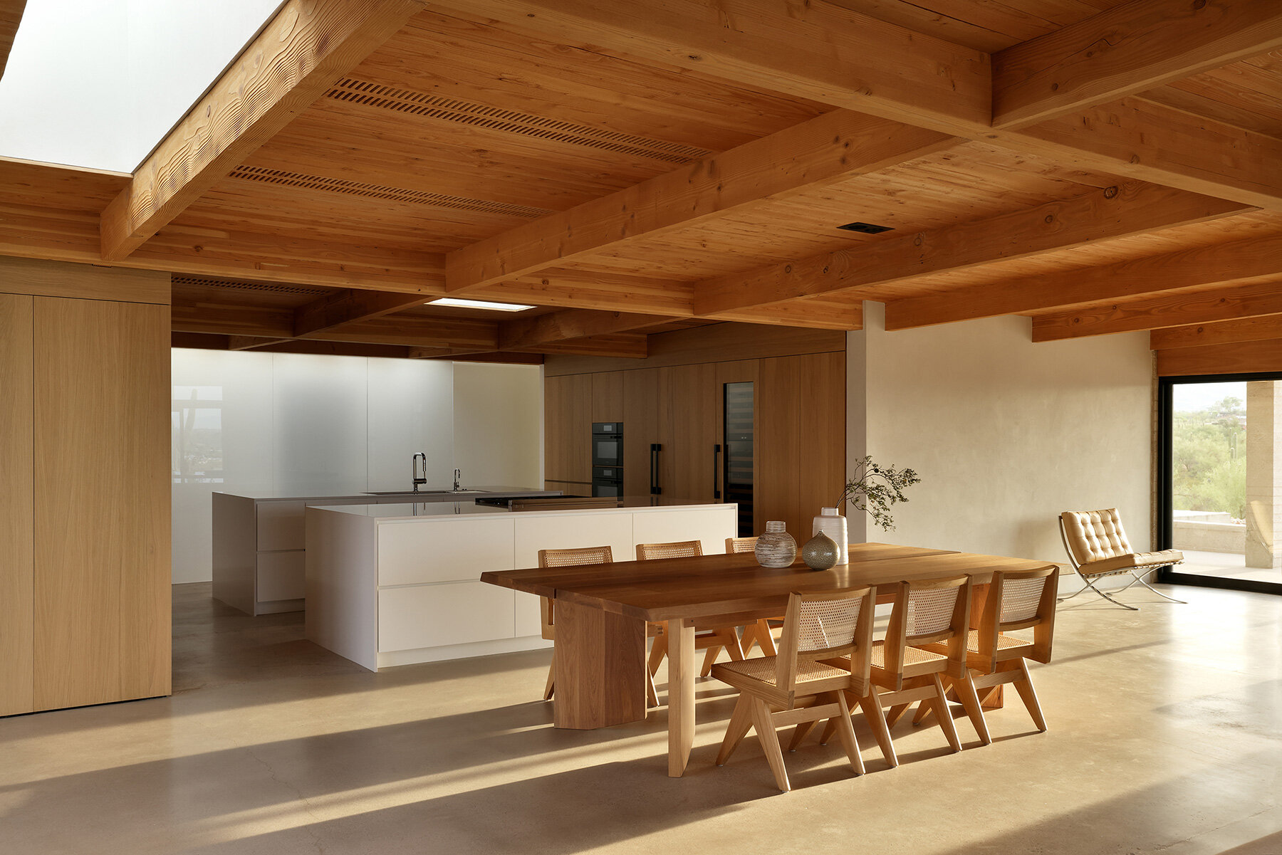 The architects at HK Associates approach the redesign of Casa Luce with the objective of enhancing natural light, removing obstructive elements, modernizing finishes, and unifying the ceiling design. The transformation prioritized connecting the home’s interior to its desert surroundings, creating an open transition between indoor and outdoor spaces. The result is a home that is both modern and deeply respectful of its original design.