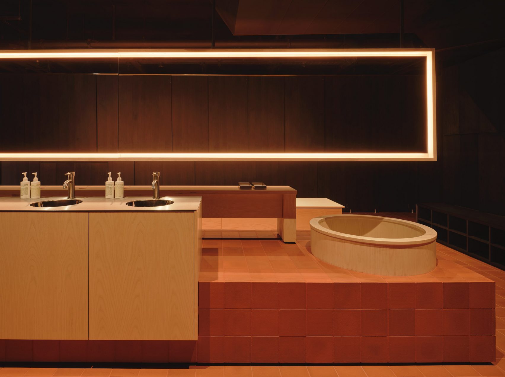 공간 전체에는 붉은색 테라코타와 짙은 청색 드레드노트(Dreadnought) 쿼리 타일이 조화를 이루며 사용되었다. 세면대, 계단식 좌석, 사우나 난로 및 아이스 배스에 동일한 타일을 적용하여 통일감을 극대화했다. 한편, 목재는 차가운 타일과 대비를 이루며 따뜻한 분위기를 더하는 요소로 활용되었다. 맞춤형 조명, 탈의실 세면대, 사우나 내부 및 원형 냉탕 벤치 등 곳곳에 배치된 목재 디테일이 공간의 유기적인 흐름을 완성한다.