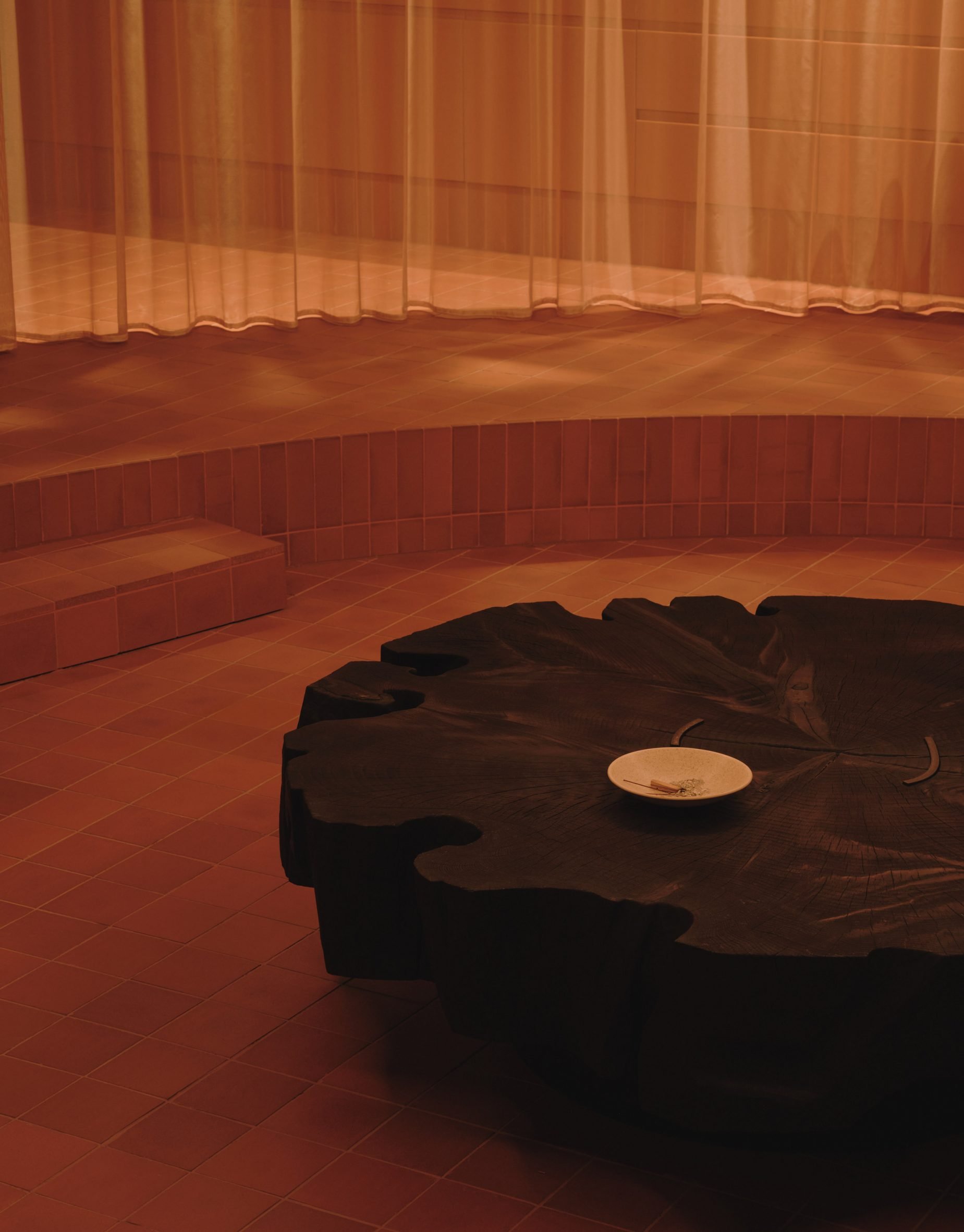 The lounge area was designed as a gathering space where guests can connect and rehydrate with cups of water or herbal teas. Its circular tiered seating is organised around a monolithic table made from a slab of cedar by sculptor Simon Gaiger.
