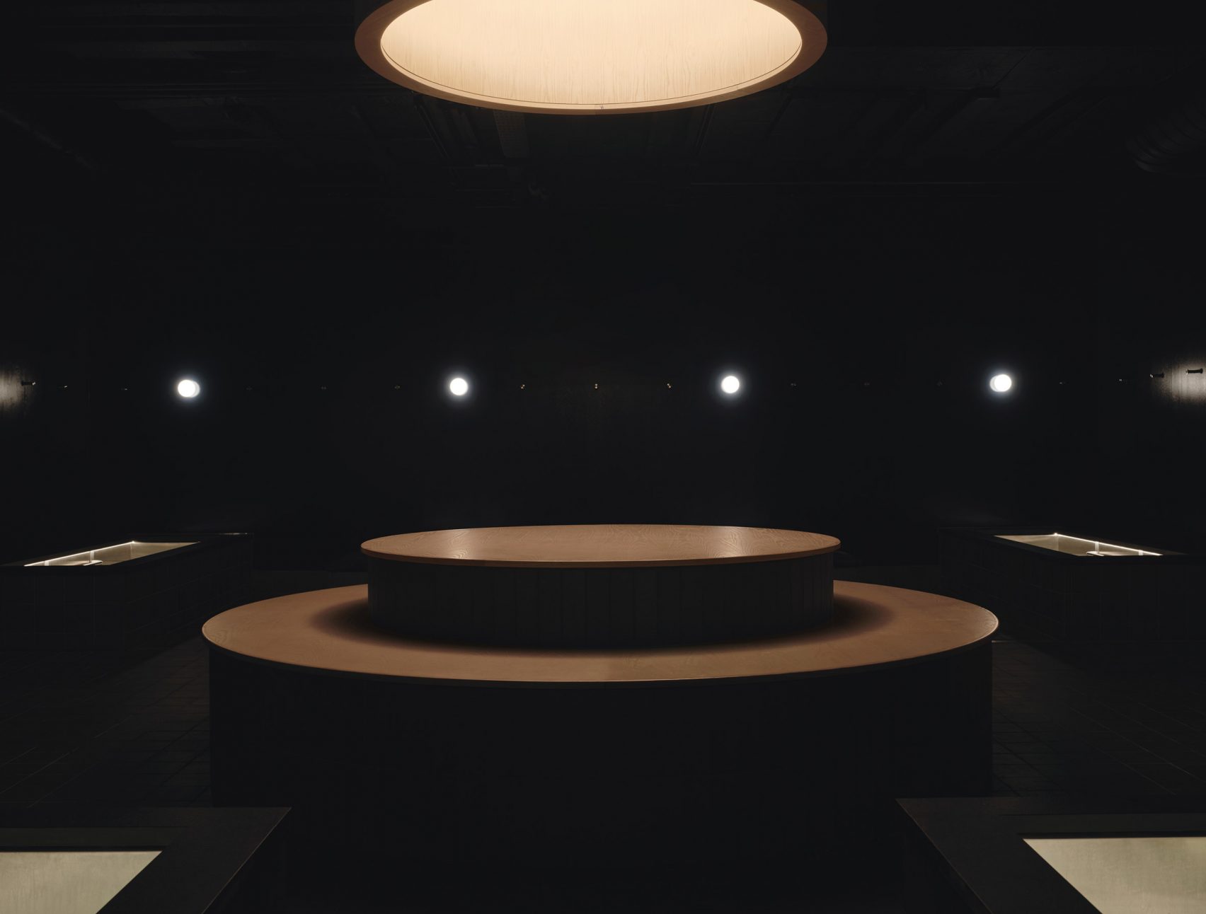 The guest experience is focused around four main spaces: a communal changing space, a circular lounge, a plunge room housing eight semi-sunken two-person ice baths, and a 65-person sauna – the largest in the UK.