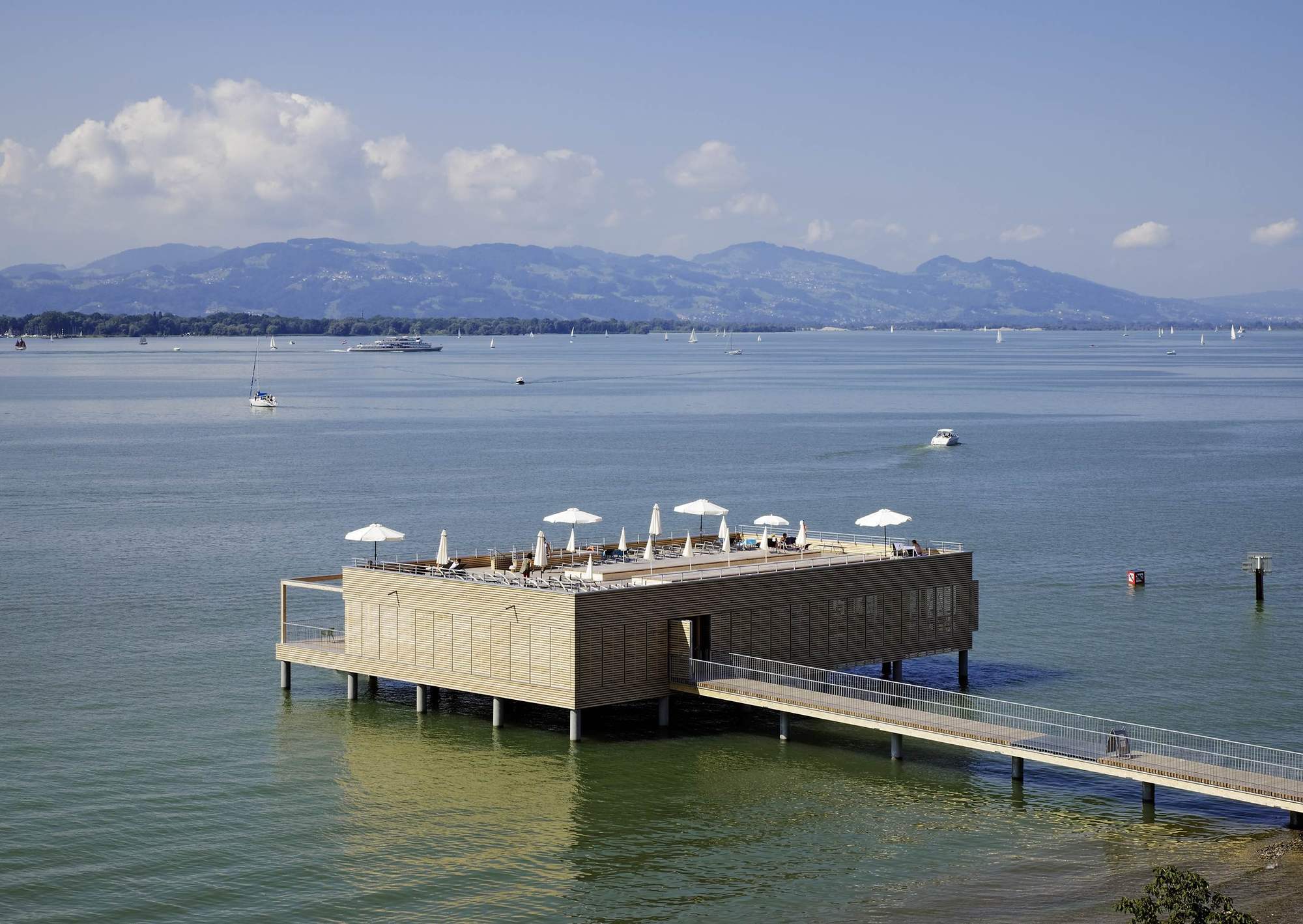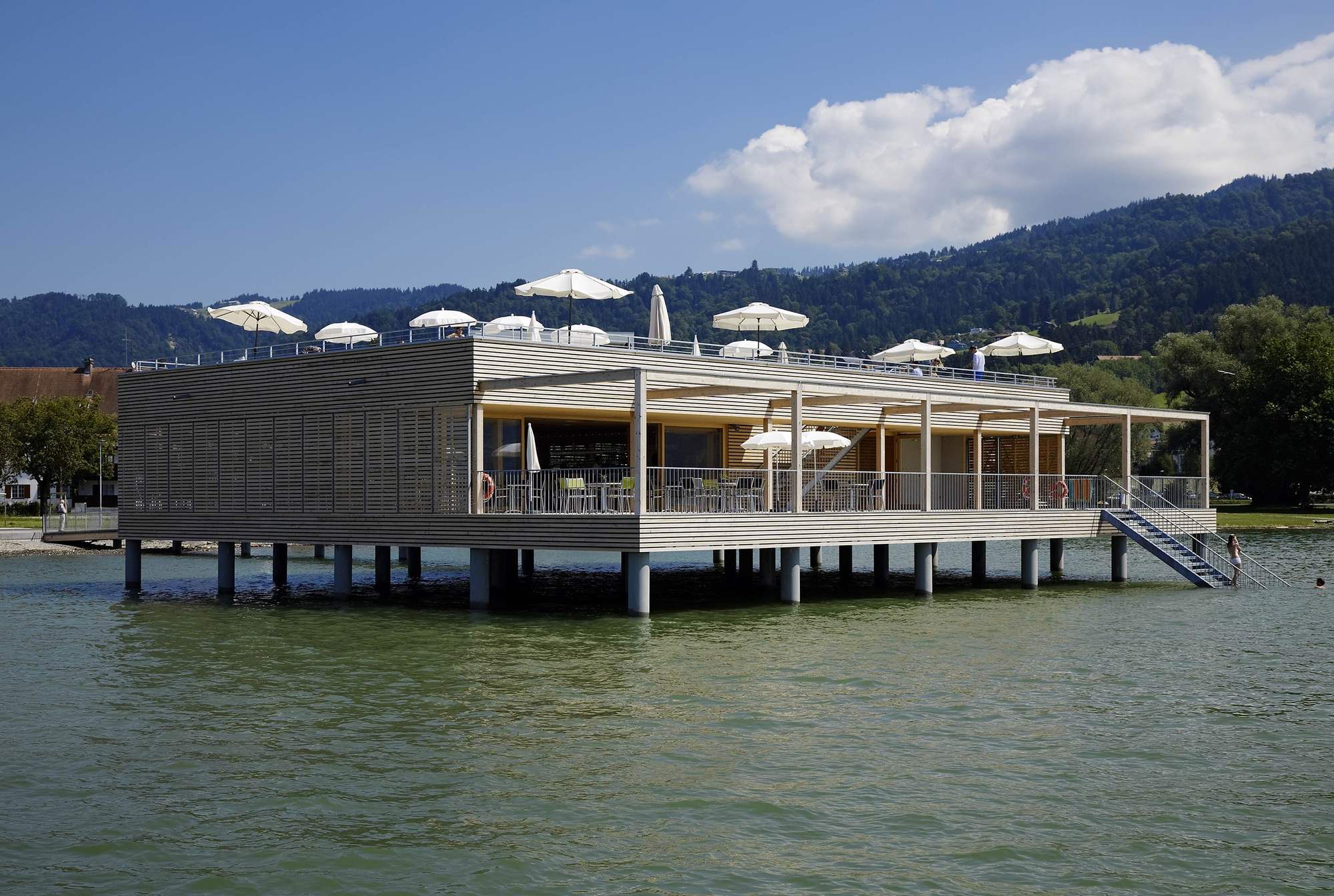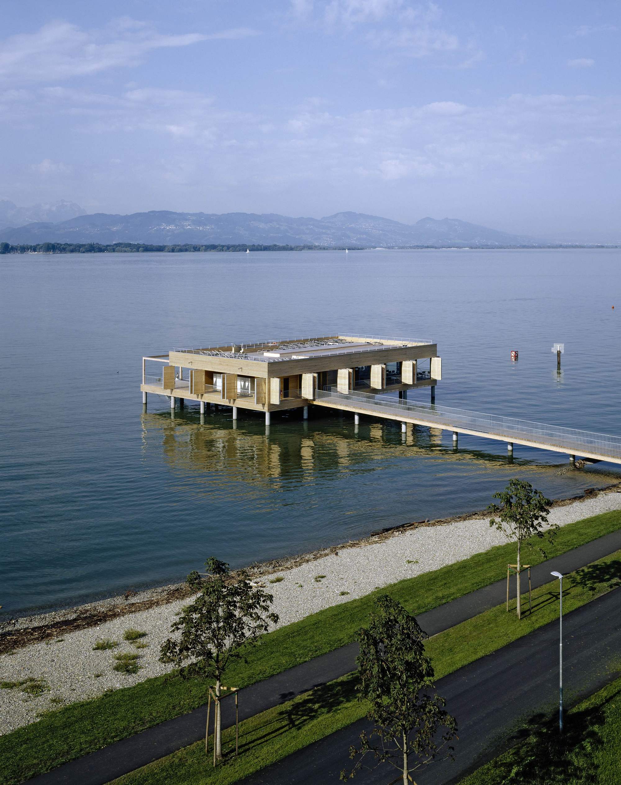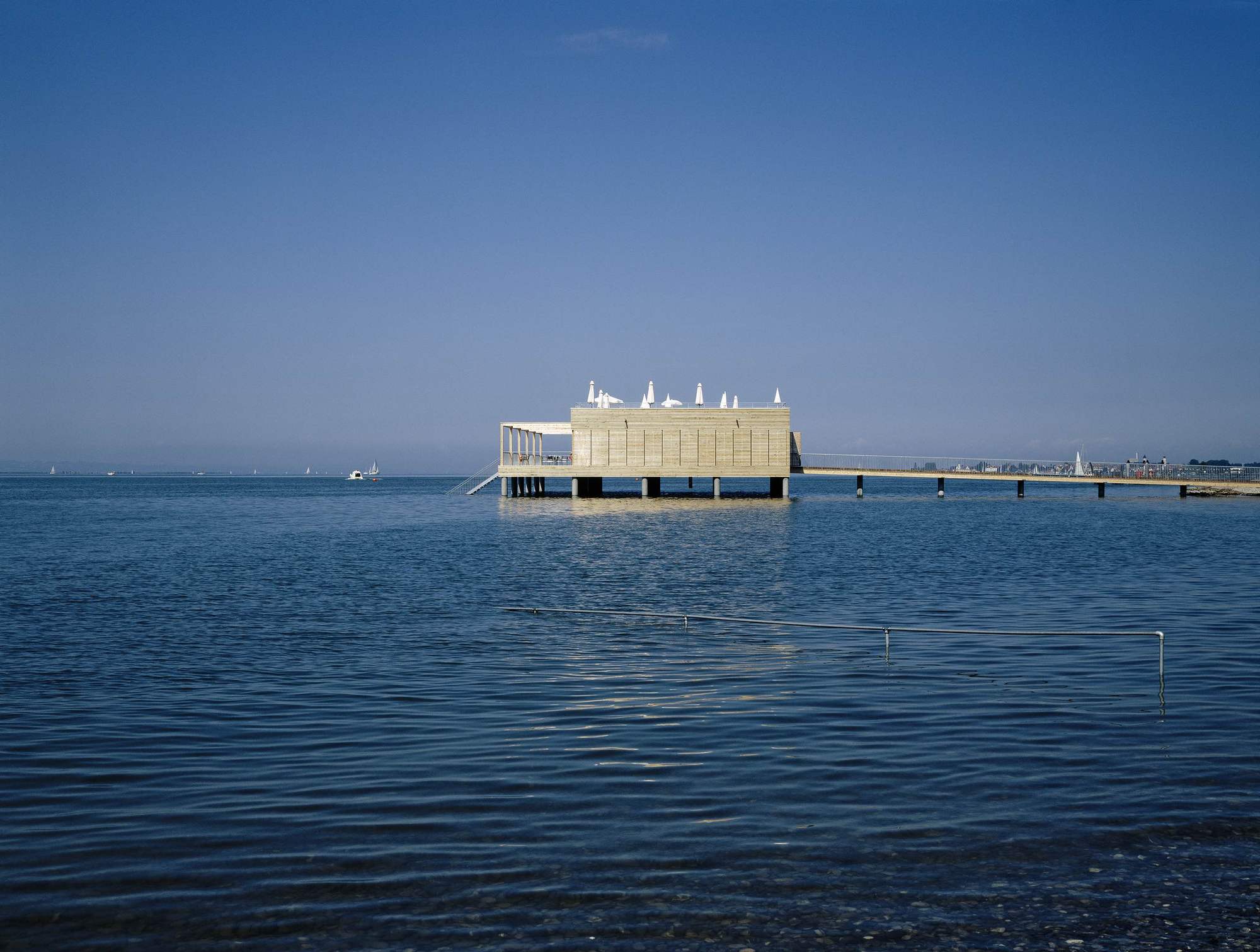 The bathhouse is, however, without a doubt, the highlight. Translated into the contemporary formal vocabulary of Vorarlberg's architecture, it convincingly continues the typology referred to as the Swabian Sea tradition. Resting atop the platform - which is supported by 30 reinforced concrete columns - is a simple, single storey structure. It houses a glazed restaurant (whose terrace provides access to the sundeck), as well as changing rooms, showers and WCs.