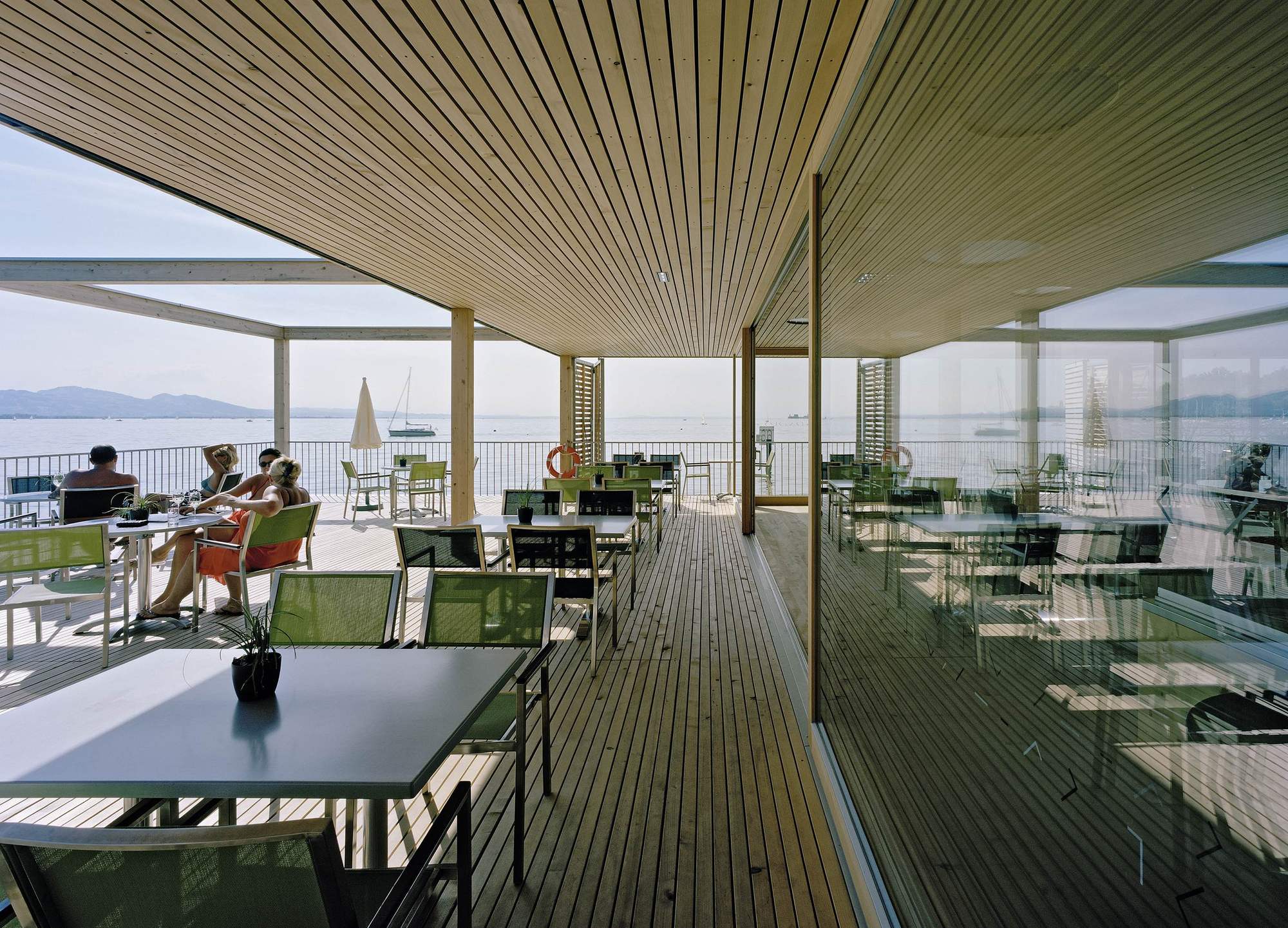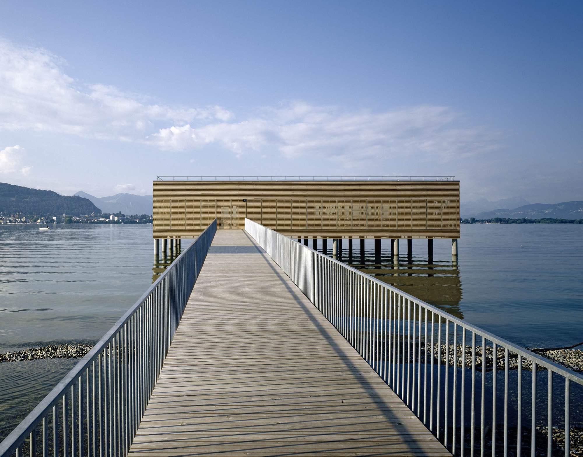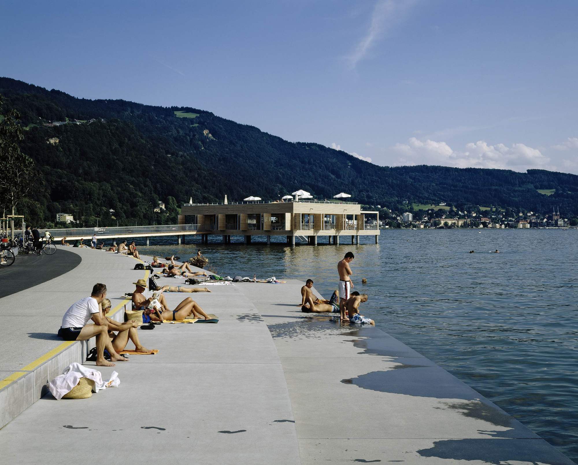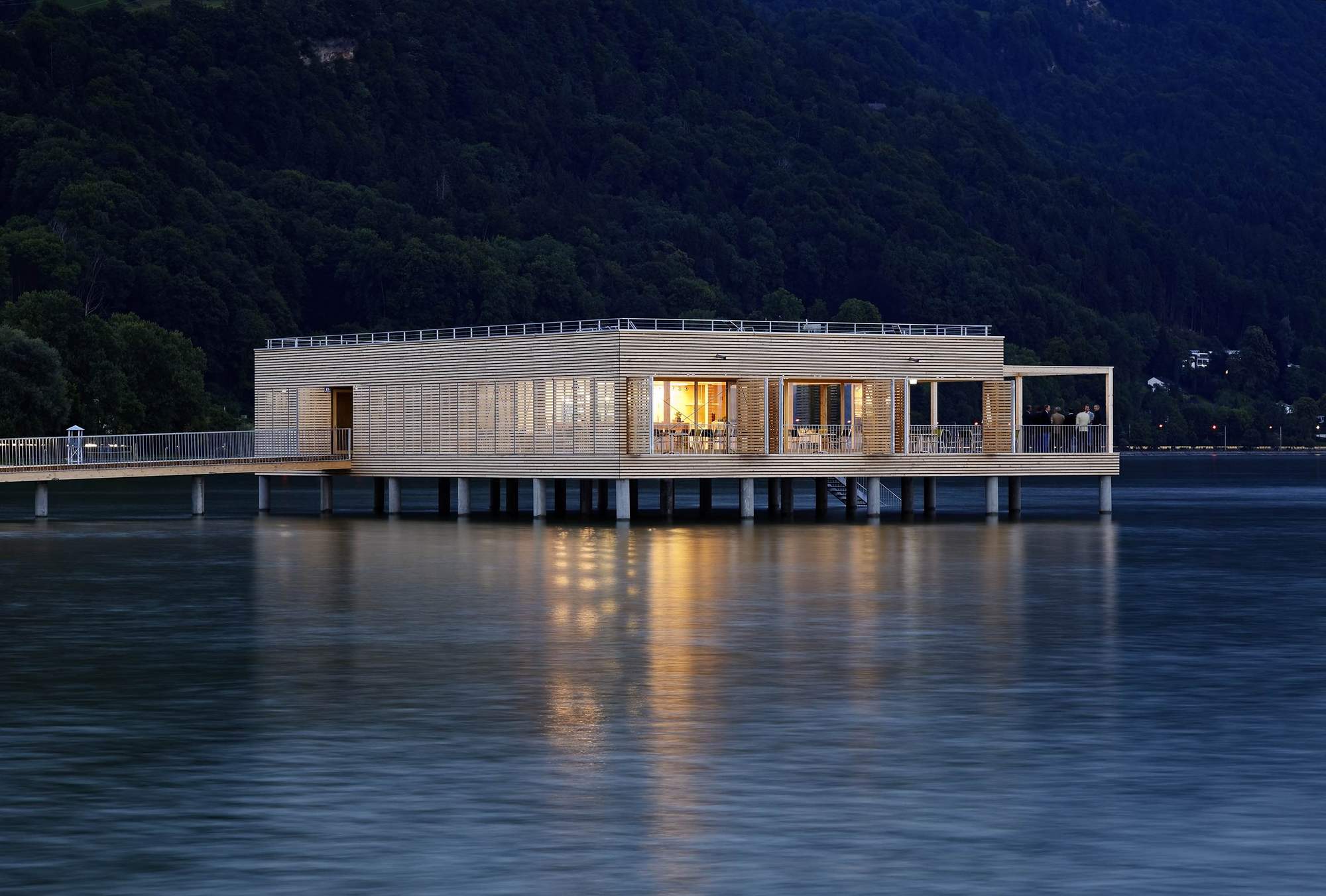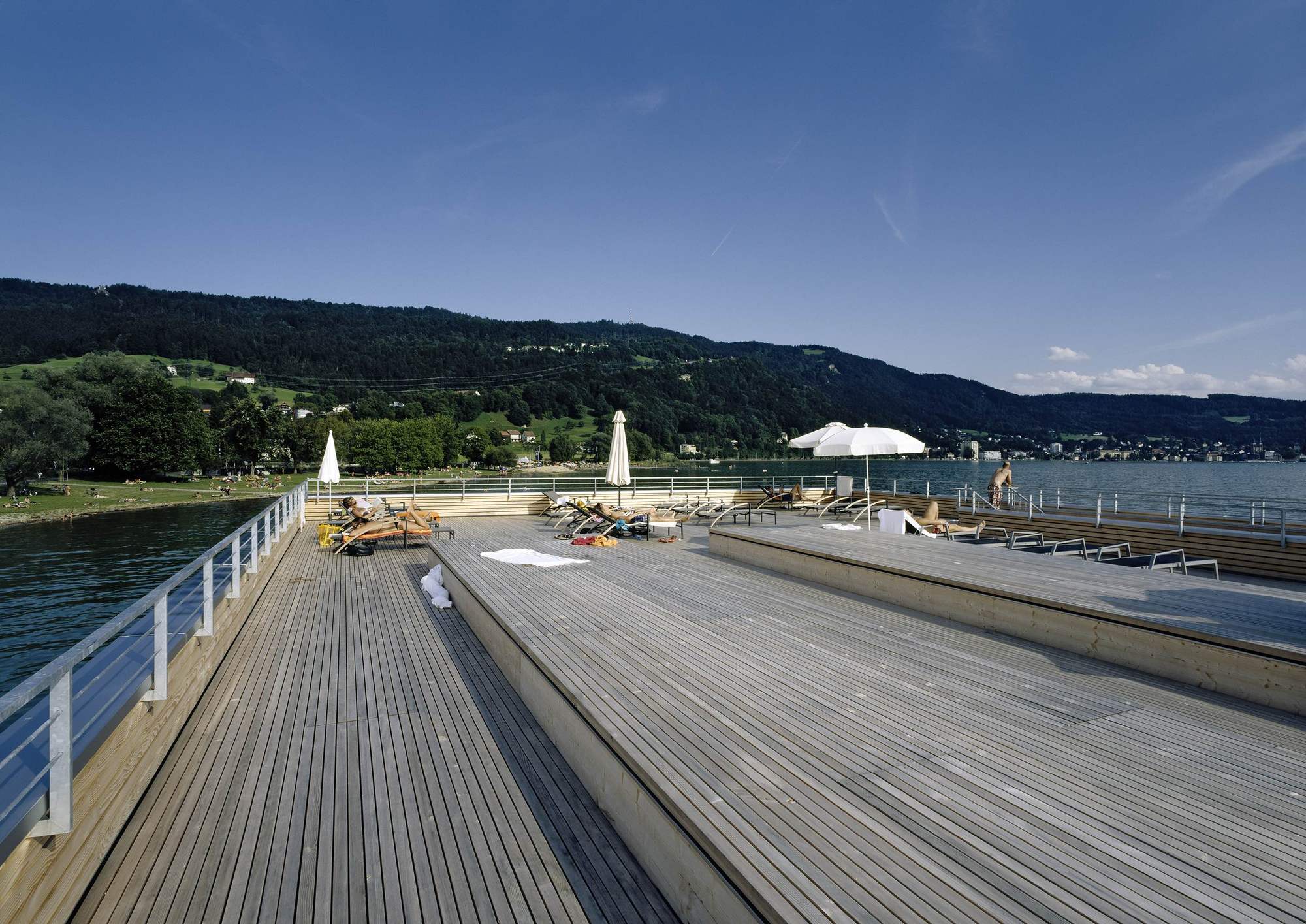 The bathhouse is, however, without a doubt, the highlight. Translated into the contemporary formal vocabulary of Vorarlberg's architecture, it convincingly continues the typology referred to as the Swabian Sea tradition. Resting atop the platform - which is supported by 30 reinforced concrete columns - is a simple, single storey structure. It houses a glazed restaurant (whose terrace provides access to the sundeck), as well as changing rooms, showers and WCs.