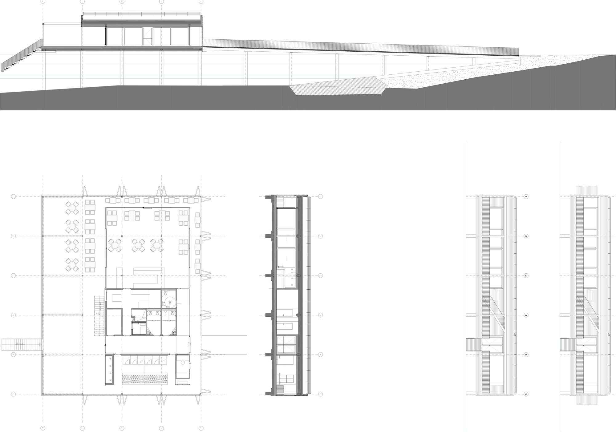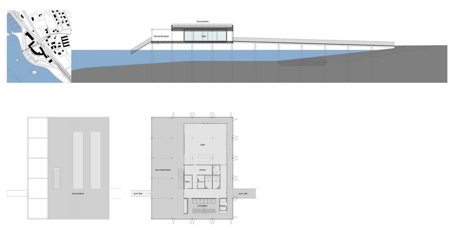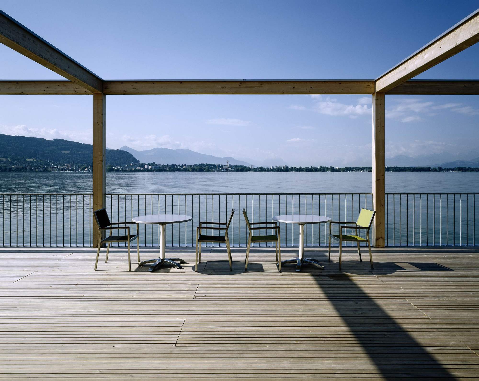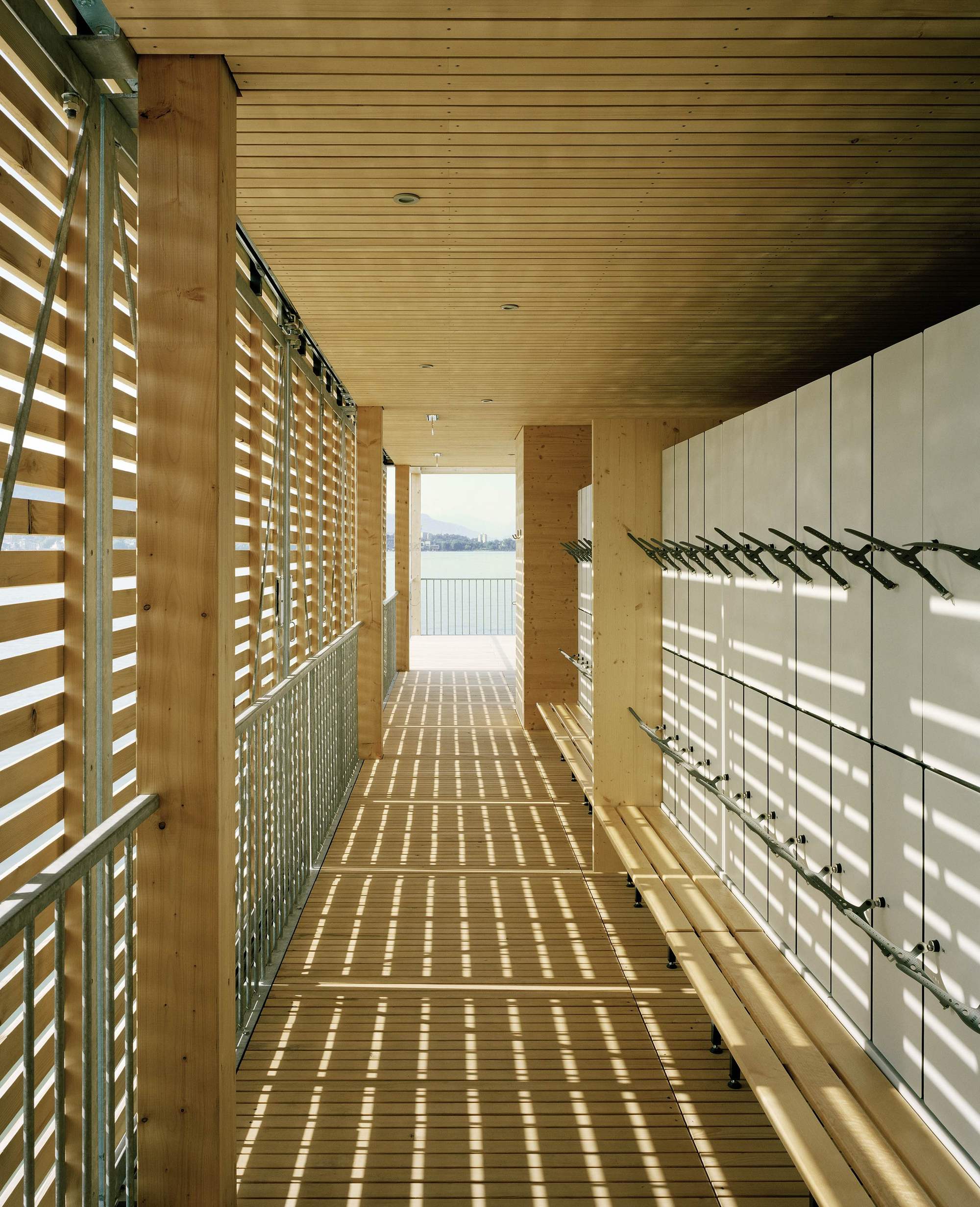 The bathhouse is, however, without a doubt, the highlight. Translated into the contemporary formal vocabulary of Vorarlberg's architecture, it convincingly continues the typology referred to as the Swabian Sea tradition. Resting atop the platform - which is supported by 30 reinforced concrete columns - is a simple, single storey structure. It houses a glazed restaurant (whose terrace provides access to the sundeck), as well as changing rooms, showers and WCs.