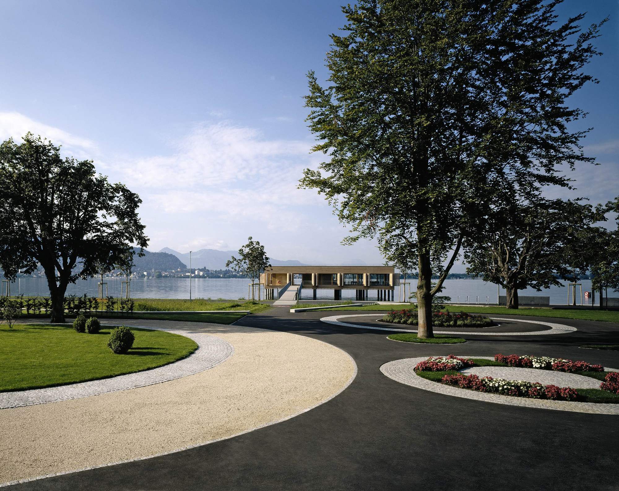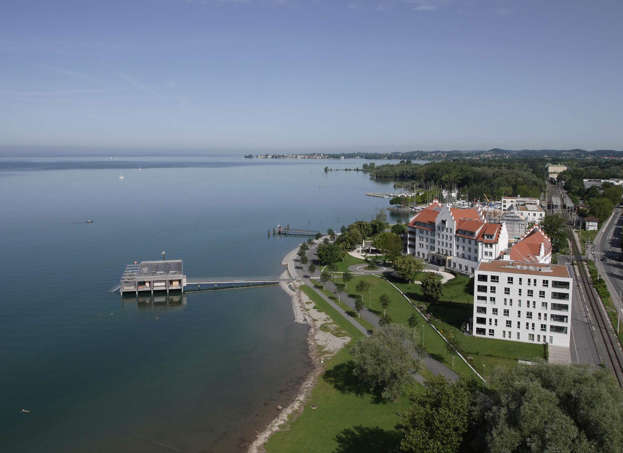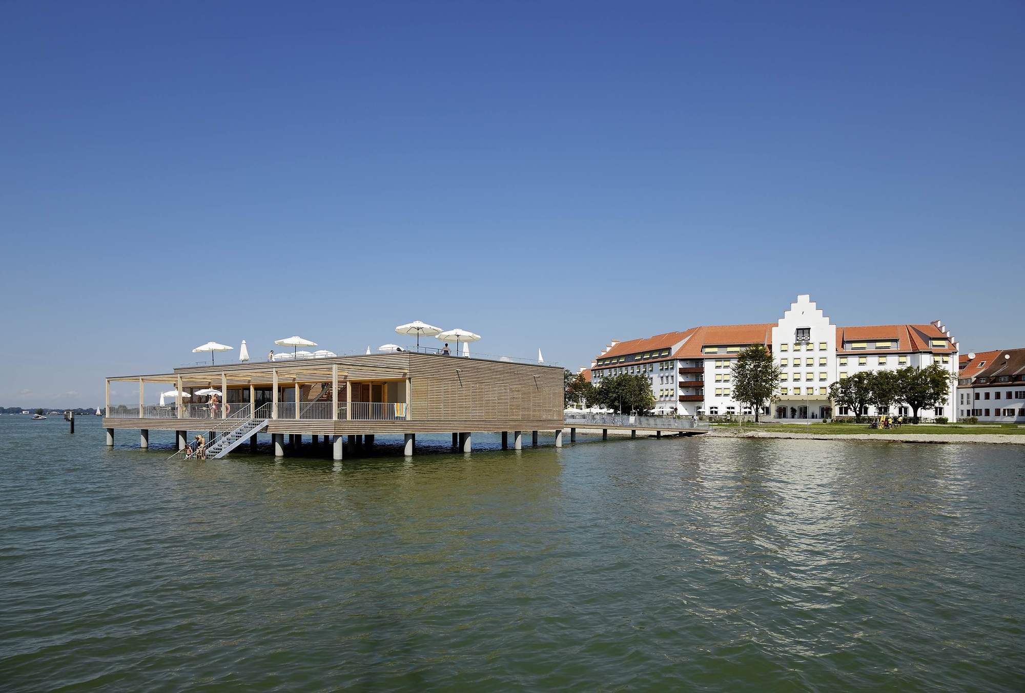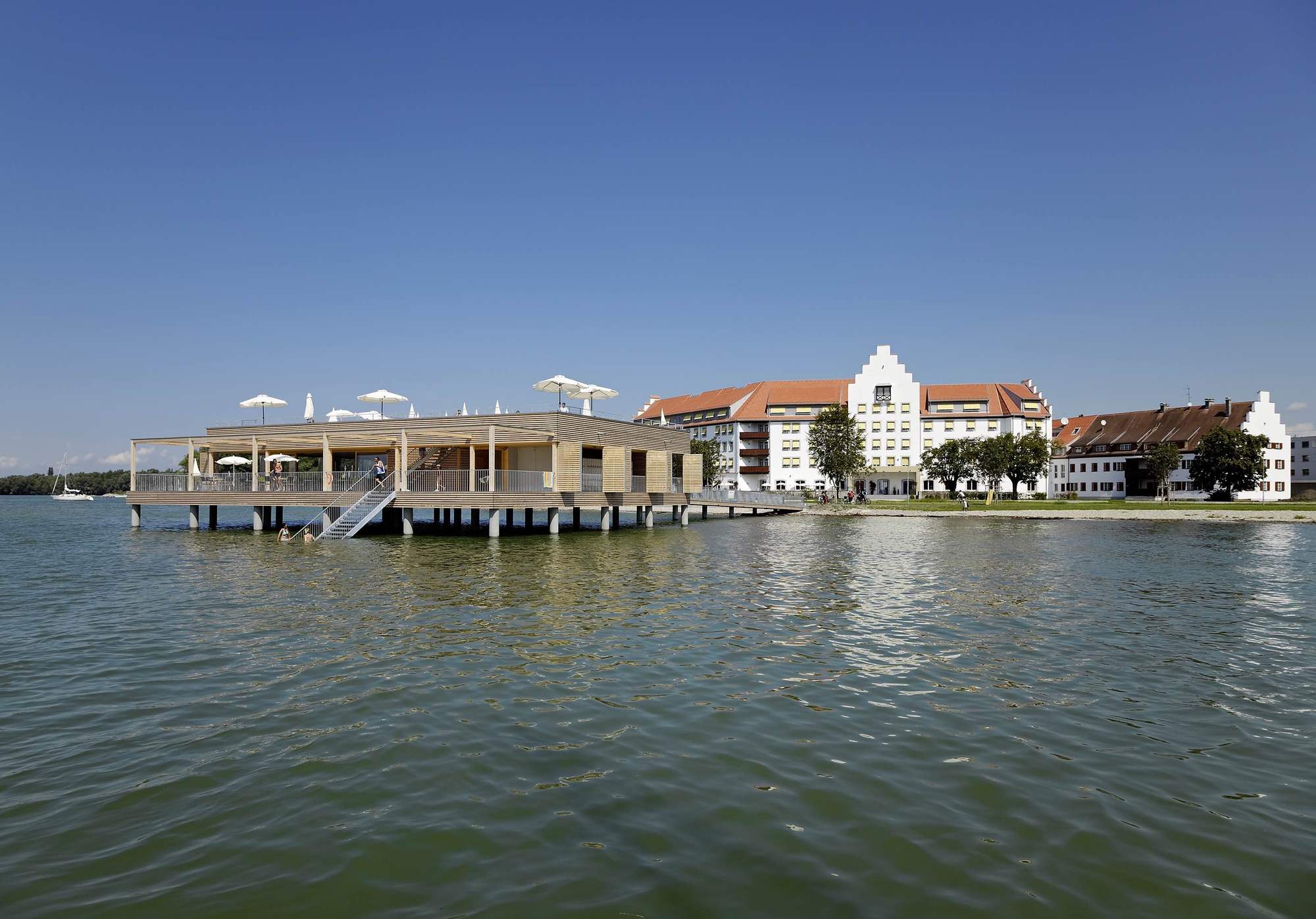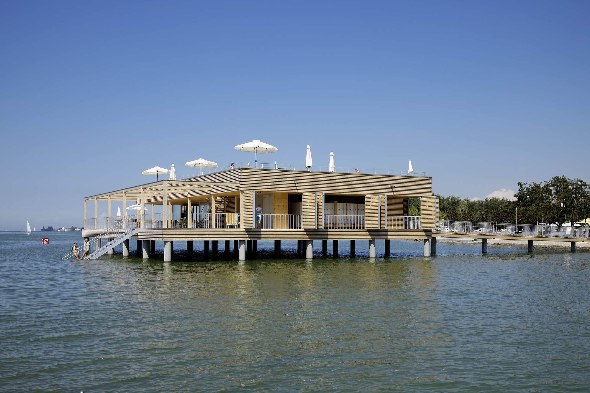 이 프로젝트의 중심에는 단연 베스 하우스(Bathhouse)가 있다. 포어아를베르크(Vorarlberg) 지역의 현대적 건축 언어를 반영한 이 공간은 '슈바벤 해(Swabian Sea) 전통'을 존중하는 건축 언어를 바탕으로 기능성과 미학을 함께 표현한다. 30개의 철근 콘크리트 기둥 위에 자리 잡은 단층 구조물은 단순하면서도 세련된 디자인이 조화를 이루며, 내부에는 탁 트인 유리창을 통해 자연과 조화를 이루는 레스토랑(테라스를 통해 일광욕 데크로 연결됨), 탈의실, 샤워실 및 화장실이 효율적으로 배치되어 있다.