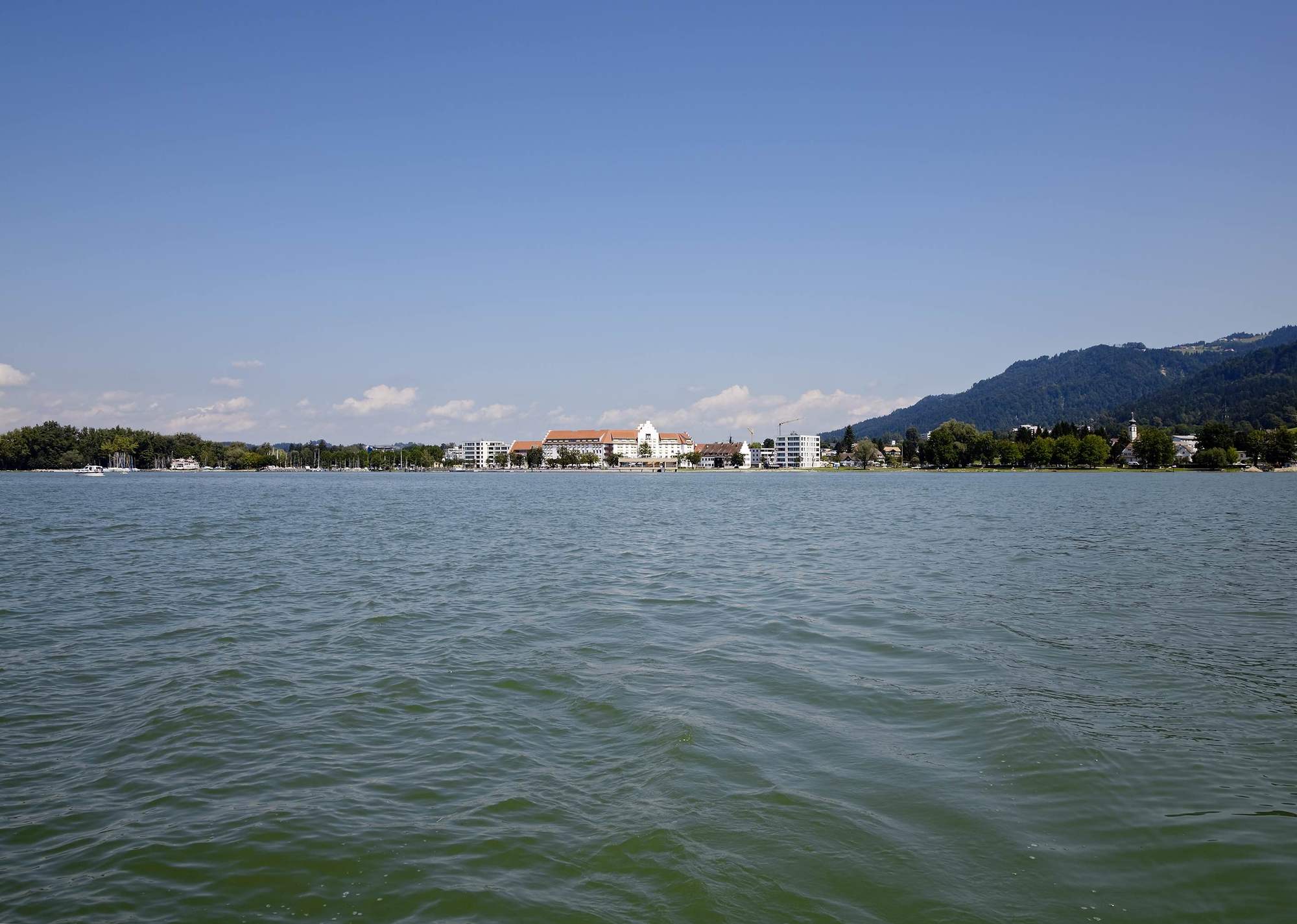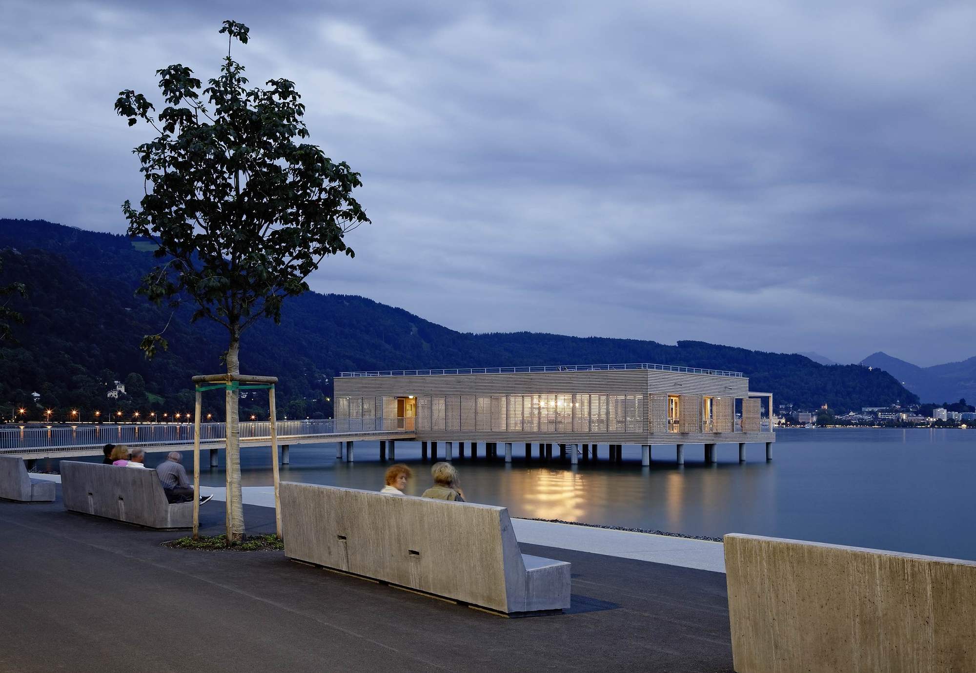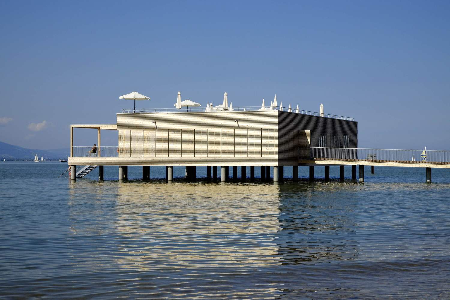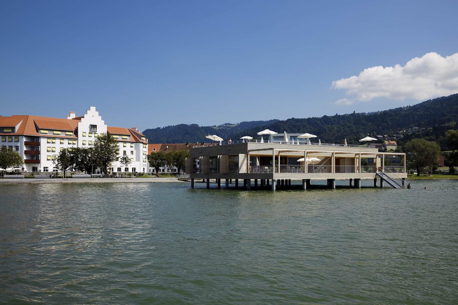 The "Am Kaiserstrand" bathhouse in western Austria offers spectacular views of the Bay of Bregenz, Pfaender Mountain and the foothills of the Swiss Alps. A 42 metre long pier connects the pile structure situated on the eastern coast of Lake Constance to the recreational zone of the same name on shore. The revitalisation of the entire complex has also just been completed: the coastal promenade was extended, new pedestrian and bike paths were laid out, and a historic hotel complex was refurbished.