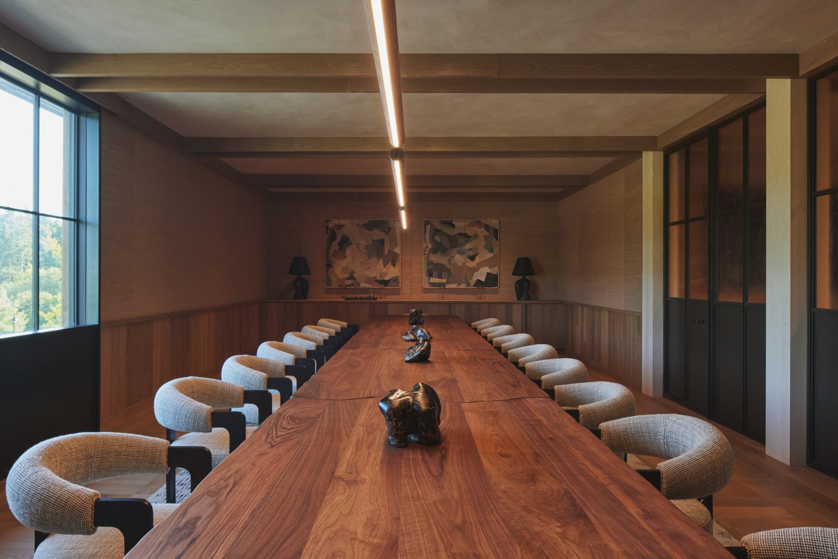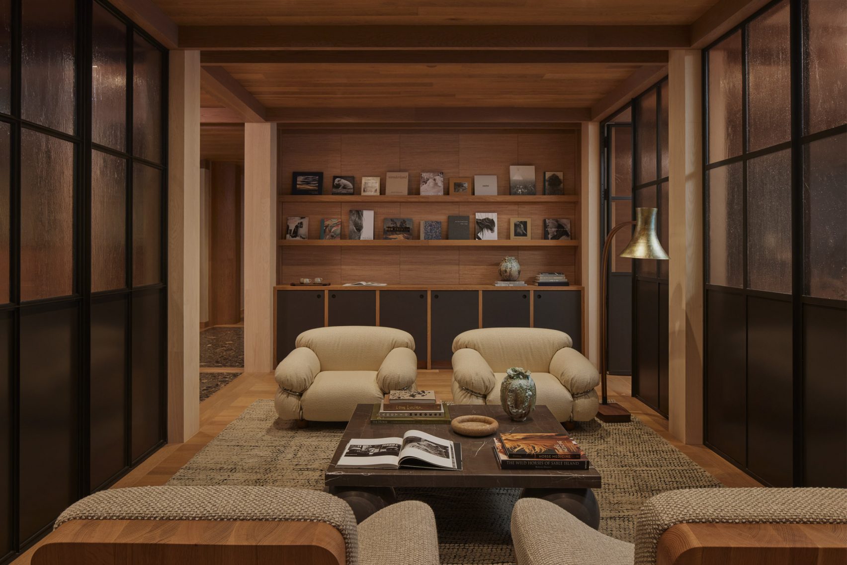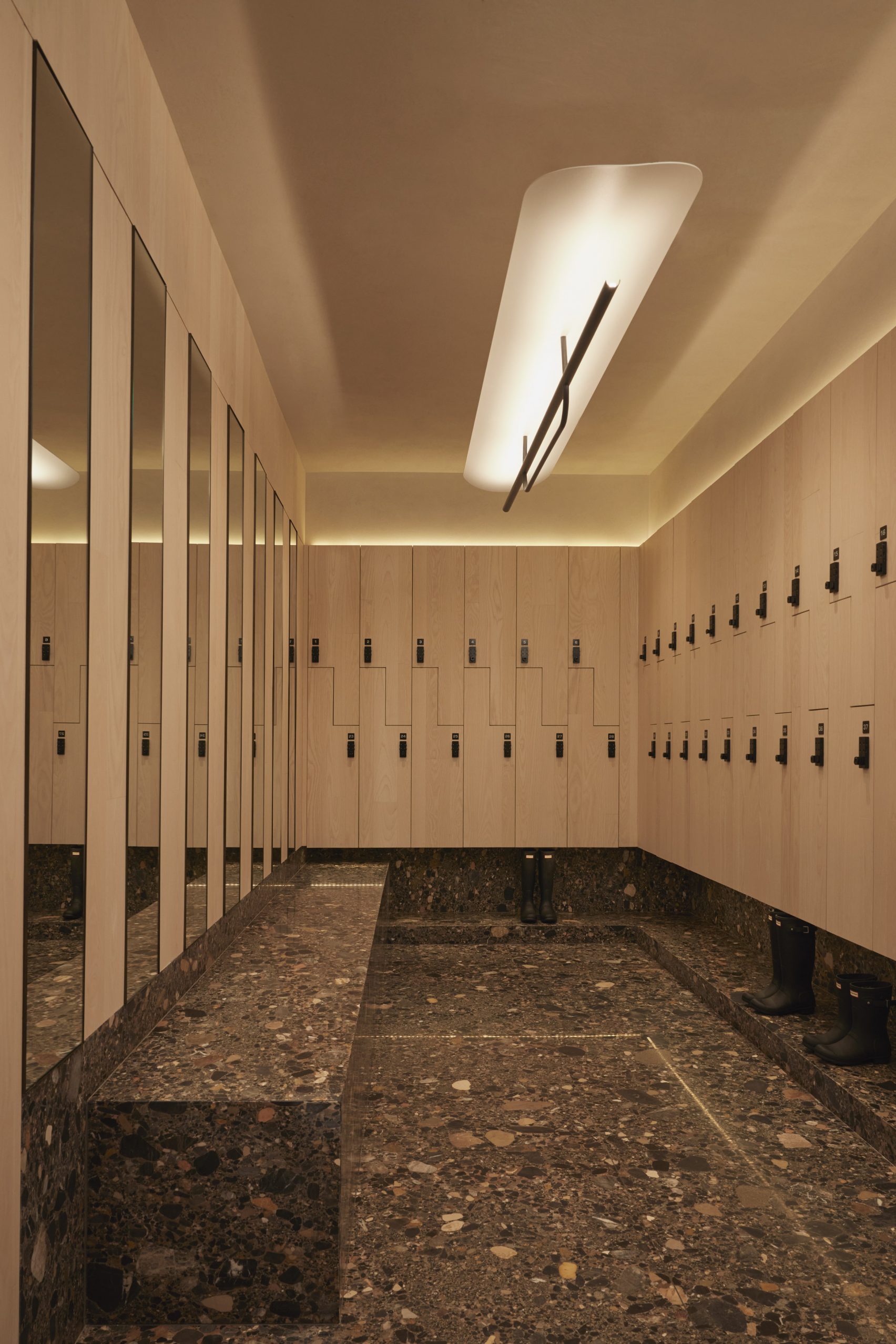 Elsewhere, locker rooms were finished with blocks of chocolate hued terrazzo. Wearstler dressed the waiting areas and meeting rooms with plump low-slung seating and an abundance of wood to reinforce a sense of calm.