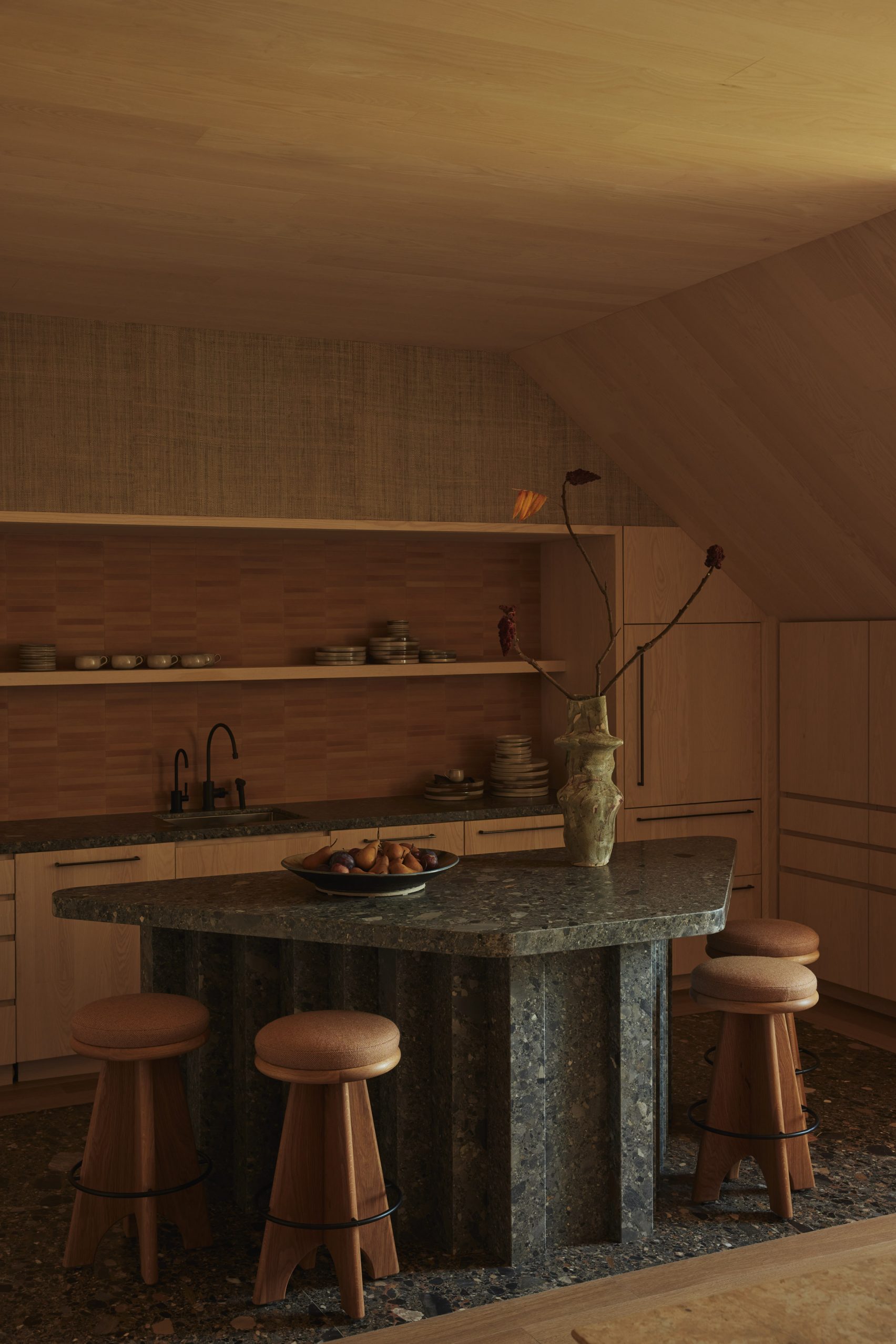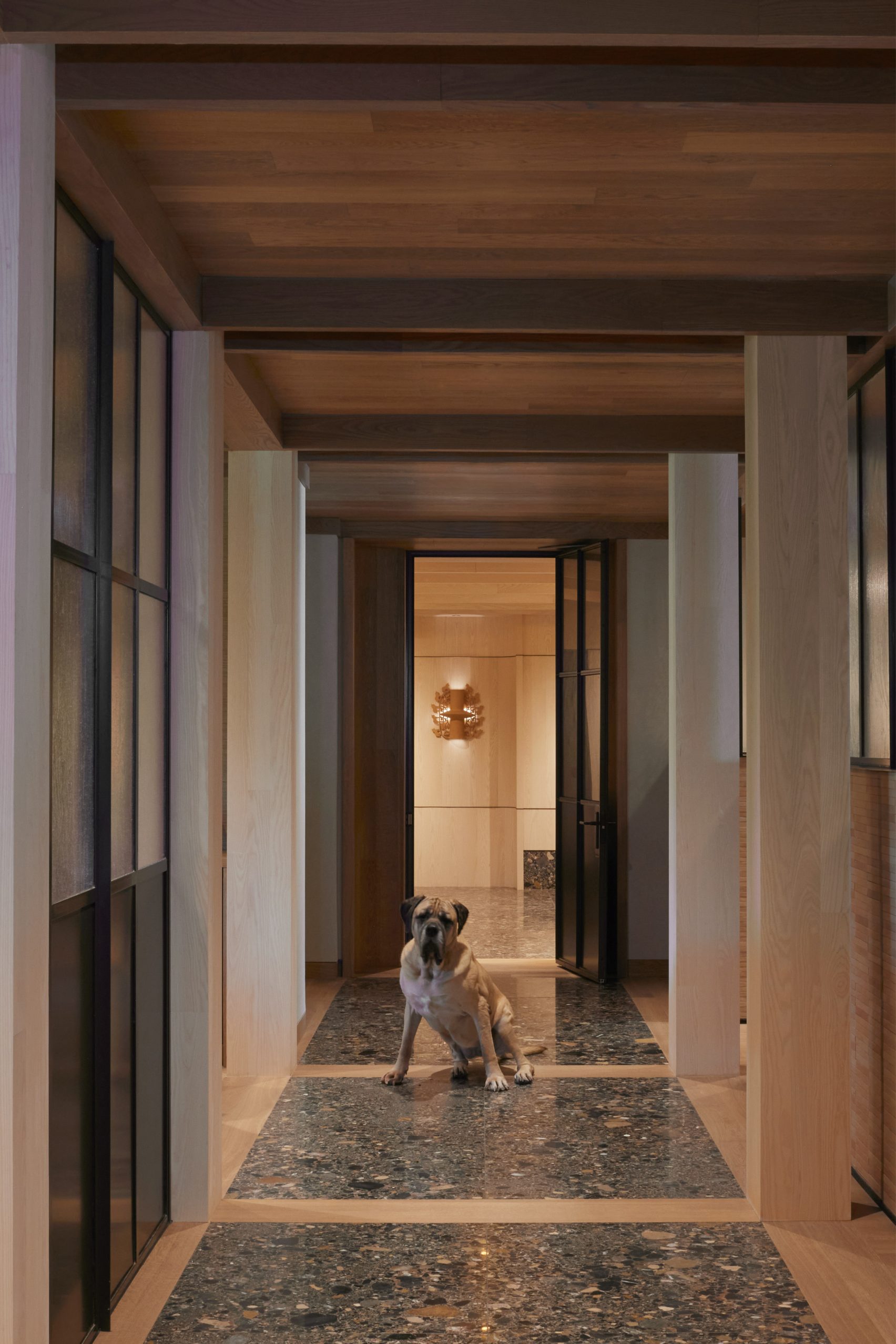 병원 전체에는 동물과 주인 모두를 편안하게 하기 위해 인레이 석재, 따뜻한 목재, 세라믹이 층층이 적용되었습니다. 검사실에는 몬태나 디자이너 켈시 루돌프의 맞춤형 투박한 벤치가, 식당 공간에는 뉴저지 아티스트 케이시 맥카퍼티가 수작업으로 조각한 8미터 길이의 테이블이 배치되었습니다. 이들 모두 비정형적 형태와 질감이 특징인 웨어슬러 스타일의 가구입니다. 락커룸은 초콜릿 색조의 테라조 블록으로 마감되었으며, 대기 공간과 회의실에는 포근한 낮은 좌석과 풍부한 목재가 배치되어 고요함을 강조했습니다.