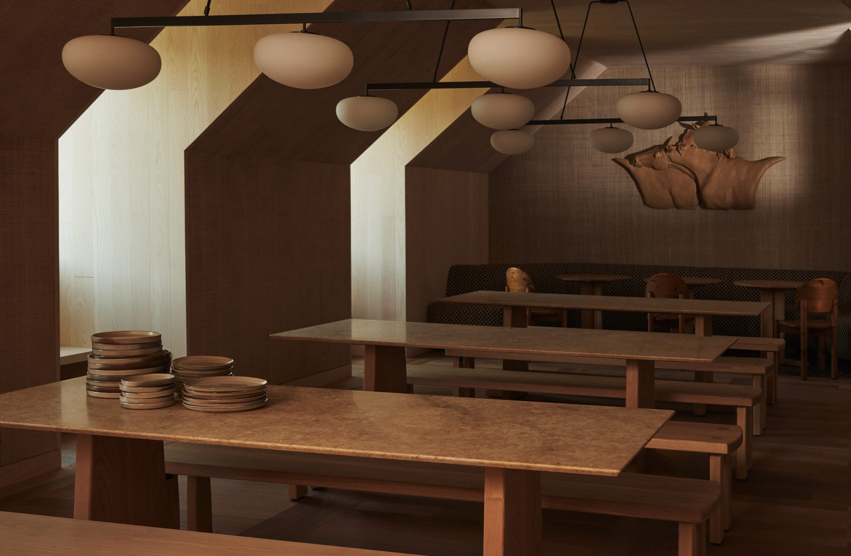Examination rooms were fitted with custom chunky benches by Montana designer Kelsie Rudolph while an eight-metre table, hand-carved by New Jersey artist Casey MacCafferty, was placed in the dining area.