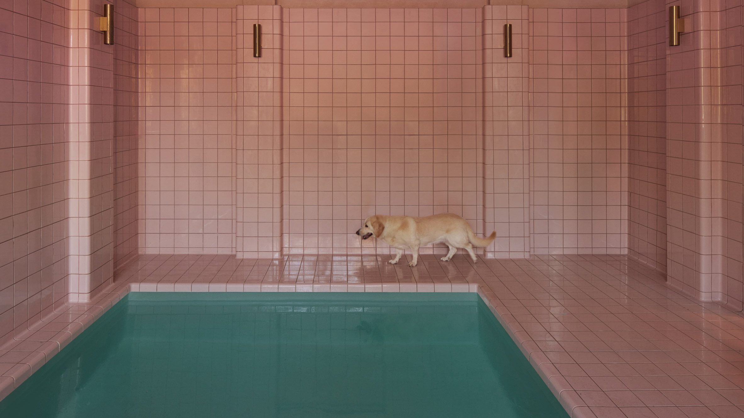 Central to the hospital is a pale pink hydrotherapy room clad in gleaming D tiles, which sit pleasingly alongside a geometric turquoise swimming pool.