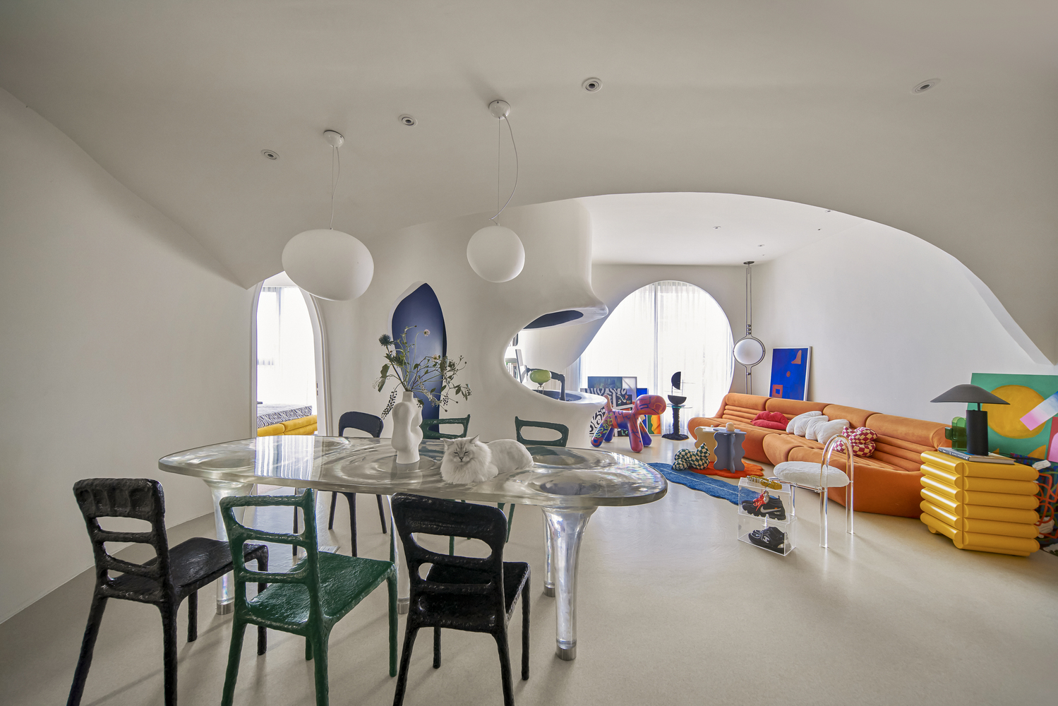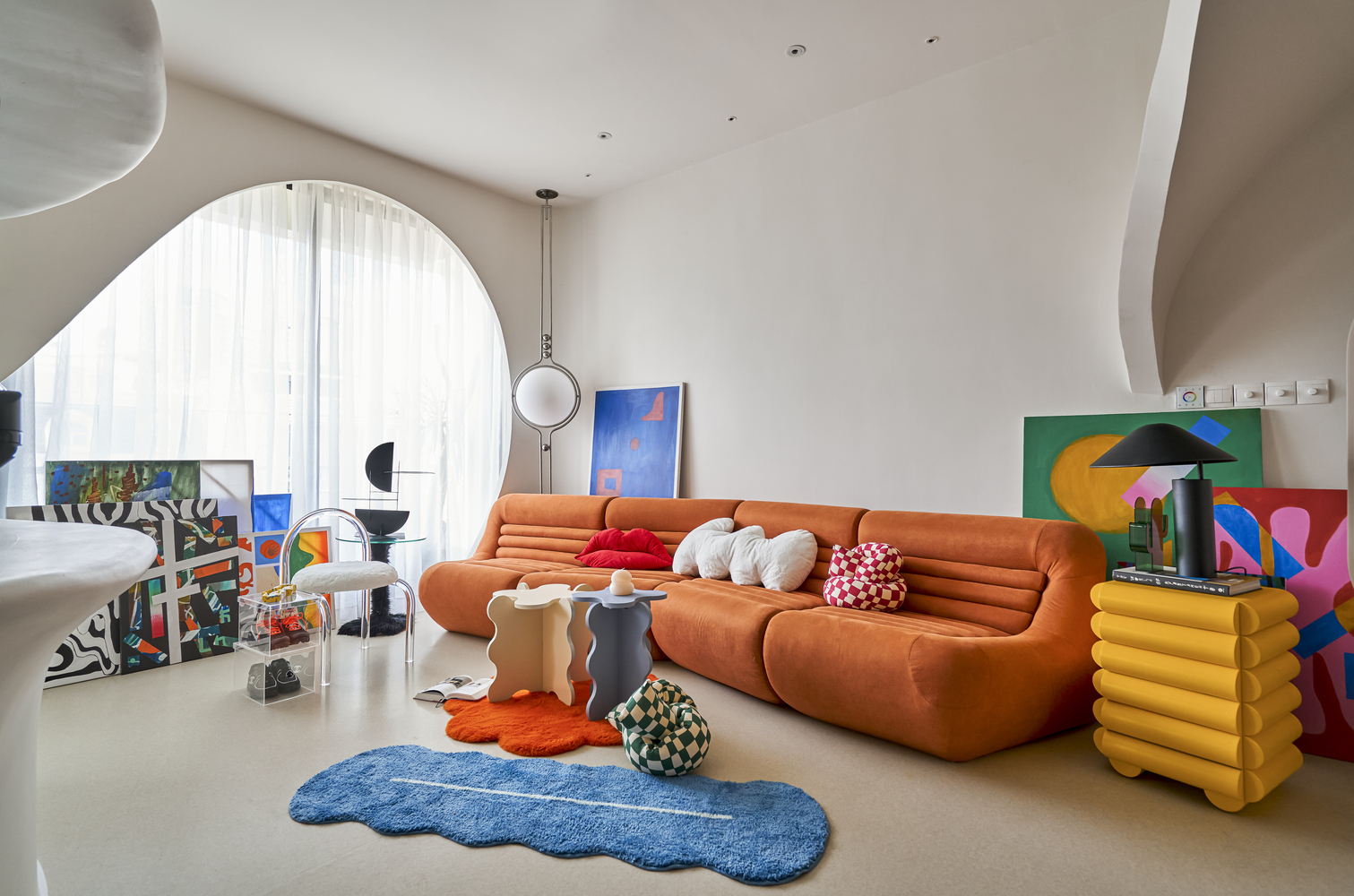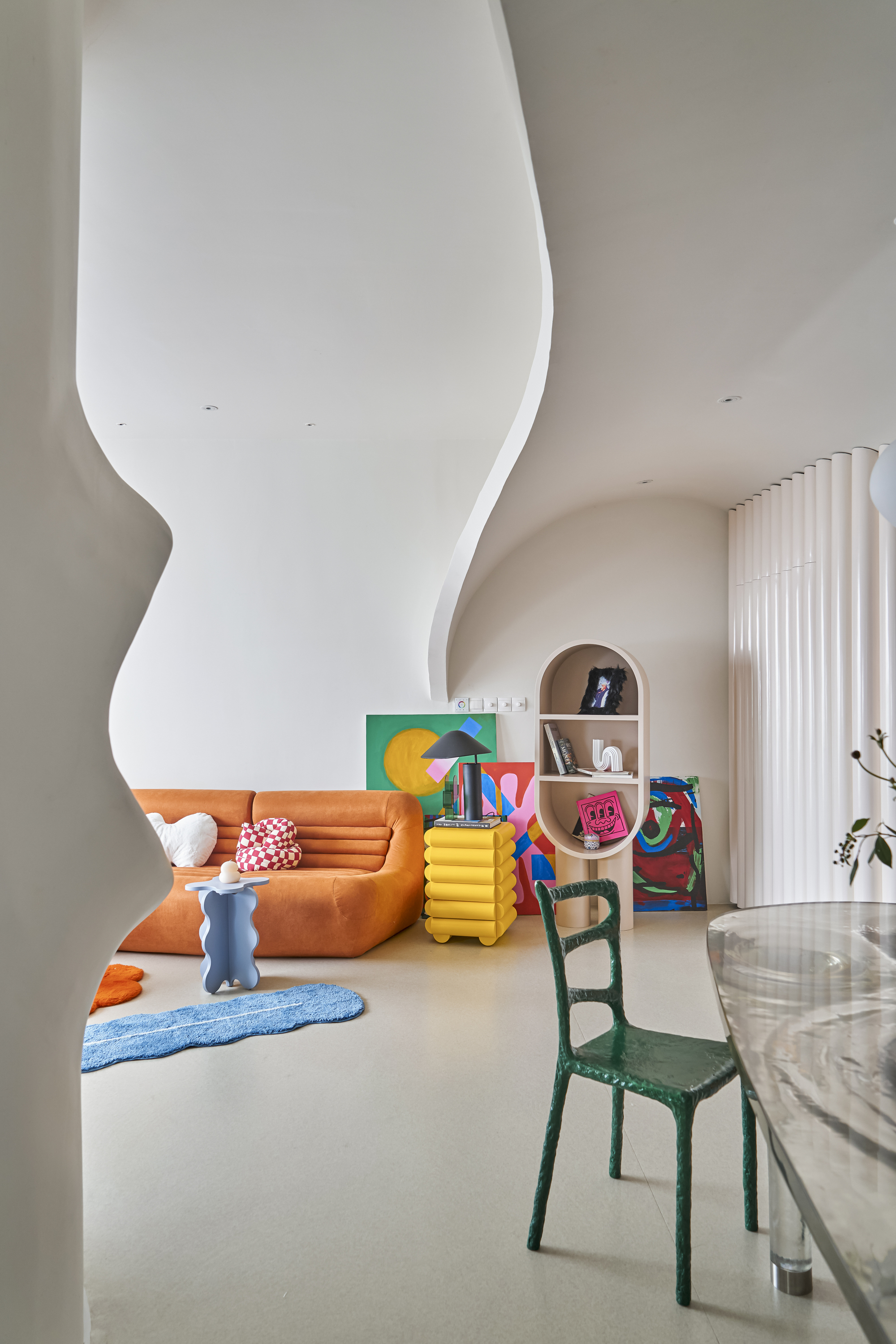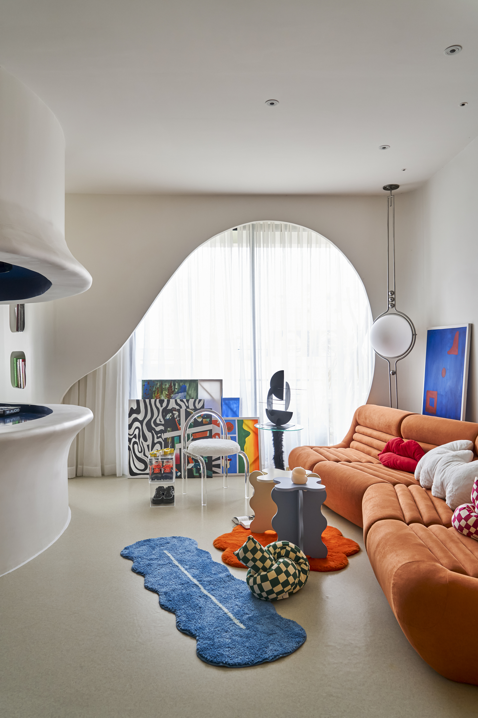 작은 동굴의 맞은편에는 거실이 위치한다. 흰색을 기본으로 한 아파트에 강렬한 생동감을 불어넣는 주황색 대형 소파가 시선을 사로잡는다. 이는 우주 시대(Space-Age) 디자인 언어에서 영감을 받은 것으로, 둥근 형태와 선명한 색상이 공간에 활기를 더한다.