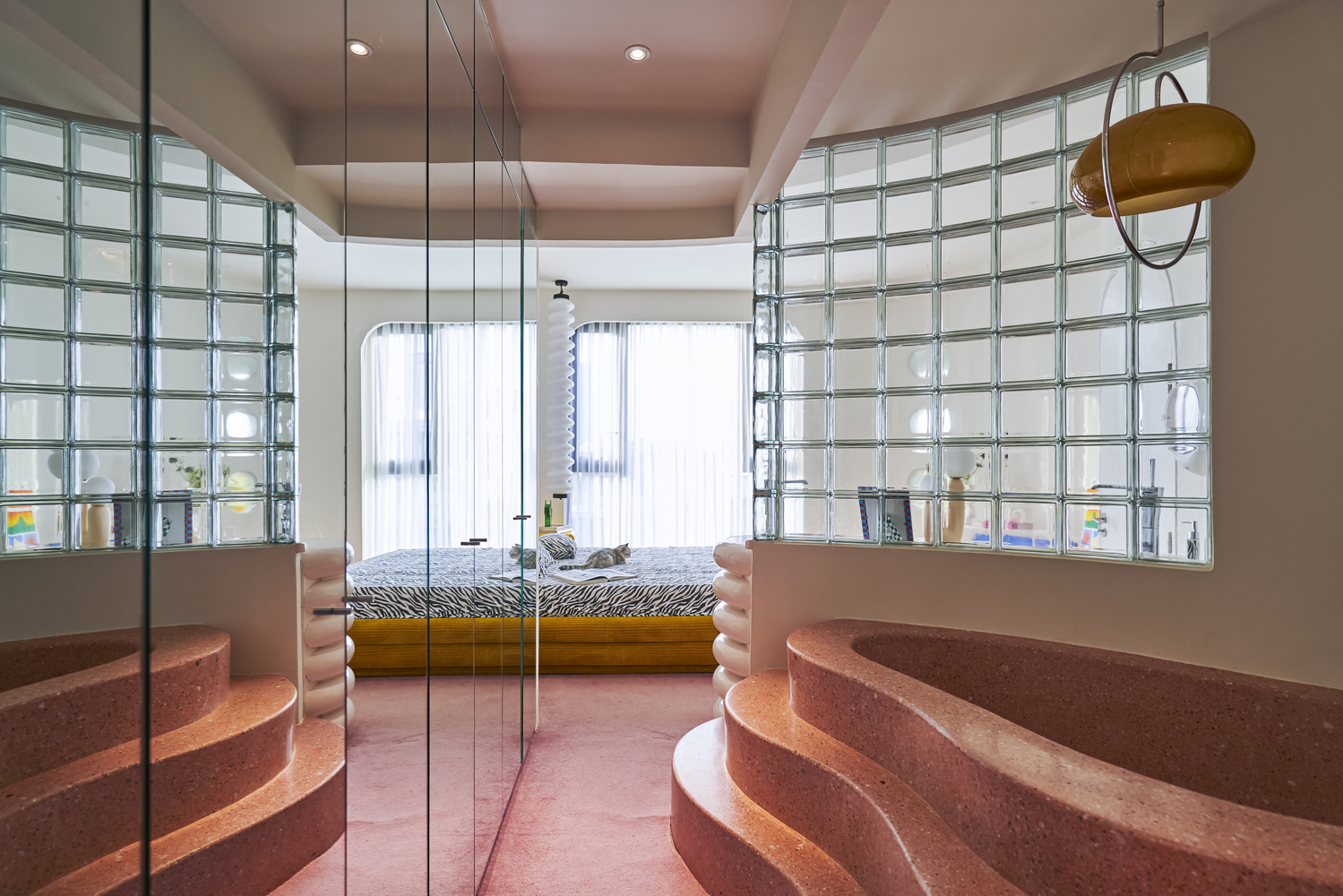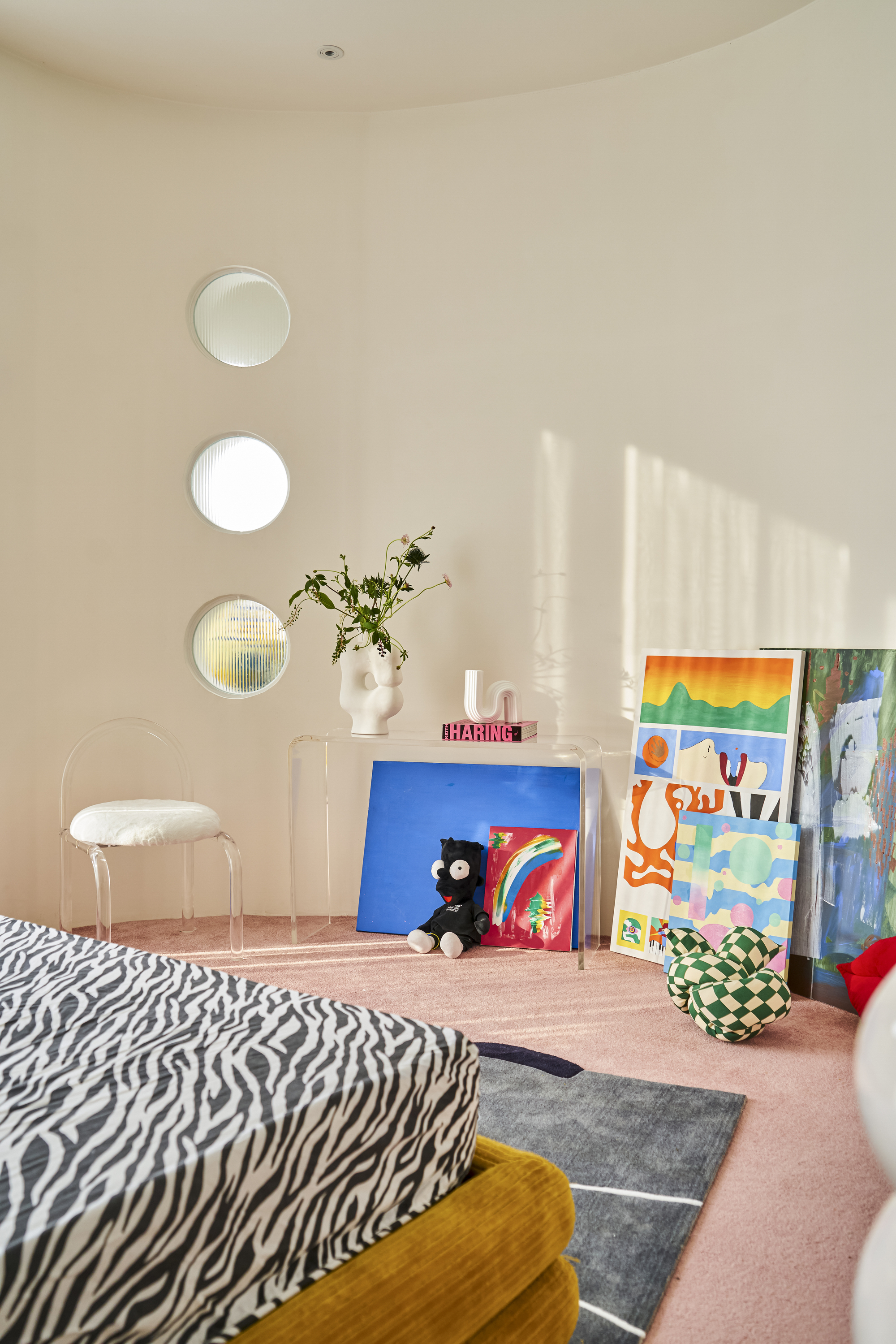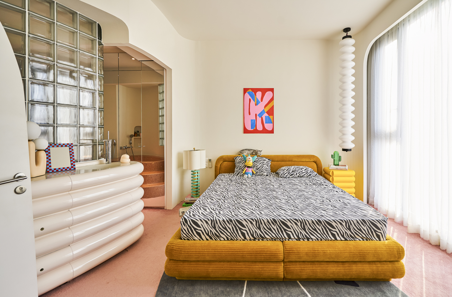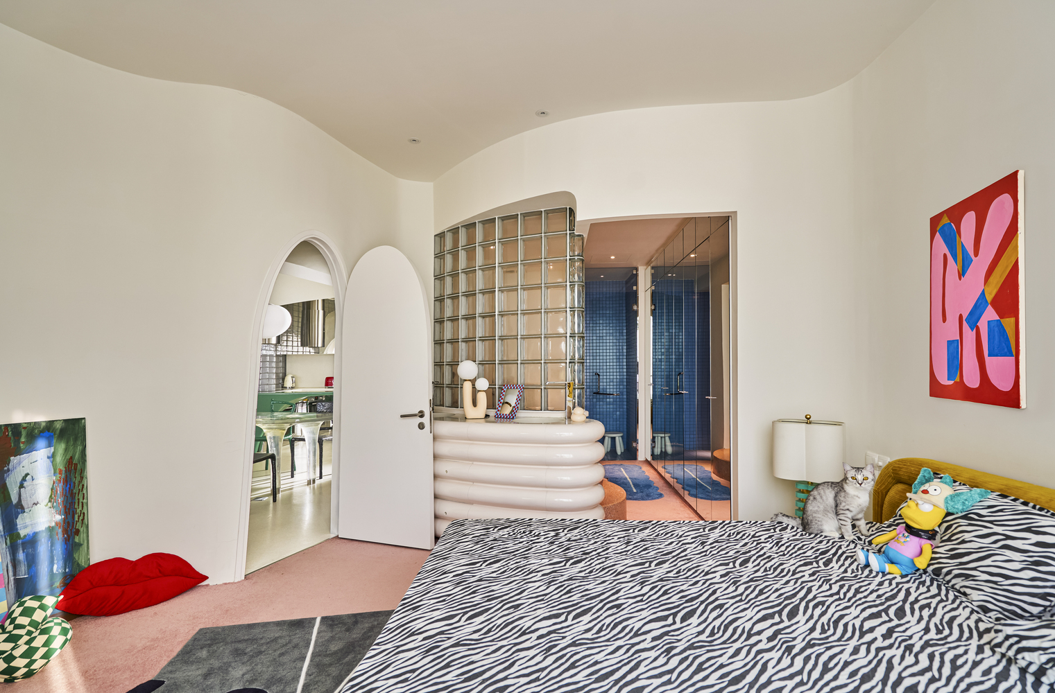 침실 내부는 개방감이 돋보이는 구조로, 침실과 욕실이 문의 경계 없이 부드러운 곡선과 은은한 유리 파티션으로만 구분되어 있다. 창문이나 발코니로의 접근 역시 단조로운 직선을 피하고 유려한 곡선으로 처리되어 공간에 부드러움을 더한다. 노란색 침대 프레임과 얼룩말 무늬 침구의 대비는 공간에 재미와 개성을 불어넣는다.