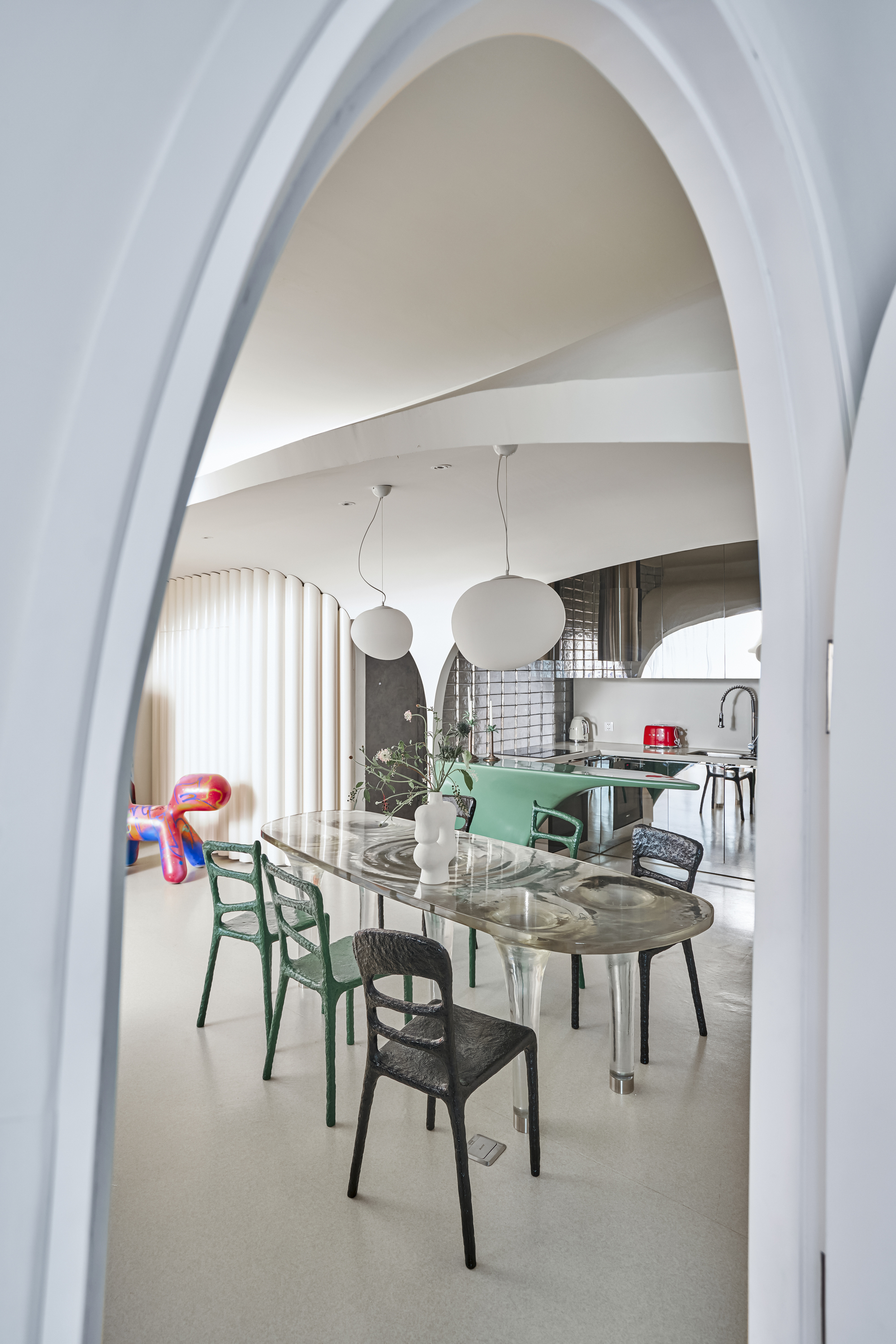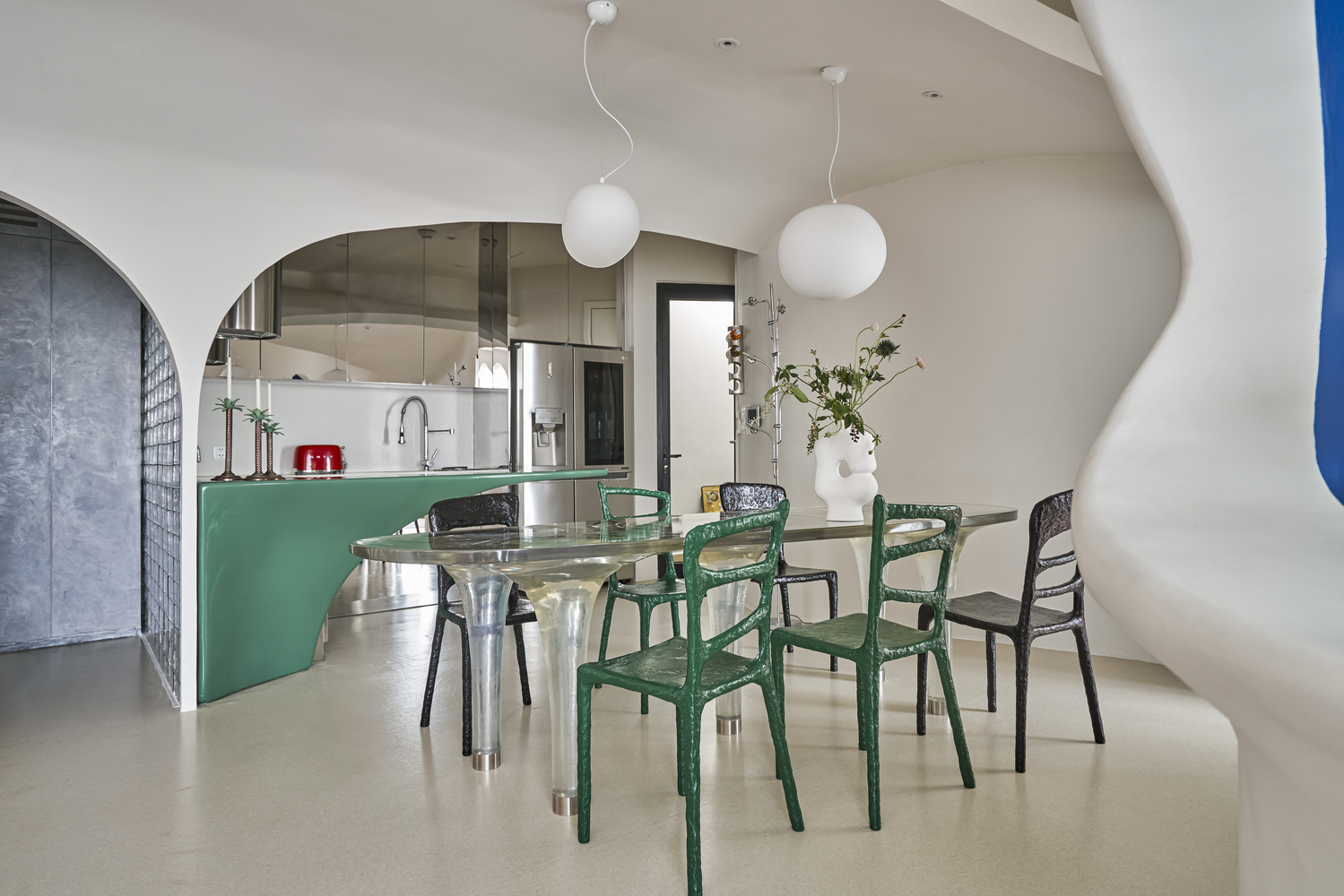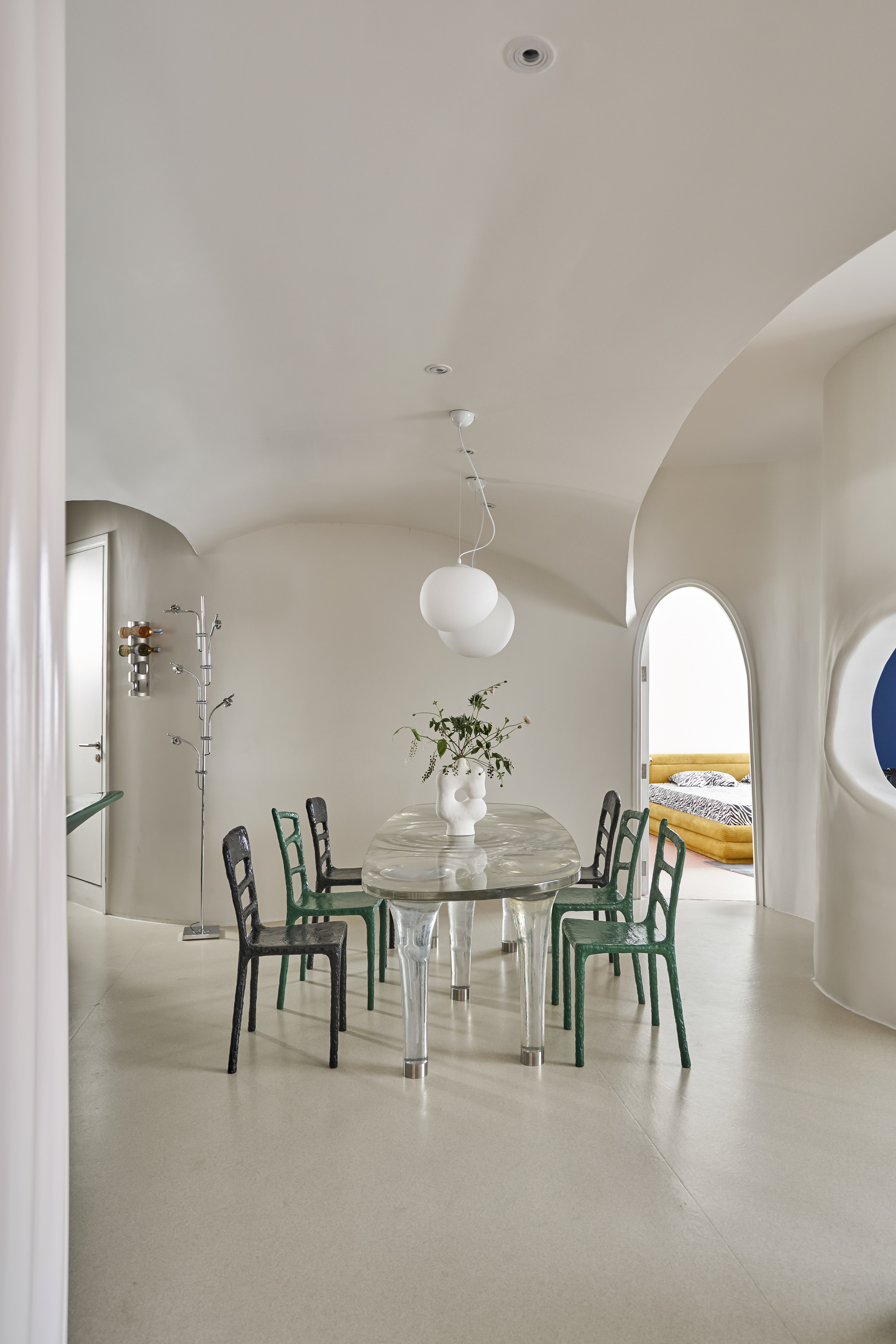 작은 동굴의 다른 쪽, 입구 근처에는 주방과 식사 공간이 트인 형태로 펼쳐진다. 이 구역의 정체성을 완성하는 것은 민트빛 아크릴로 도장된 녹색과 스테인리스 스틸의 조화로, 복고풍과 현대적 감각이 절묘하게 어우러진 가구들이다. 물의 흐름에서 영감을 받은 레진 소재 식탁은 빛이 비칠 때마다 맑은 물결이 일렁이는 듯한 환상적인 효과를 연출한다.
