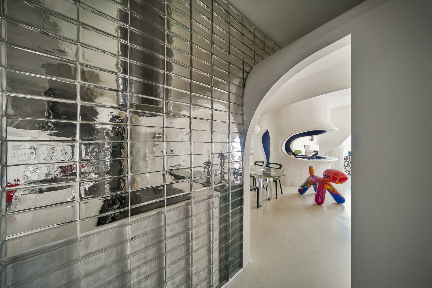 아파트의 중심에는 더 작은 동굴이 자리잡고 있다. 이곳은 작업 공간이자 시선을 사로잡는 초점이 되는 곳으로, 파란색 내부가 특징적이다. 거주자의 음악 작업을 위한 이 공간은 때로는 파티의 중심이 되어 활기를 불어넣는다. 이 중심 공간을 기준으로 아파트의 다른 영역들이 방사형으로 펼쳐진다.