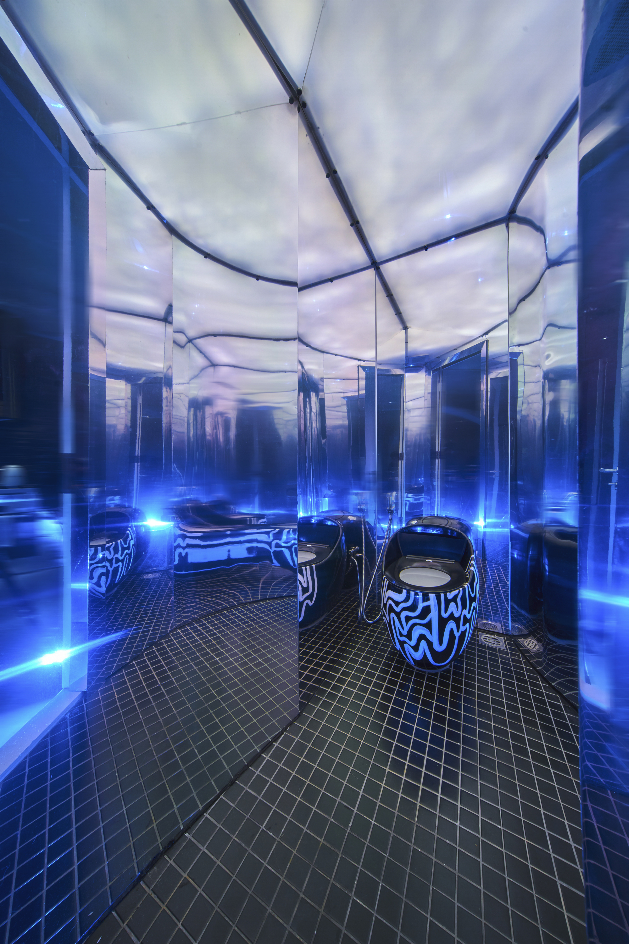 Inside the bedroom, the space opened bedroom, bathroom connected without door and only separated by curves or glass wall. Windows or balcony access are covered by curves to get rid of those common straight lines. Many colors have been used in this apartment from the furniture, and many shapes in the design languages Retro, Retro Future, Space-Age.