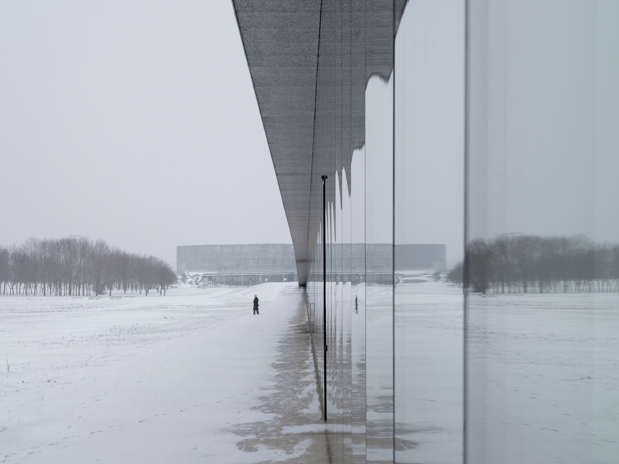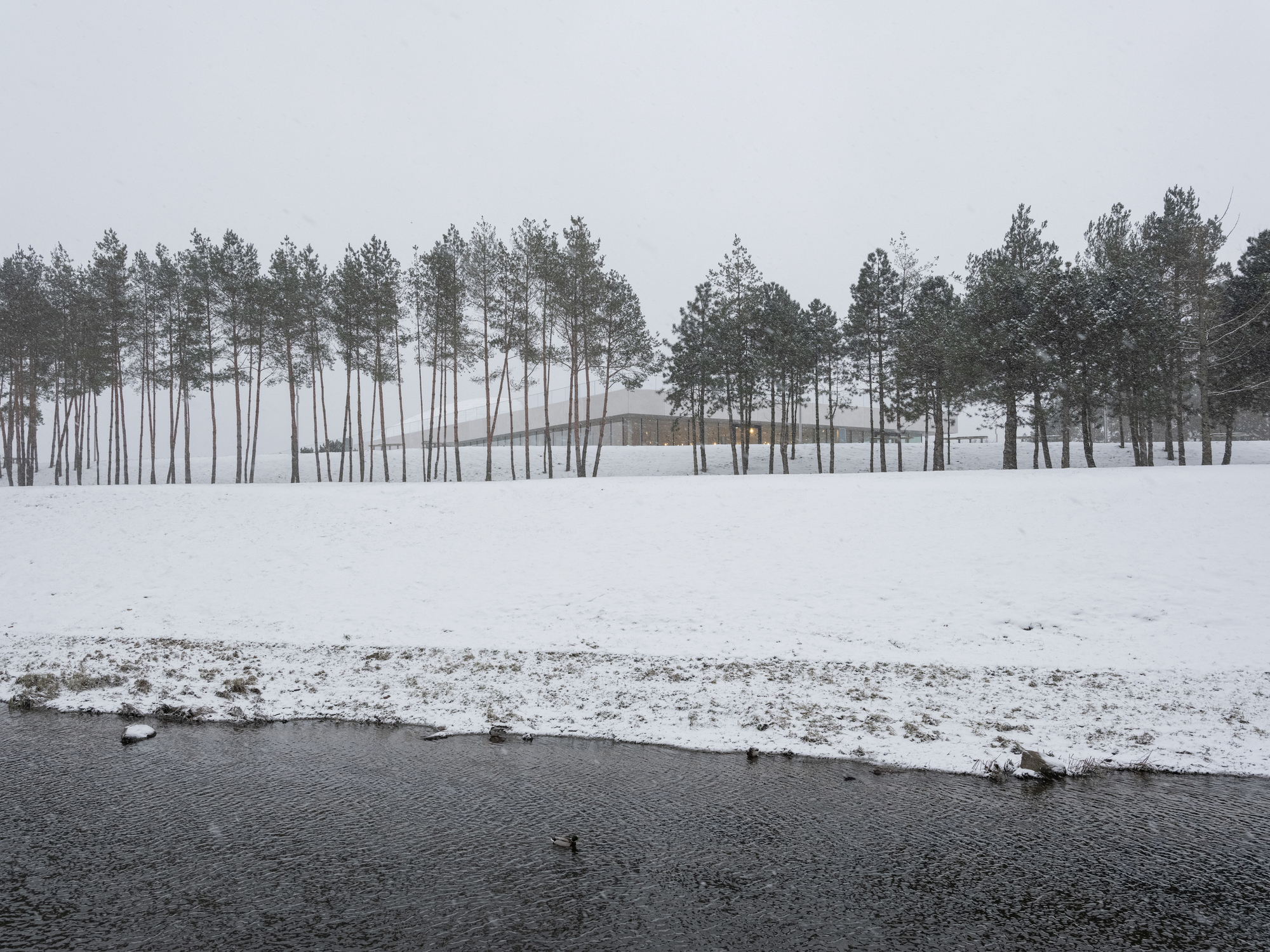이 건물은 공원 속에 자리 잡은 수평적 구조물로, 거대한 콘크리트 매스가 아닌 땅과 하늘 사이의 대화를 이끌어내는 매개체로 기능한다. 야간 이미지에서 확인할 수 있듯, 길게 뻗은 유리 파사드는 내부의 따스한 빛을 외부로 발산하며 밤의 풍경에 새로운 층위를 더한다.