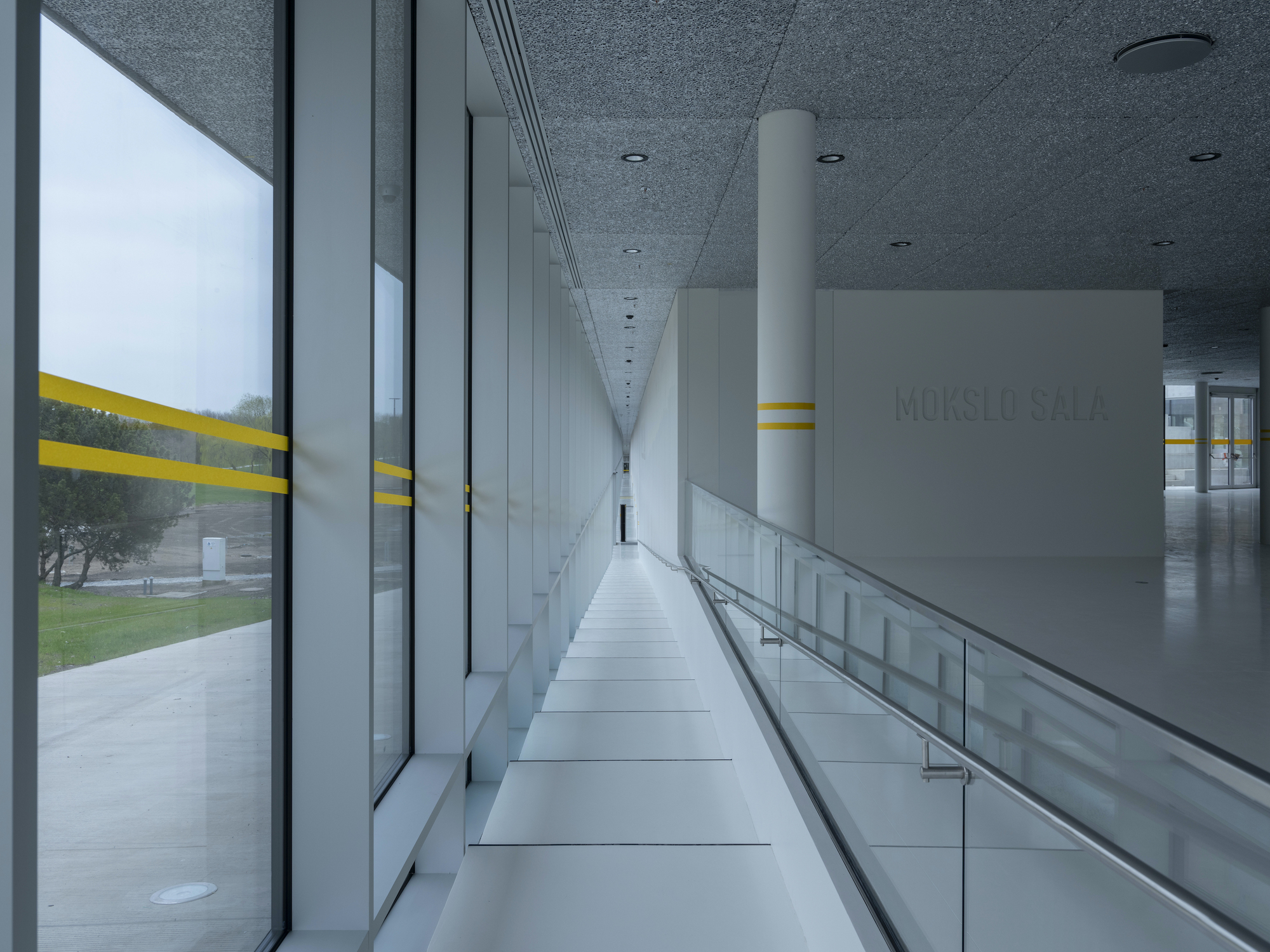 The existing landscape shapes the Innovation Centre, with the roof hosting native vegetation and featuring a sloping and reflective upper disk. This distinctive landmark, capable of reflecting the landscape and natural light into the building and artificial light from the building at night, will serve as a new sun for Kaunas, evidence that Science is always awake, searching for new answers.