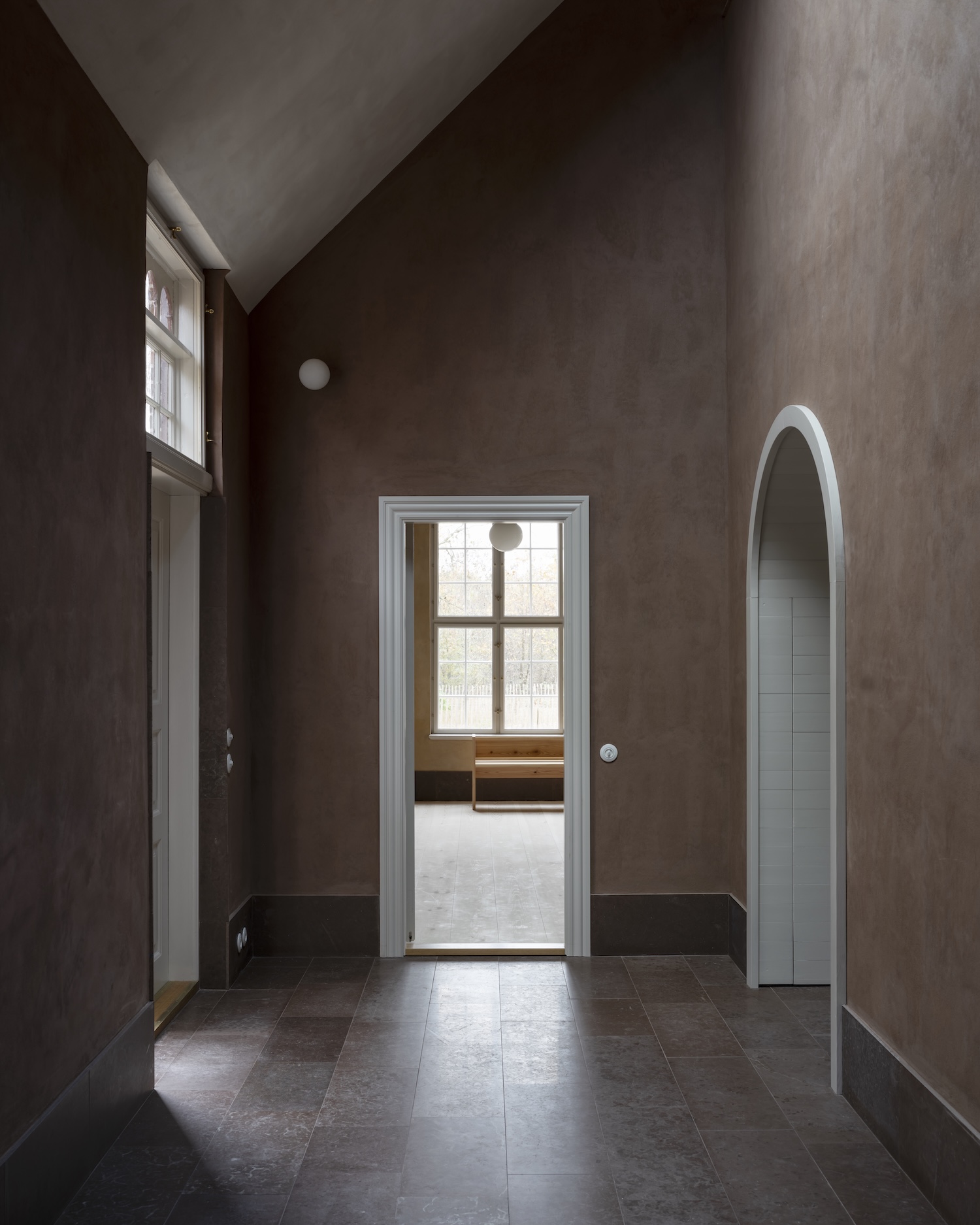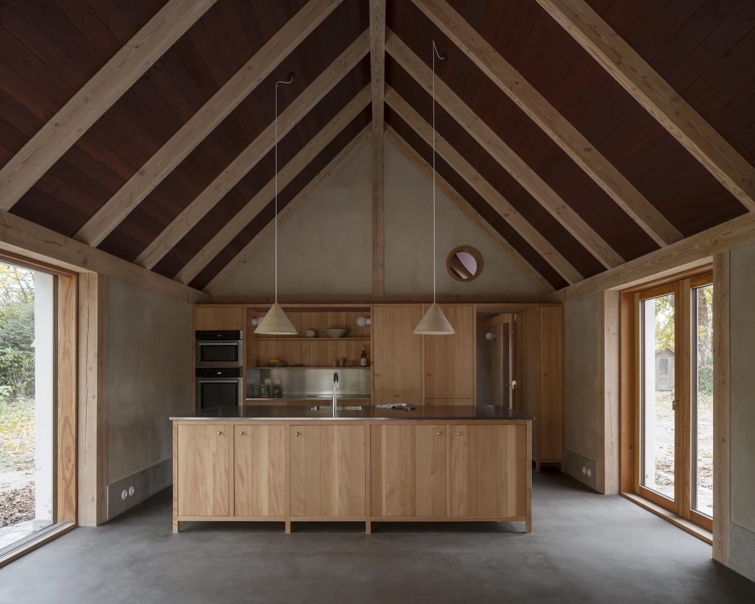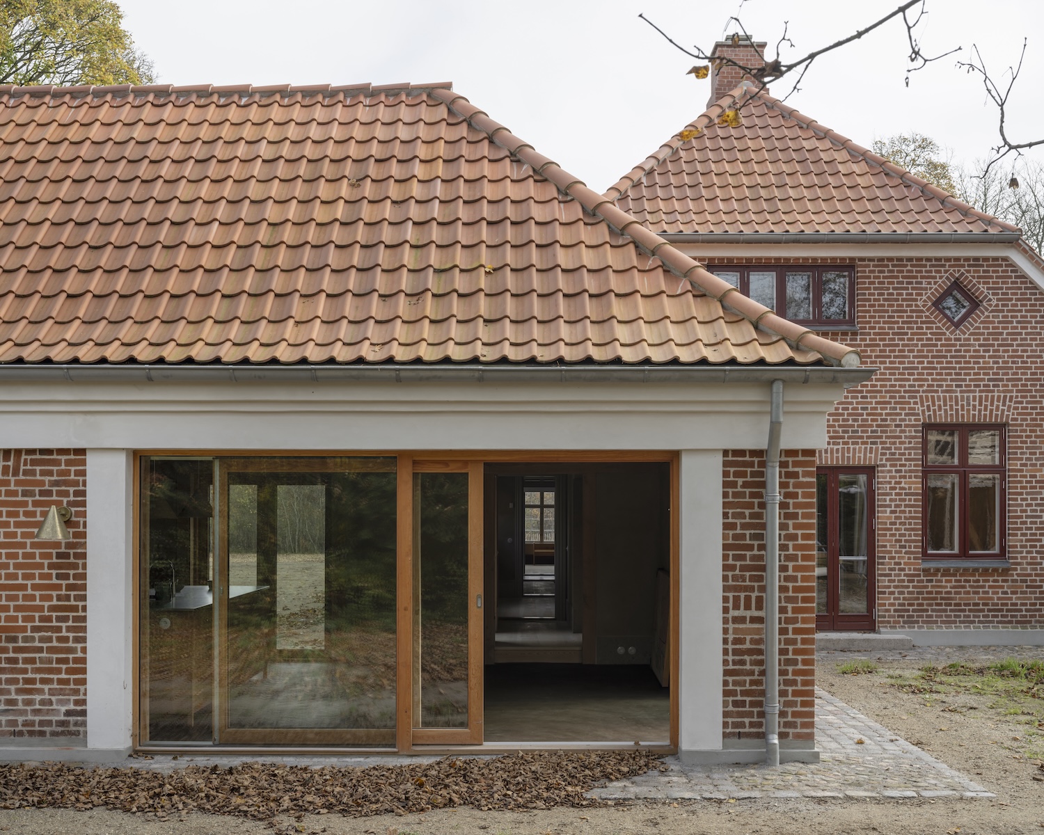 This philosophy of “making good” transforms what might have been a conventional renovation into something far more profound. The project divides its approach between restoration and transformation: the original schoolhouse undergoes careful conservation, while the old garage receives a new internal timber frame set on limecrete foundations a contemporary interpretation of the region’s vernacular “bindingsværk” tradition of half-timbered construction.