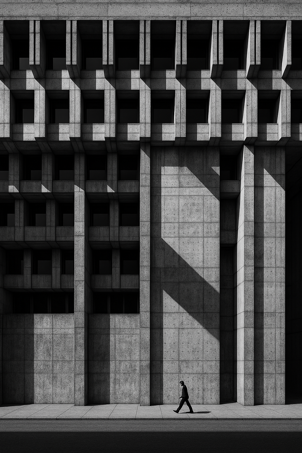 구도는 프레임의 90%를 대칭적인 콘크리트 외관으로 채우며, 거푸집 자국이 보이는 리듬감 있는 모듈식 프리캐스트 패널, 목재 마감 질감, 그리고 뚜렷한 수평 및 수직 구조 요소가 있는 그리드 패턴으로 배열된 노출 골재 부분을 특징으로 합니다. 무거운 콘크리트 프레임에 깊숙이 들어간 창문들이 추가적인 그림자 깊이를 만듭니다. 어두운 정장 차림의 고독한 인물(프레임 높이의 약 1/50 크기)이 외관에 수직으로 하단 1/3 지점 근처를 걸으며, 긴 대각선 그림자를 드리우고 압도적인 규모를 강조하는 동시에 제도적 권력과 개인의 규모에 대한 은유적 해석을 제공합니다.