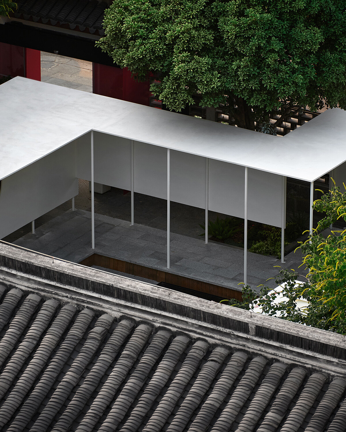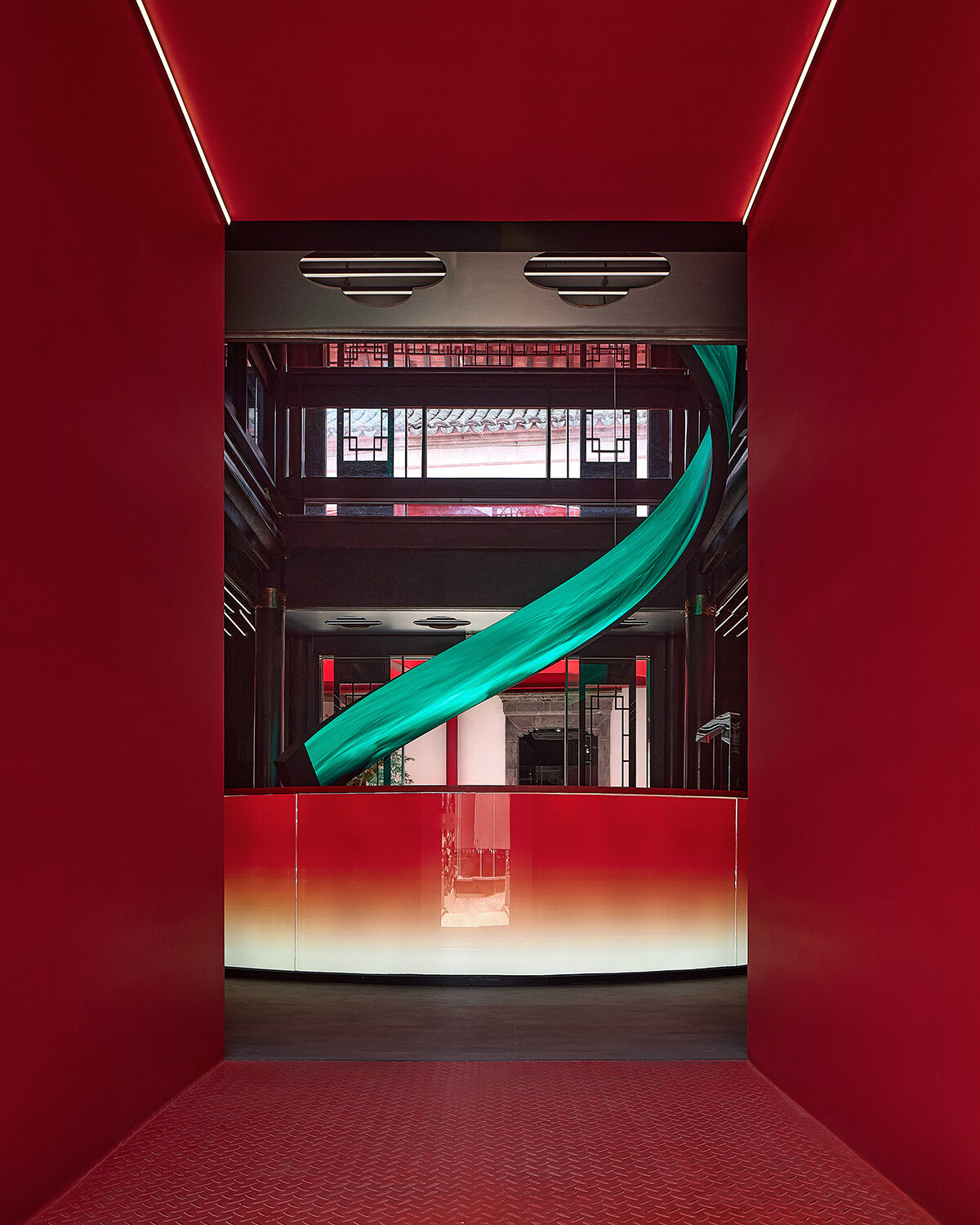 그 결과는 시간대의 복잡한 중첩이다. 과거, 현재, 그리고 추측적 미래가 모두 조화롭게 공존한다. "우리는 현대적 재료를 전통적 스타일과 혼합합니다"라고 양 스저(楊詩哲) 디자이너는 설명한다. 그들은 전통을 모방하지 않고 암시하기 위해 단순화된 형태를 사용한다. 그 효과는 깊게 뿌리내린 친숙함과 예상치 못한 놀라움이 공존하는 경험이다. 해가 움직임에 따라 붉은 계단 위로 그림자가 춤을 추고, 철제 표면에 반사된 빛이 주변 흰 벽에 붉은 빛을 살짝 물들인다. 오래된 전통 건물 사이를 거닐다 갑자기 마주친 이 현대적 요소는 마치 다른 차원으로 통하는 문을 발견한 듯한 신선한 충격을 안겨준다.