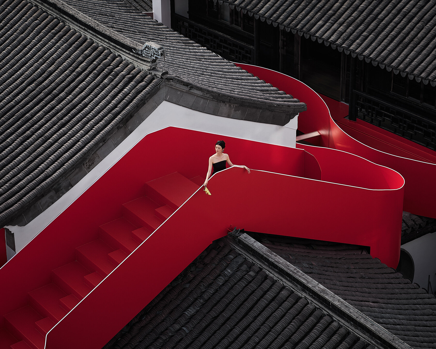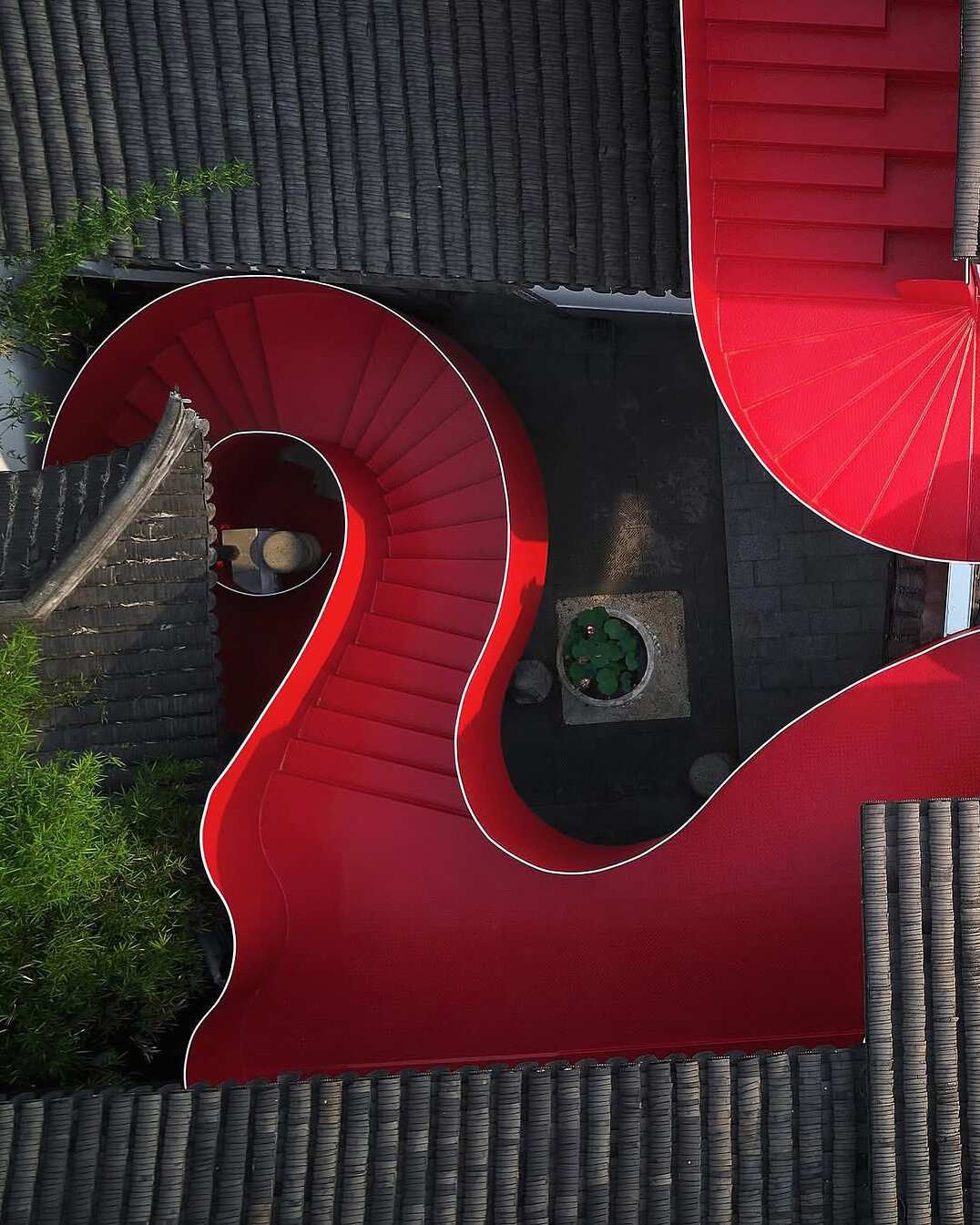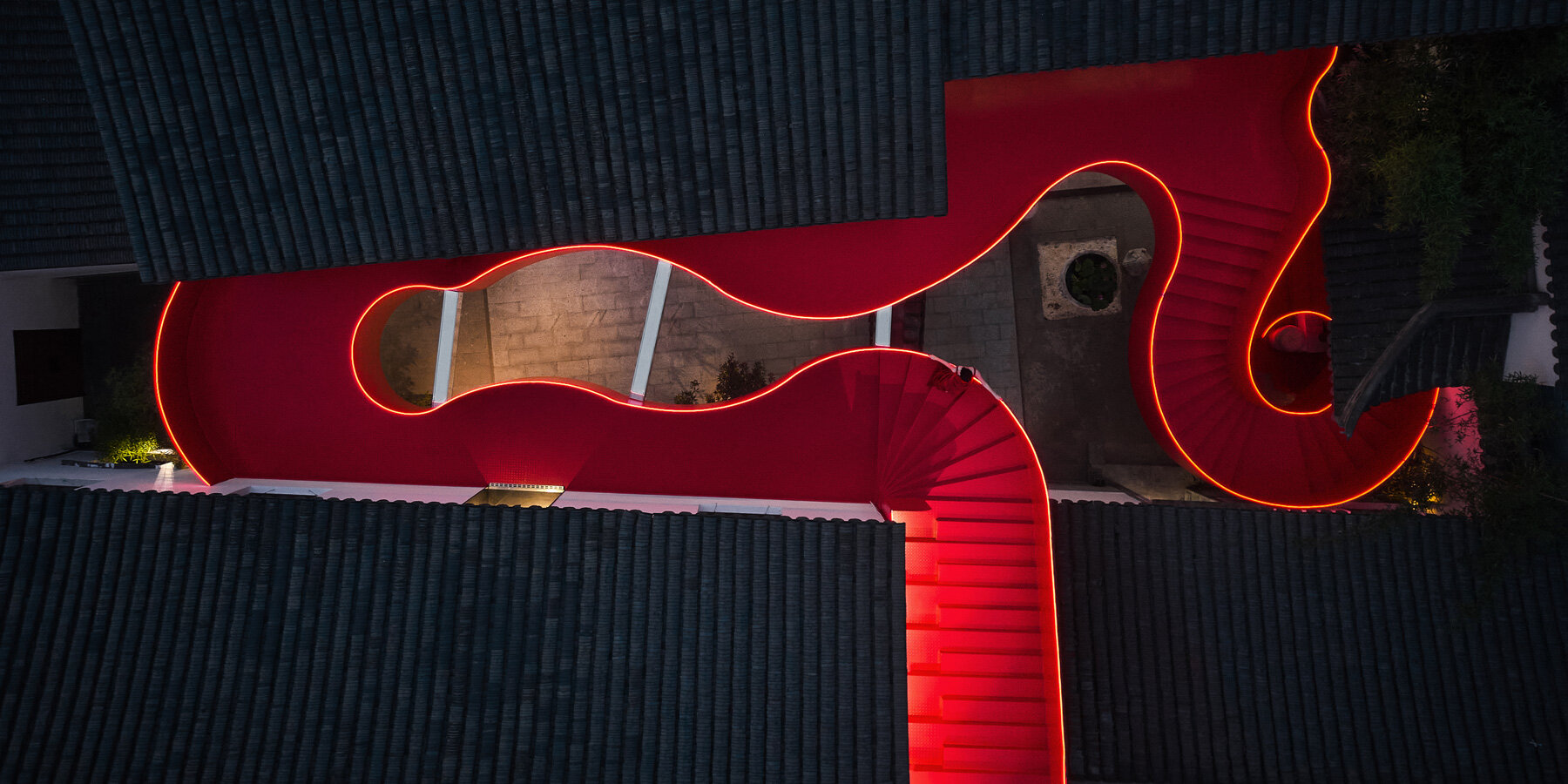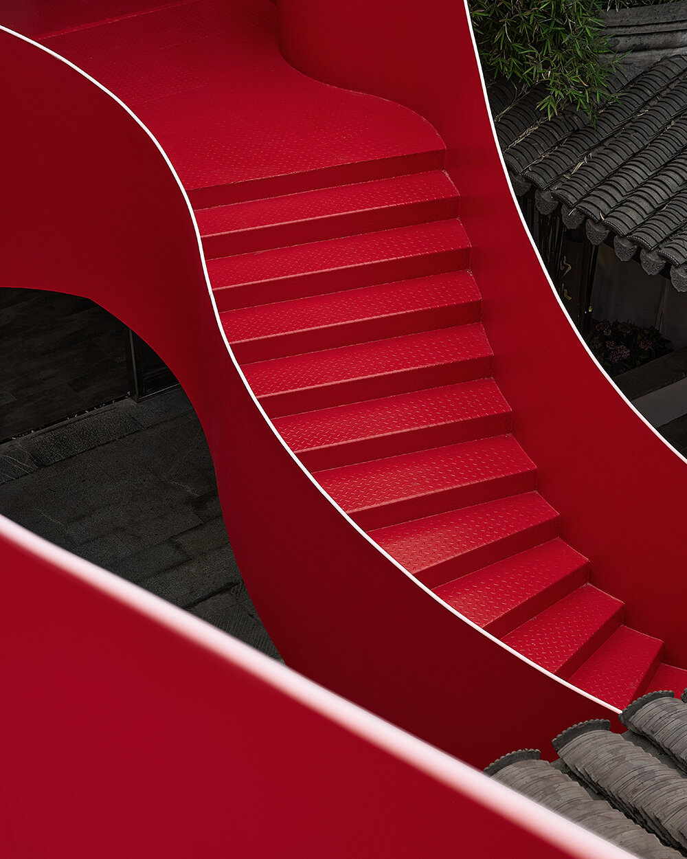 다이 디자인의 레드 랍스터 프로젝트 핵심에는 용이 두루마리를 감싼 듯 지상에서 지붕까지 구불구불 이어지는 붉은 철제 계단이 있다. "계단의 유려한 형태는 보호의 상징인 용을 연상시키며, 밀집된 건축 경관 사이로 흐르며 강렬한 시각적 대비를 만들어냅니다." 보조 디자이너 창 하오이(常浩一)의 설명이다. 선명한 주홍빛은 기와와 흙벽의 차분한 대지색 사이로 생동감 있게 흐른다. 마치 오랜 세월이 만든 고요한 풍경 위에 그려진 생기 넘치는 붓 자국처럼, 이 붉은 계단은 역사적 공간에 활력을 불어넣는다.