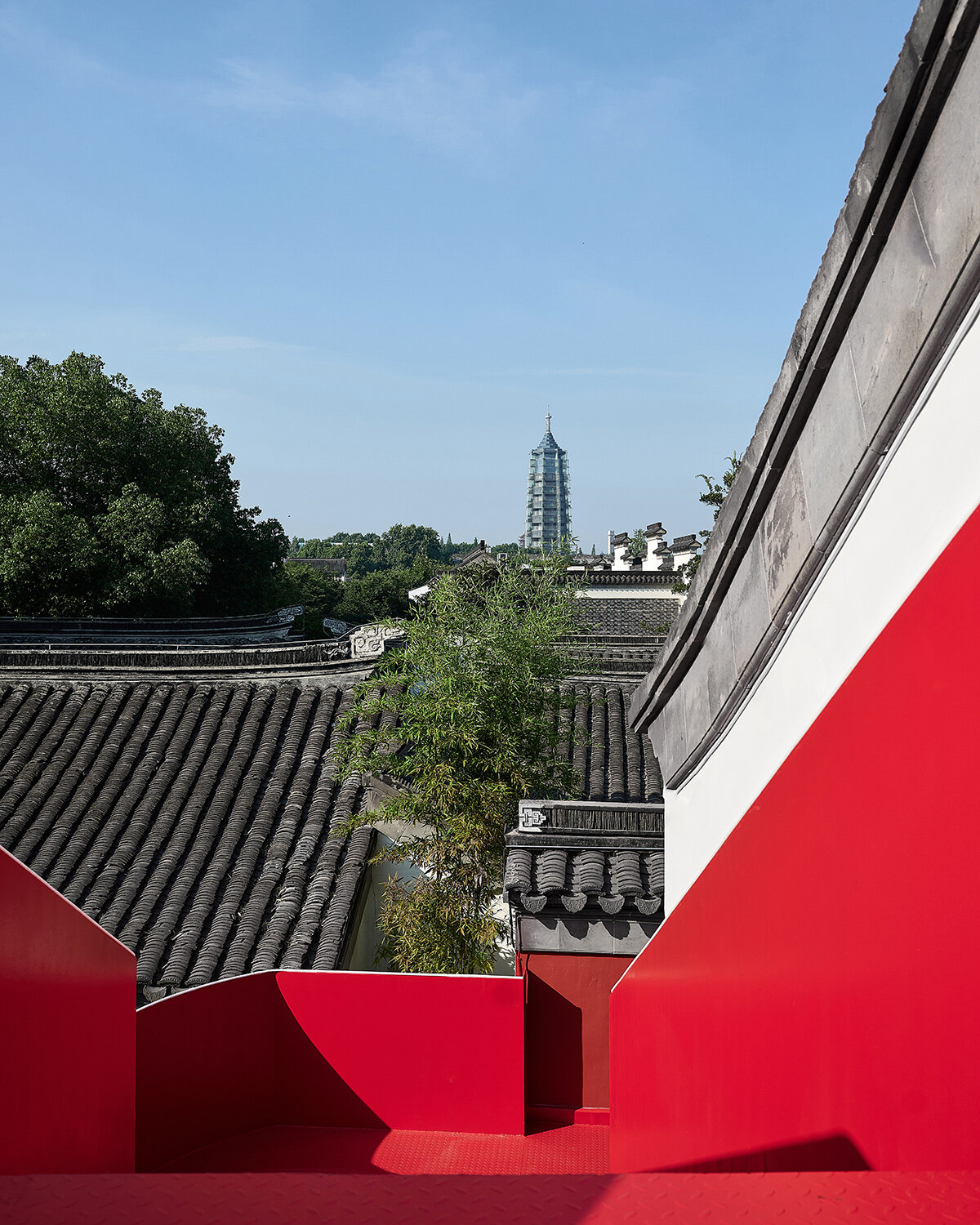 The staircase is not only an aesthetic gesture. ‘Form should serve function,’ say the architects, and this structure lives up to that mantra: linking previously disconnected ‘islands’ of the site, doubling as a fire escape, and offering shelter from rain at the ground level. Along its path, visitors are offered new glimpses of Nanjing’s iconic Dabaoen Temple, an architectural promenade that reveals itself in stages.