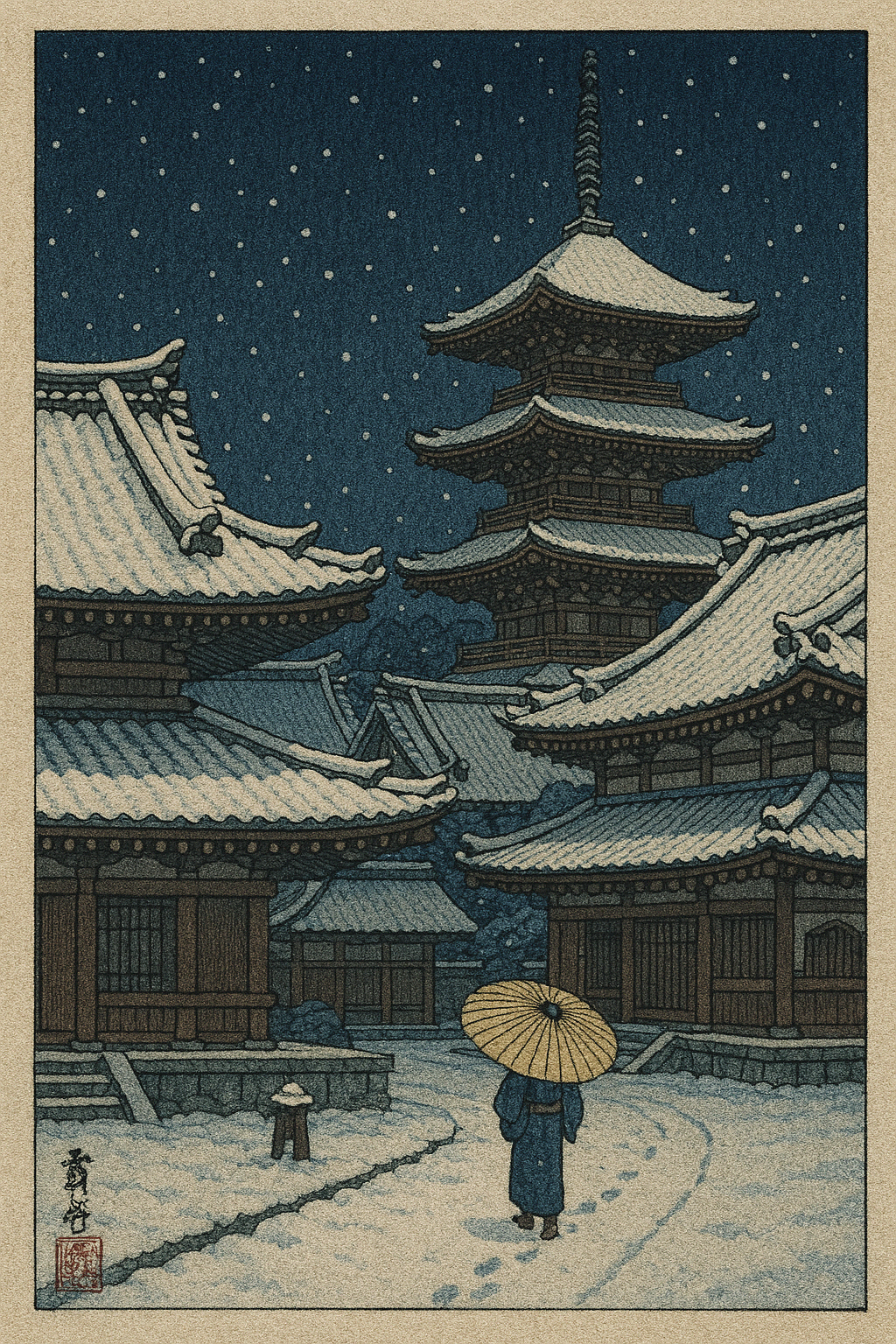 - 의도 분석: 이 프롬프트는 가와세 하스이의 대표적인 겨울 풍경 목판화 스타일을 재현하기 위한 것으로, 일본 전통 건축물의 정교한 묘사, 눈 내리는 밤의 고요한 분위기, 그리고 신-하스이 목판화의 기술적 특성을 모두 담고자 합니다. 특히 하스이의 특징인 서양 원근법과 일본 전통 미학의 조화, 제한된 색 팔레트를 통한 감성 표현, 인물과 건축물/자연의 규모 대비를 통한 서정성을 강조하고 있습니다.