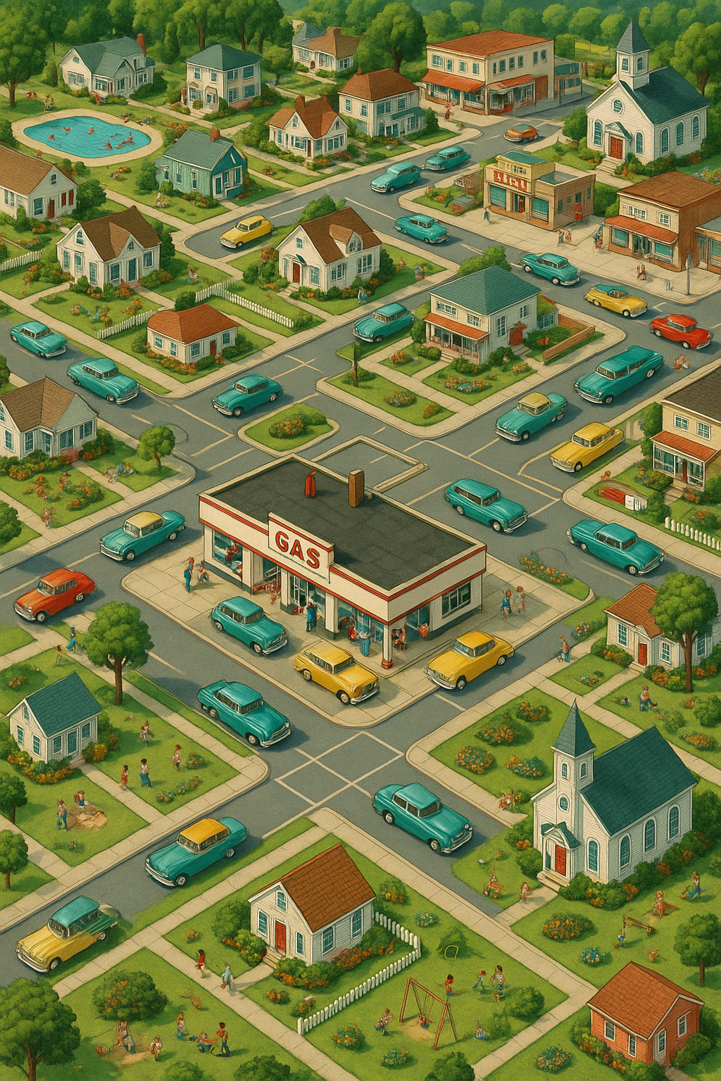 - 한줄요약 (영어): Bird's eye view illustration of a 1950s American suburban neighborhood with gas station, colorful vintage cars, and traditional houses in warm nostalgic style