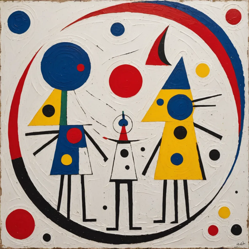 Joan Miró, surrealism, abstract figures, primary colors, geometric shapes, circles, triangles, black lines, textured background, symbolic elements, playful composition