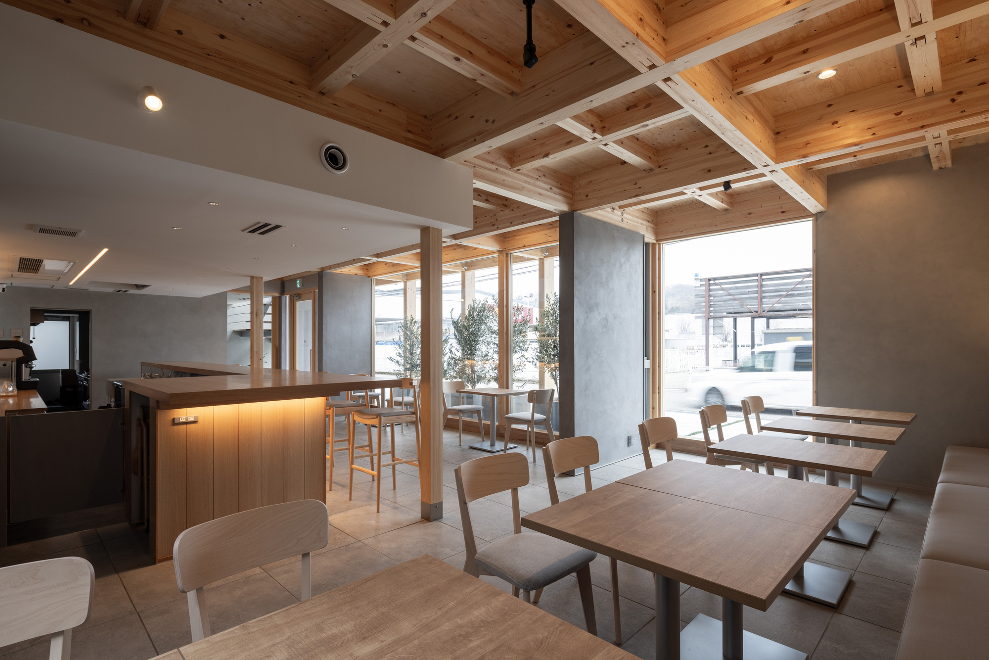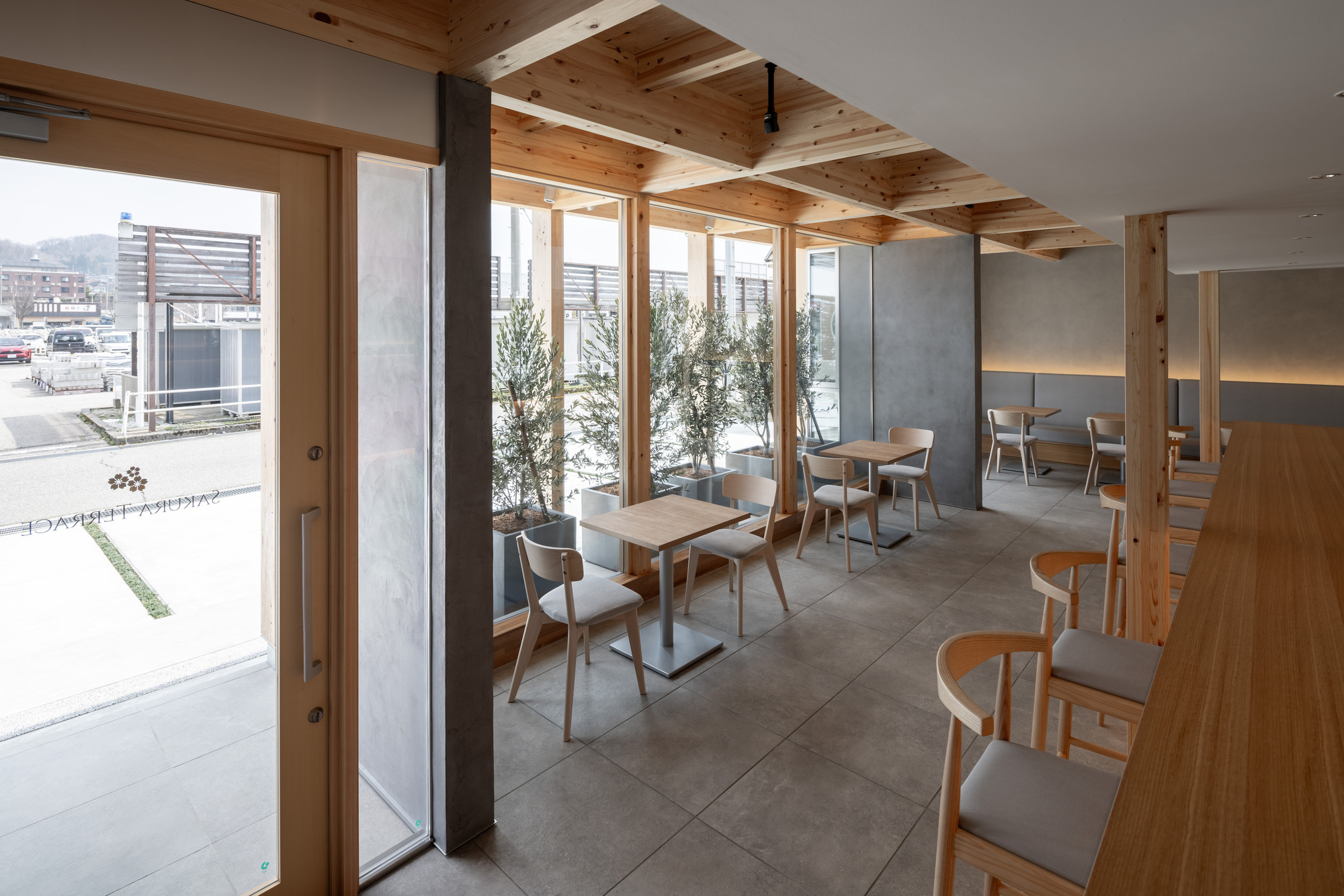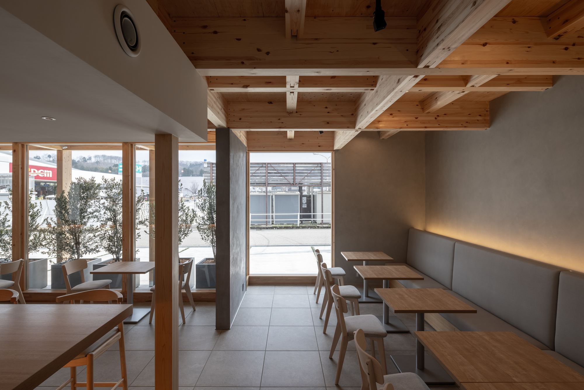 이 프로젝트는 획일화된 상업적 디자인 코드에서 과감히 벗어나 자연 환경의 일부로 재해석함으로써, 방문객들이 도시 한복판에서도 자연의 편안함을 느끼며 여유로운 시간을 보낼 수 있는 공간을 창출한다. 카페 내부에 배치된 테이블과 의자, 벤치 등의 가구들 역시 목재로 제작되어 전체적인 디자인 언어와 일관성을 유지한다.