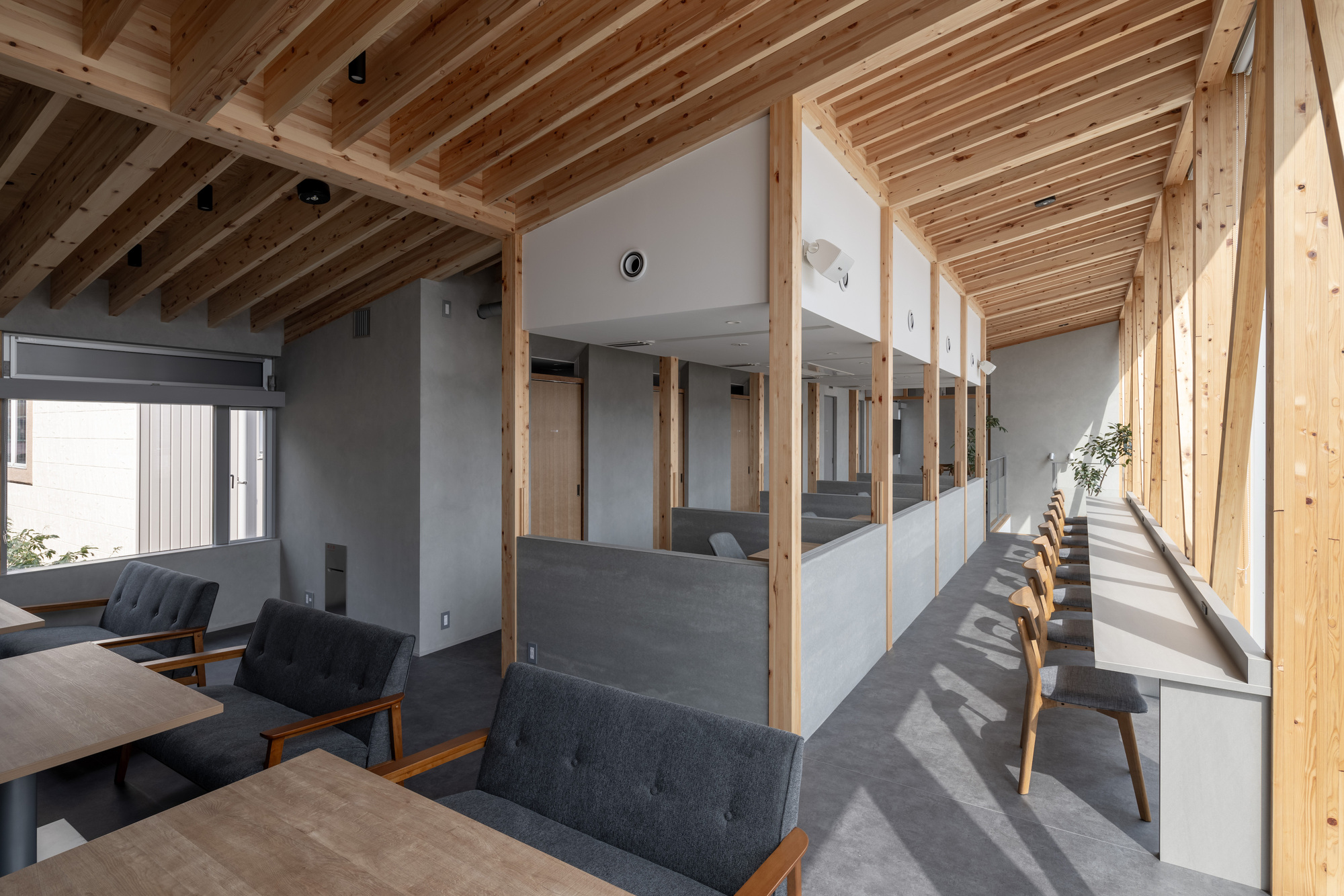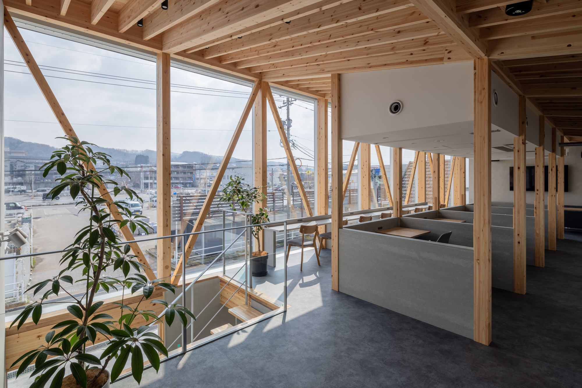 Entering the building from the entrance, the ceiling is covered with a powerful structure like the large branches supporting a large tree. Aside from the wood, the background is a monotone of white and gray, enhancing the abstraction of the structural frame. Upon going up to the second floor, the branches become more subdivided and lighter.