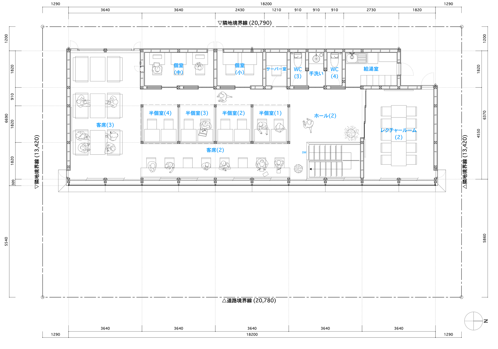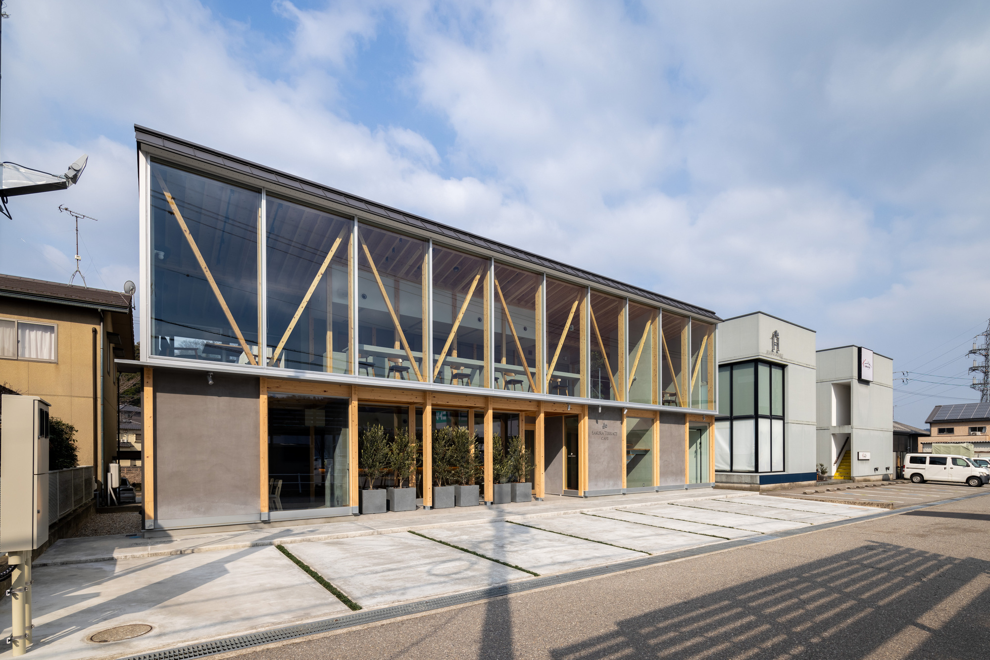 This is a plan for a café that will be built in the middle of town and open to the local community. The client wanted to create a place where local people can easily visit and improve their own brand through this building. The construction site is in the middle of the hustle and bustle of a regional city lined with large facilities, in a chaotic corner of the town where commercial and industrial atmospheres mix together. In this somewhat cold, dry urban environment that lacks naturalness, the architect thought that architecture with the strength to express its existence as it is could create a lively state and place in this place.