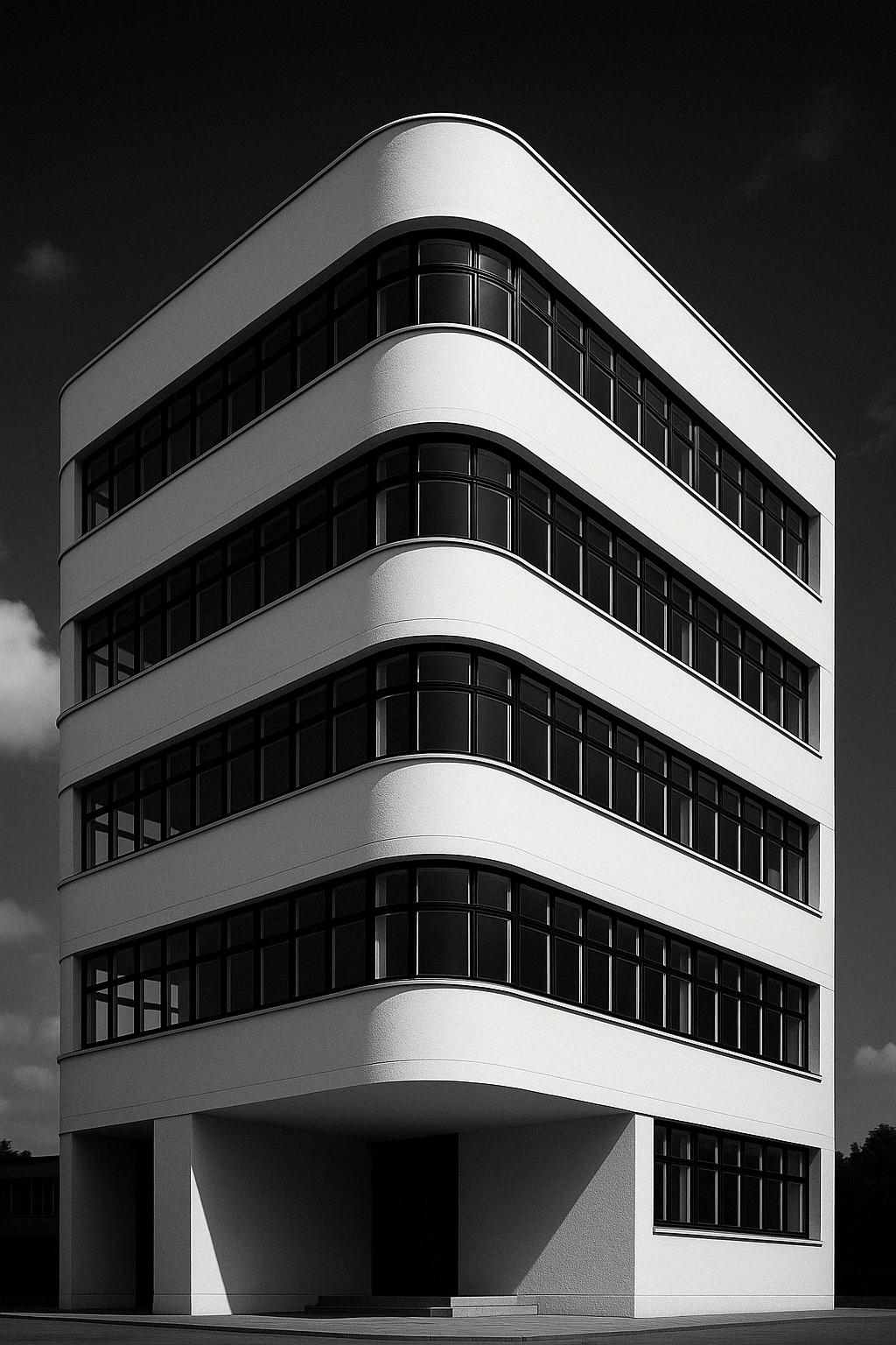 #ModernistArchitecture #BauhausStyle #InternationalStyle #ArchitecturalPhotography #BlackAndWhite #MediumFormat #HighContrast #RibbonWindows #CurvedCorners #Cantilevered #GeometricForms #DramaticLighting #MinimalistArchitecture #ArchitecturalAbstraction #TiltShift #HasselbladvCamera #KodakTriX #ArchitecturalGeometry #SculpturalArchitecture #ShadowPattern