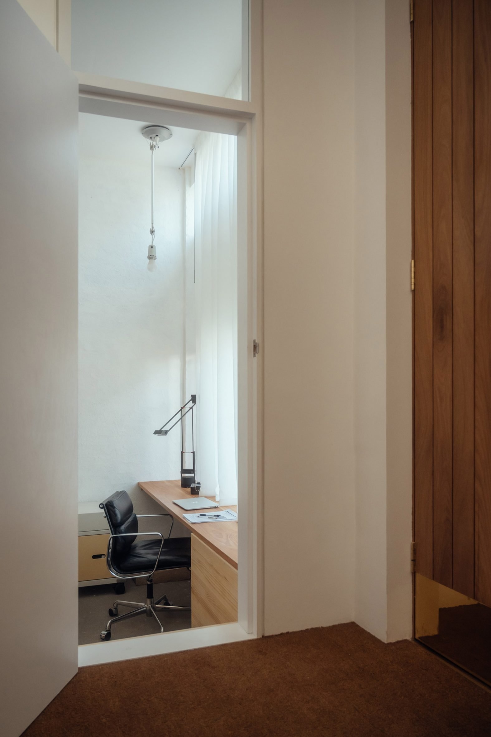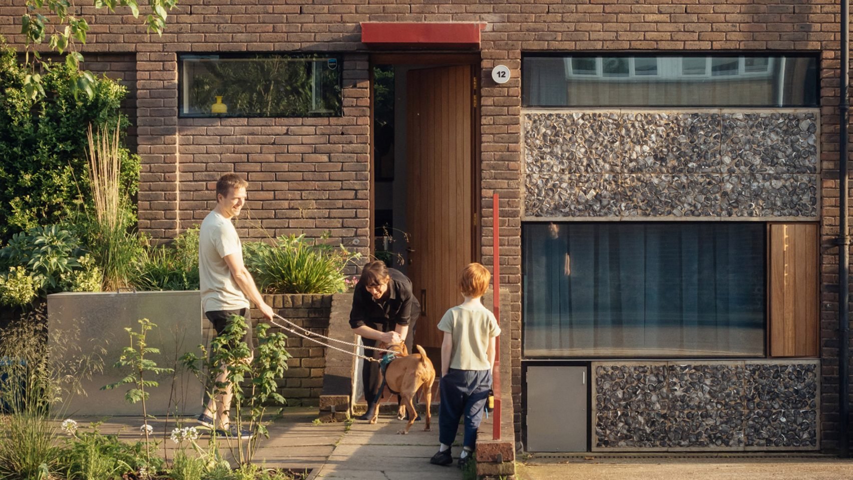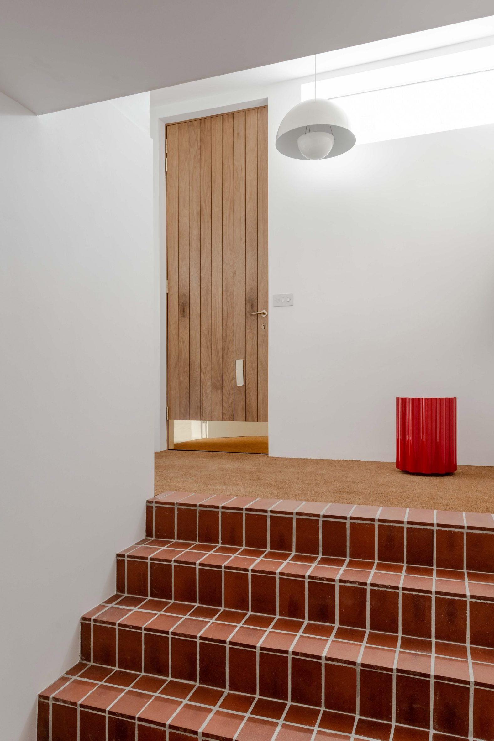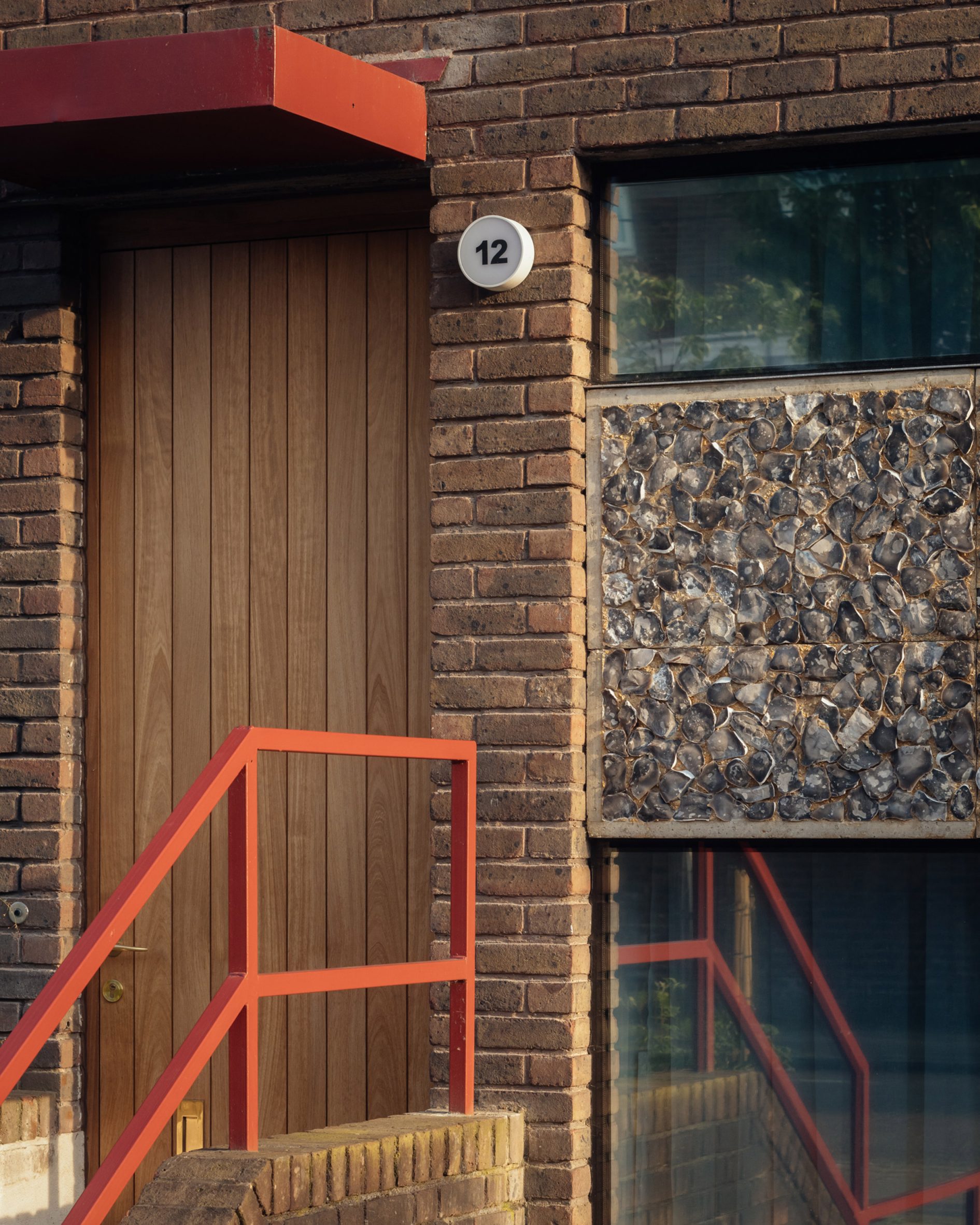 At the Elemental House's entrance, a tall wooden door framed by a red steel handrail and lintel stands alongside a former garage, which has been converted into a slightly sunken bedroom.
