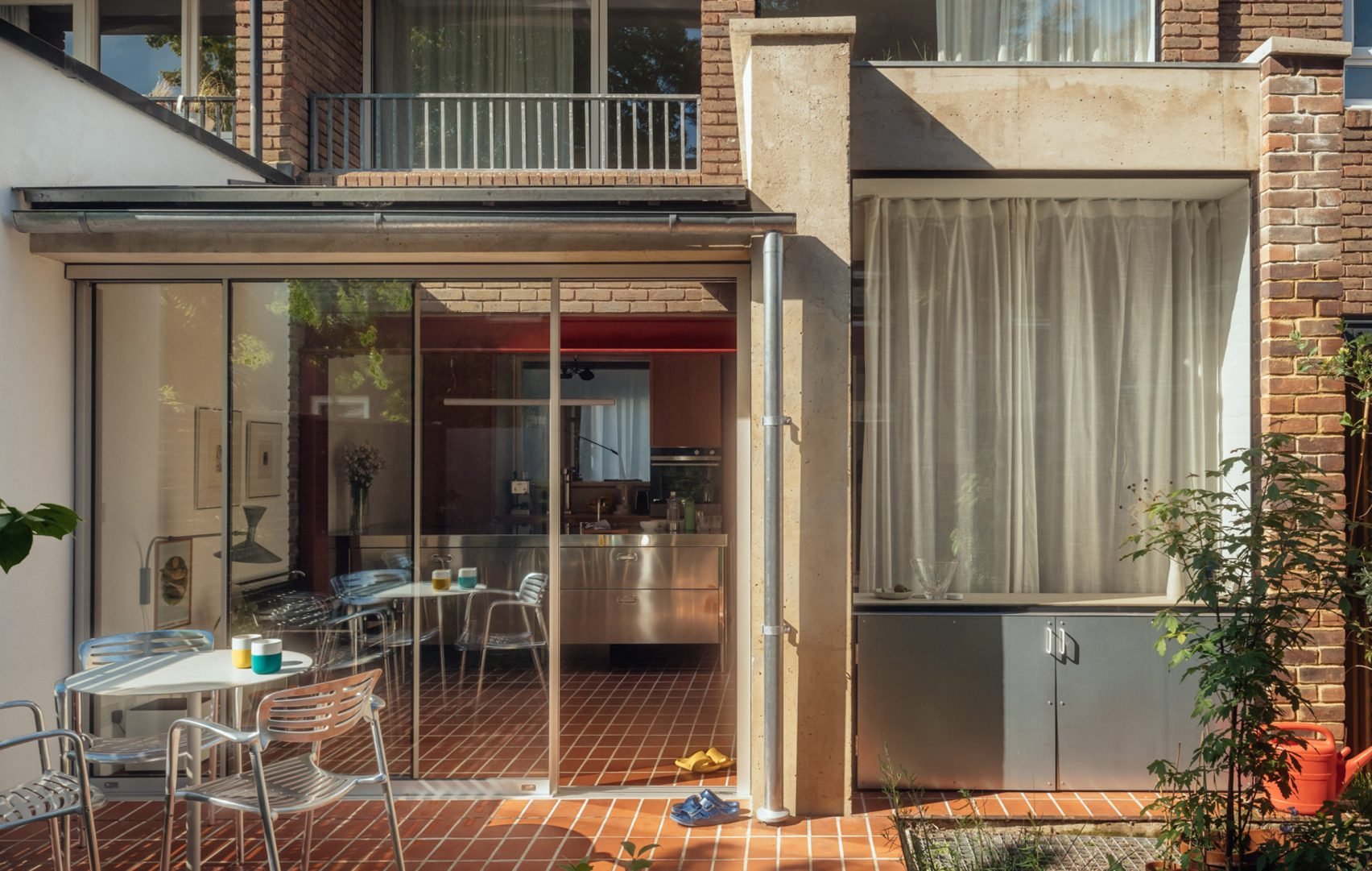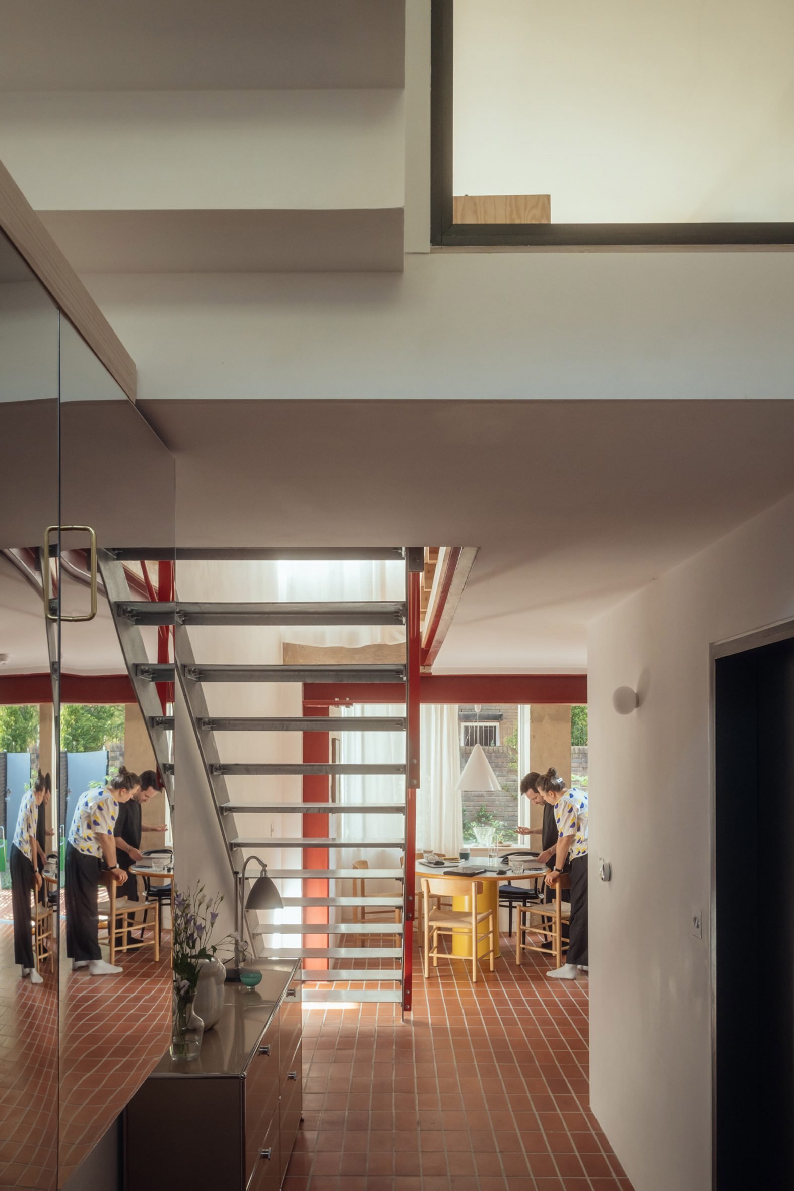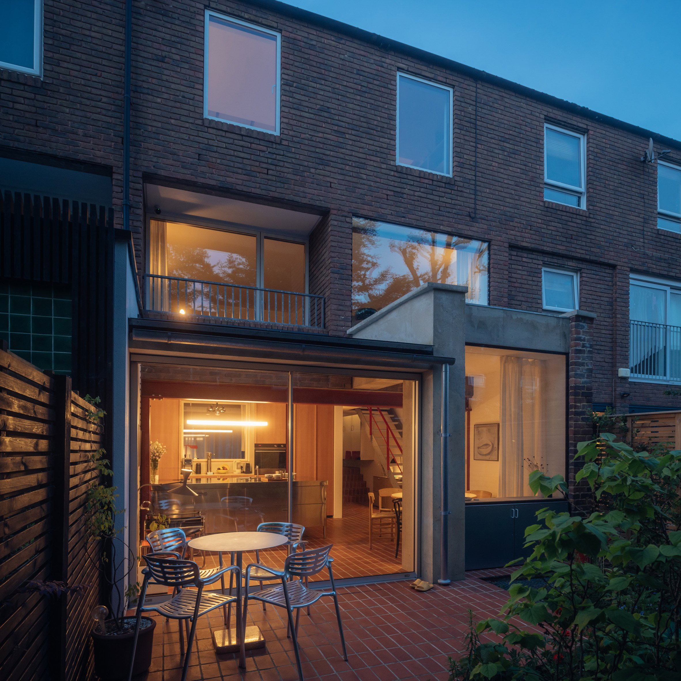 붉은 강철 포털 프레임은 기존 주택과 콘크리트 확장부가 만나는 경계를 명확하게 표시한다. 미닫이 유리문은 테라코타 바닥 타일로 내부와 유기적으로 연결된 남쪽의 정원 테라스로 열린다. 이러한 설계는 내·외부 공간의 자연스러운 연속성을 만들어내며, 한국 전통 건축에서 볼 수 있는 '안과 밖의 조화로운 흐름'을 현대적으로 재해석한 듯한 느낌을 준다.